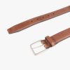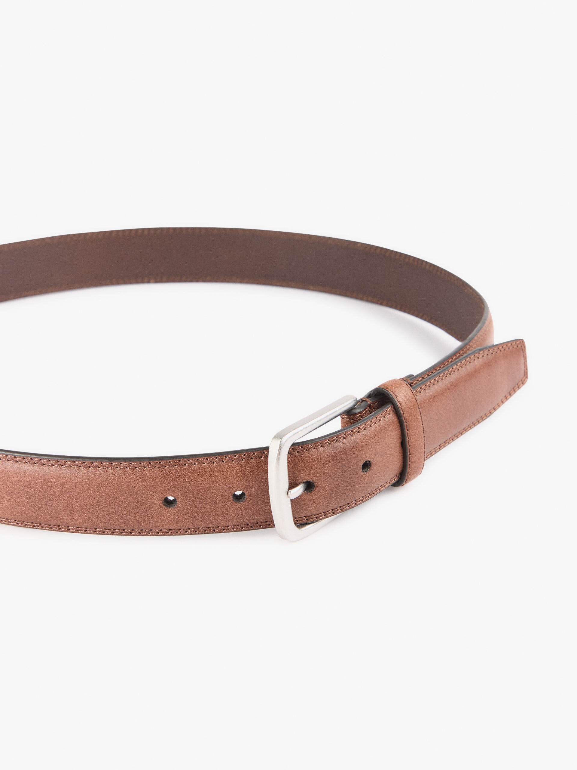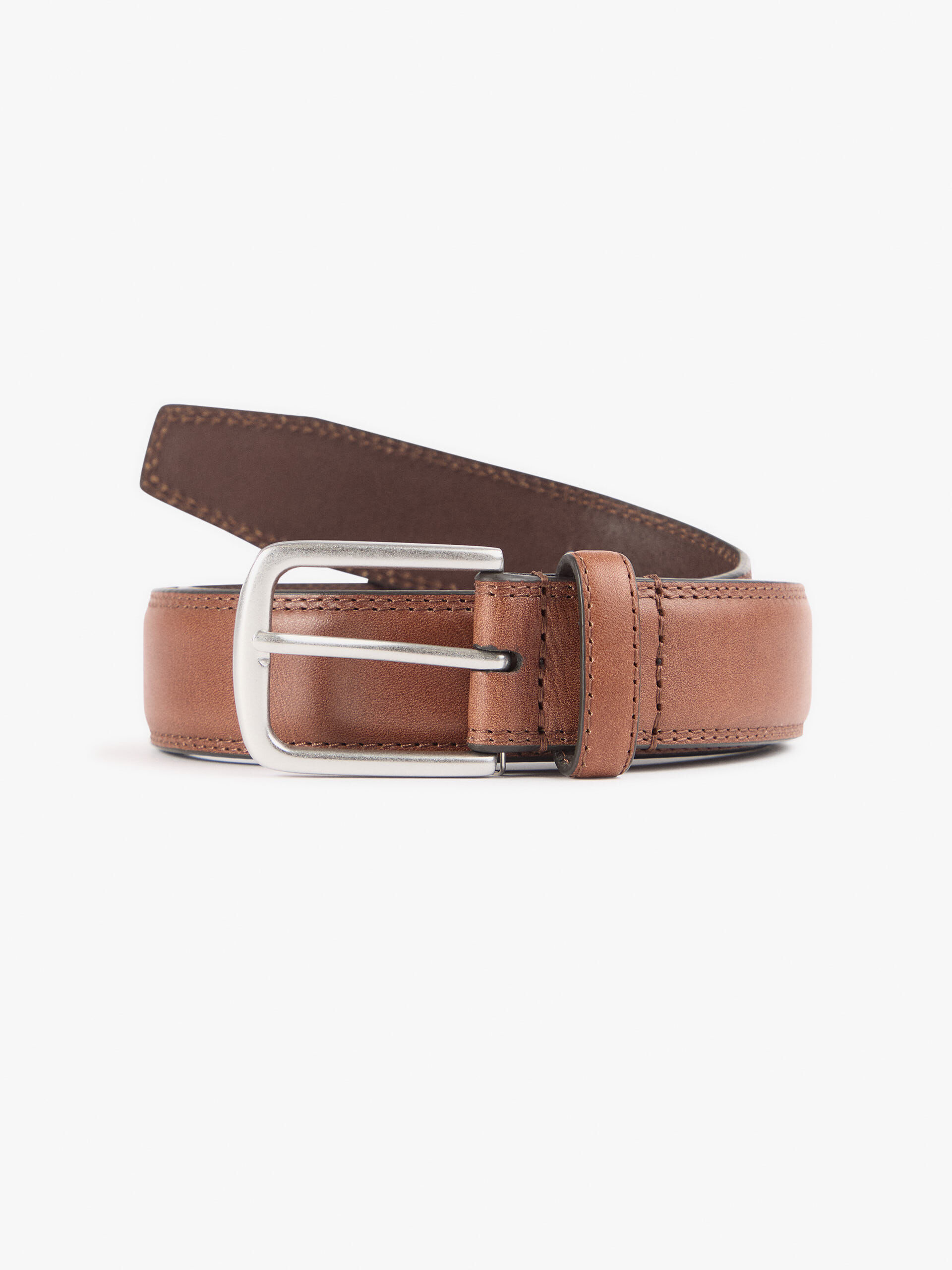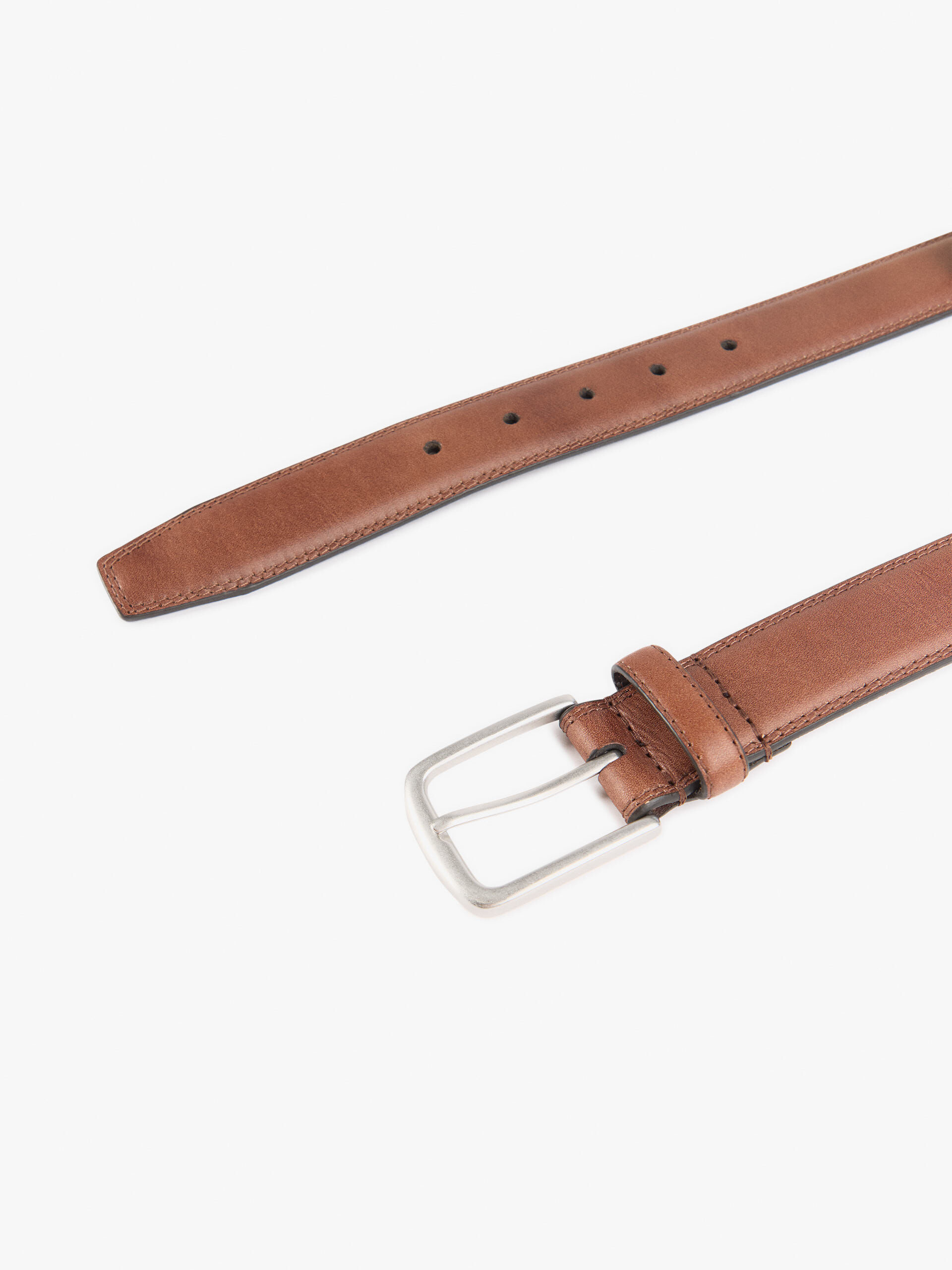Cinturón liso estilo casual confeccionado en piel con cierre mediante hebilla metálica a contraste y pasador al tono. Detalles y pespuntes al tono.