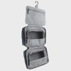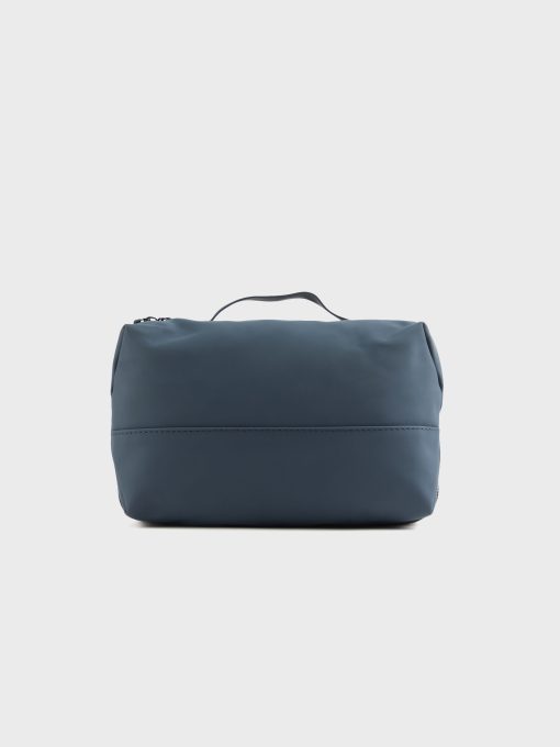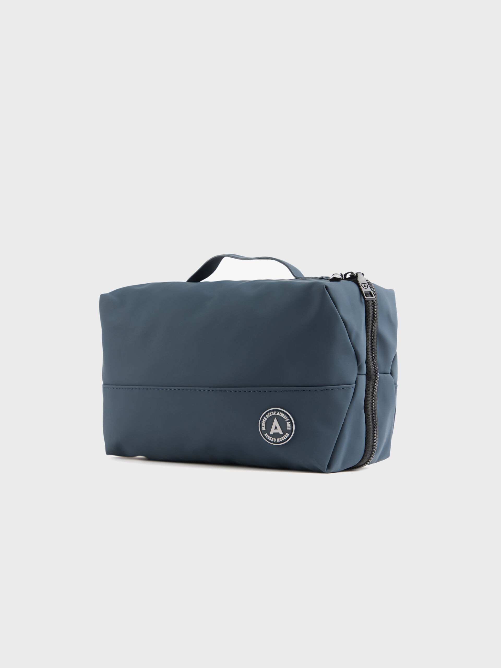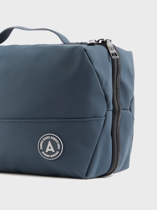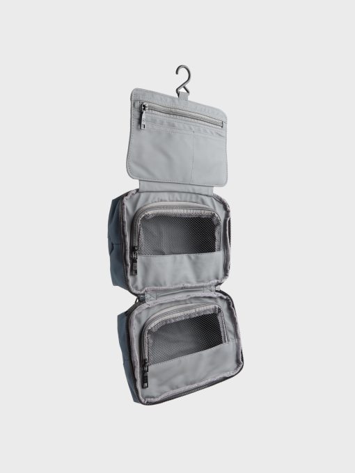 Neceser con asa para transporte y logo grabado en el frontal. Compartimento principal con cierre exterior mediante cremallera. Interior compuesto por tres compartimentos con cierre de cremallera y dos de ellos con rejilla. Percha para colgar el neceser.