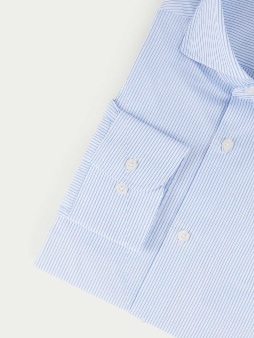 Camisa de vestir a rayas de corte slim fit. Cuenta con cuello italiano, manga larga con puños simples y logo de la marca grabado en el frontal.