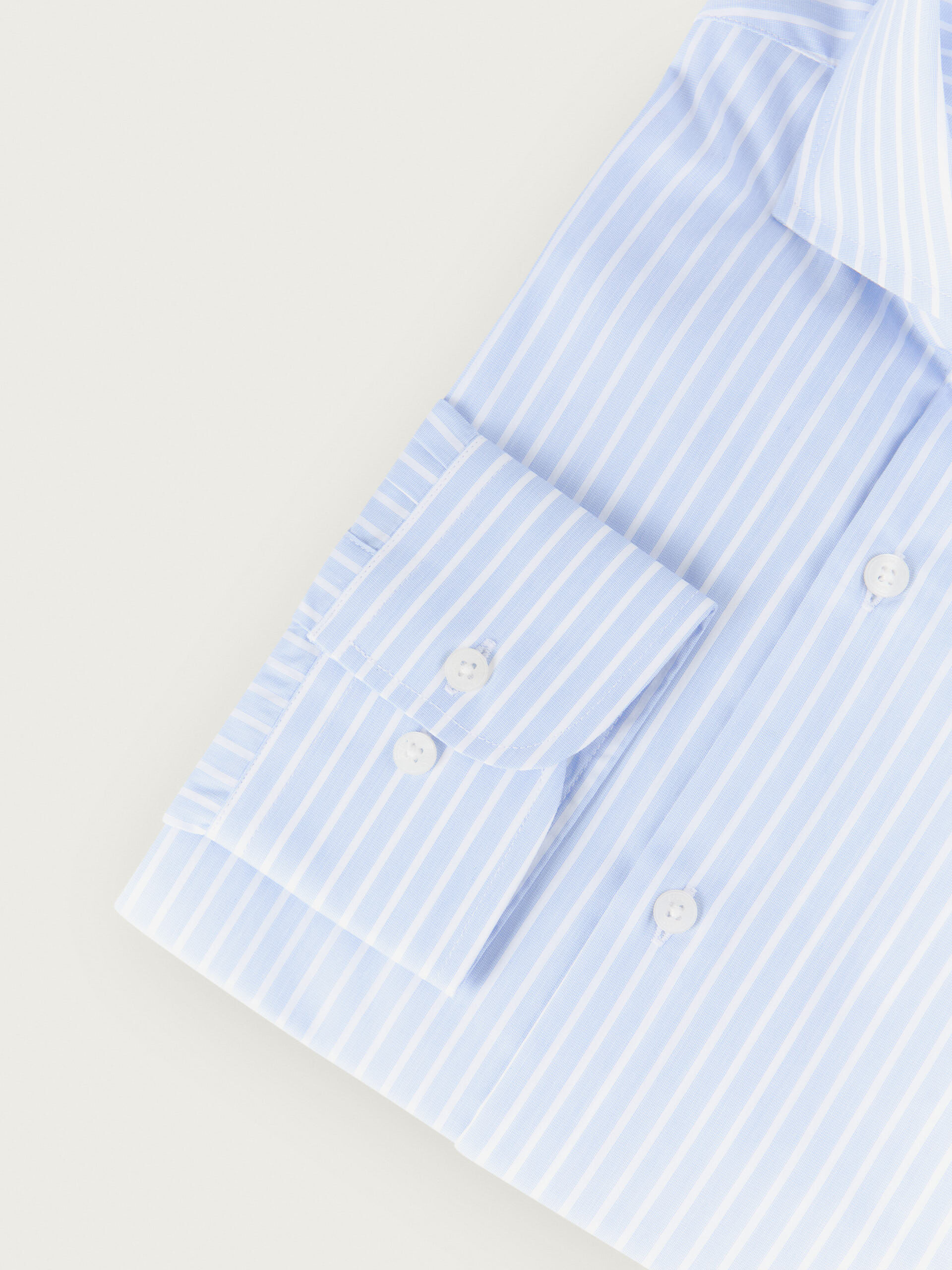 Camisa de vestir confeccionada en tejido a rayas de corte slim fit. Cuenta con cuello italiano, manga larga con puños simples y logo de la marca grabado en el frontal.