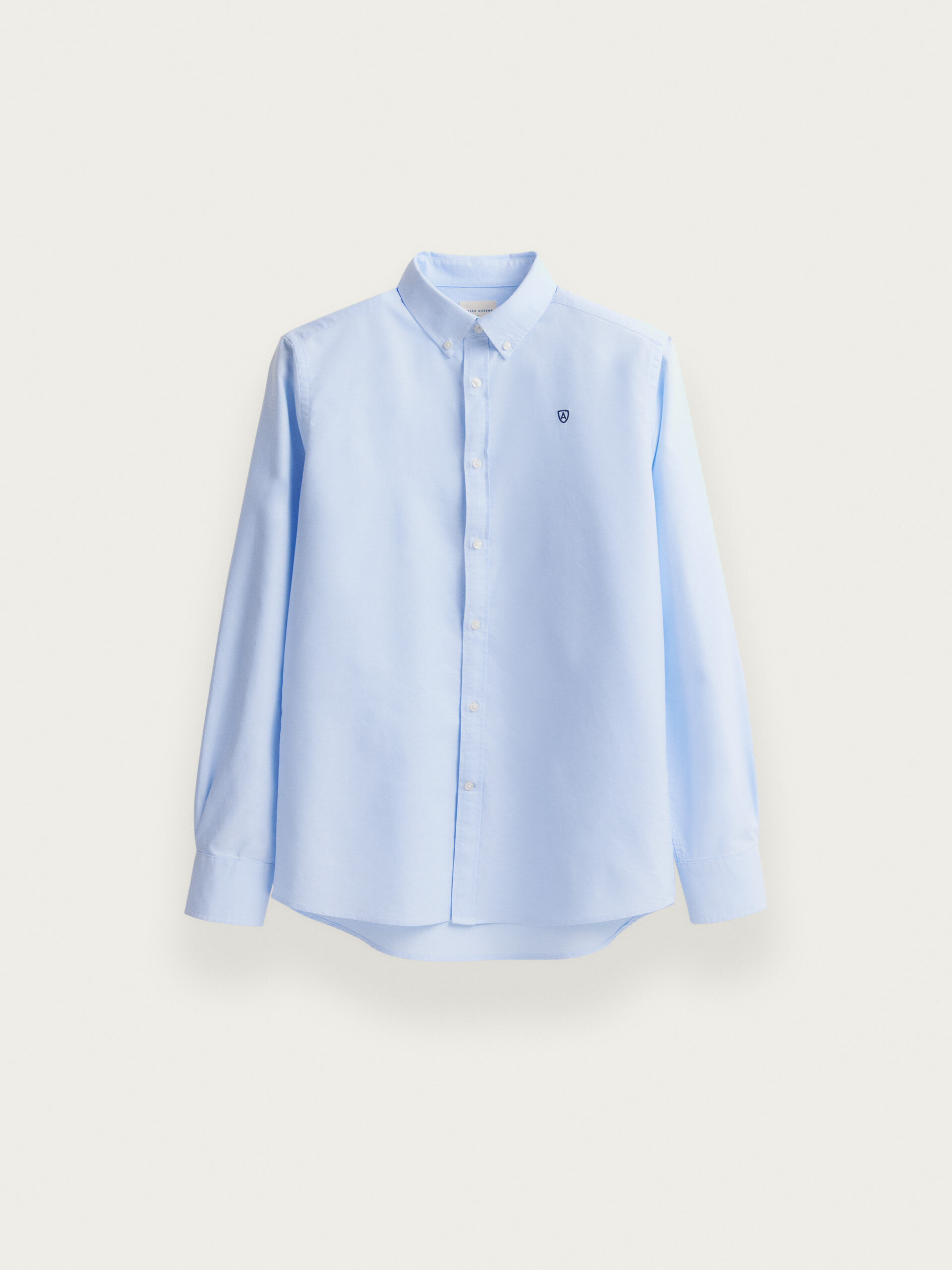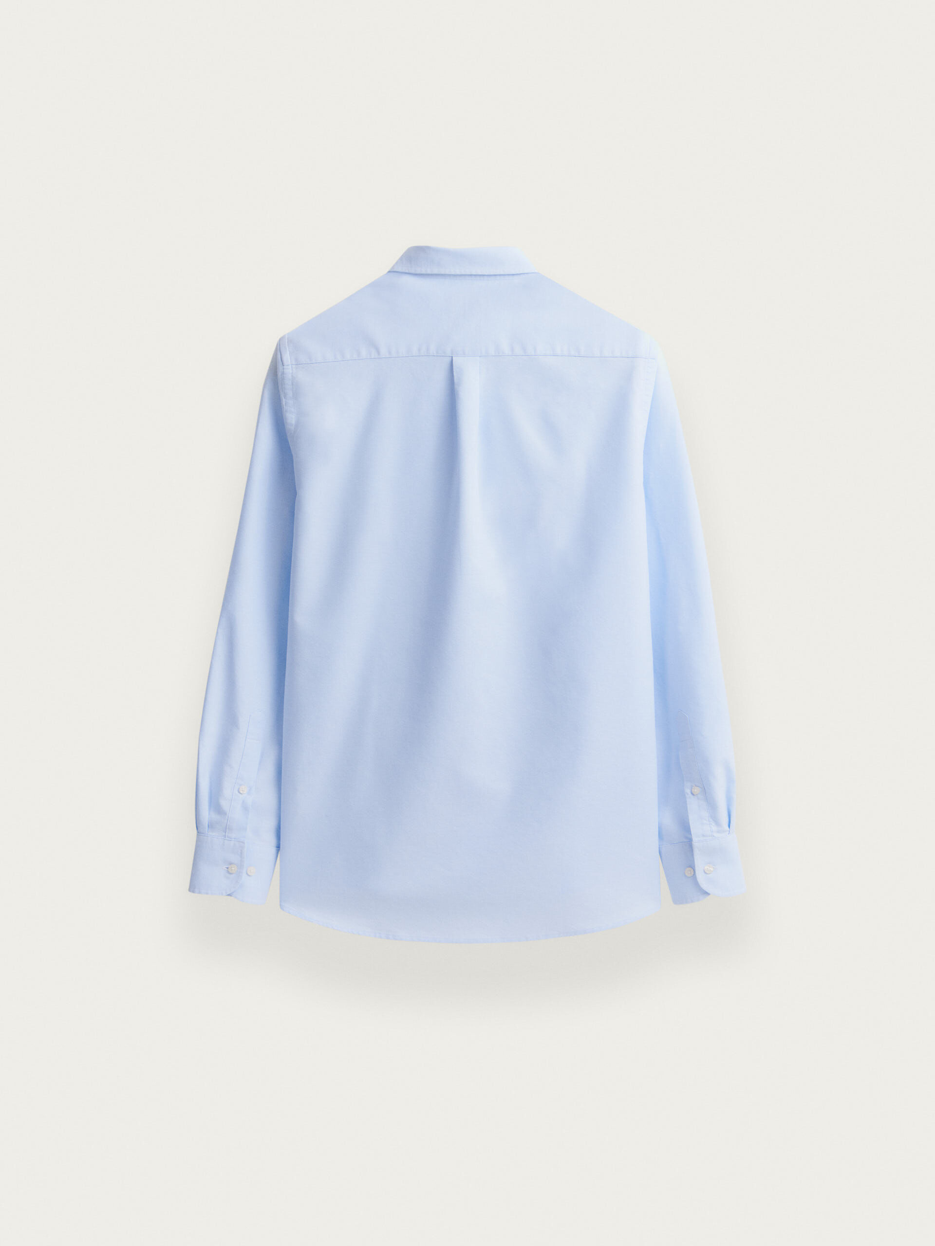 Camisa de estilo lisa y corte regular fit confeccionada en 100% algodón. Cuenta con cuello botón, manga larga con puños simples y logo de la marca grabado en el frontal a contraste.