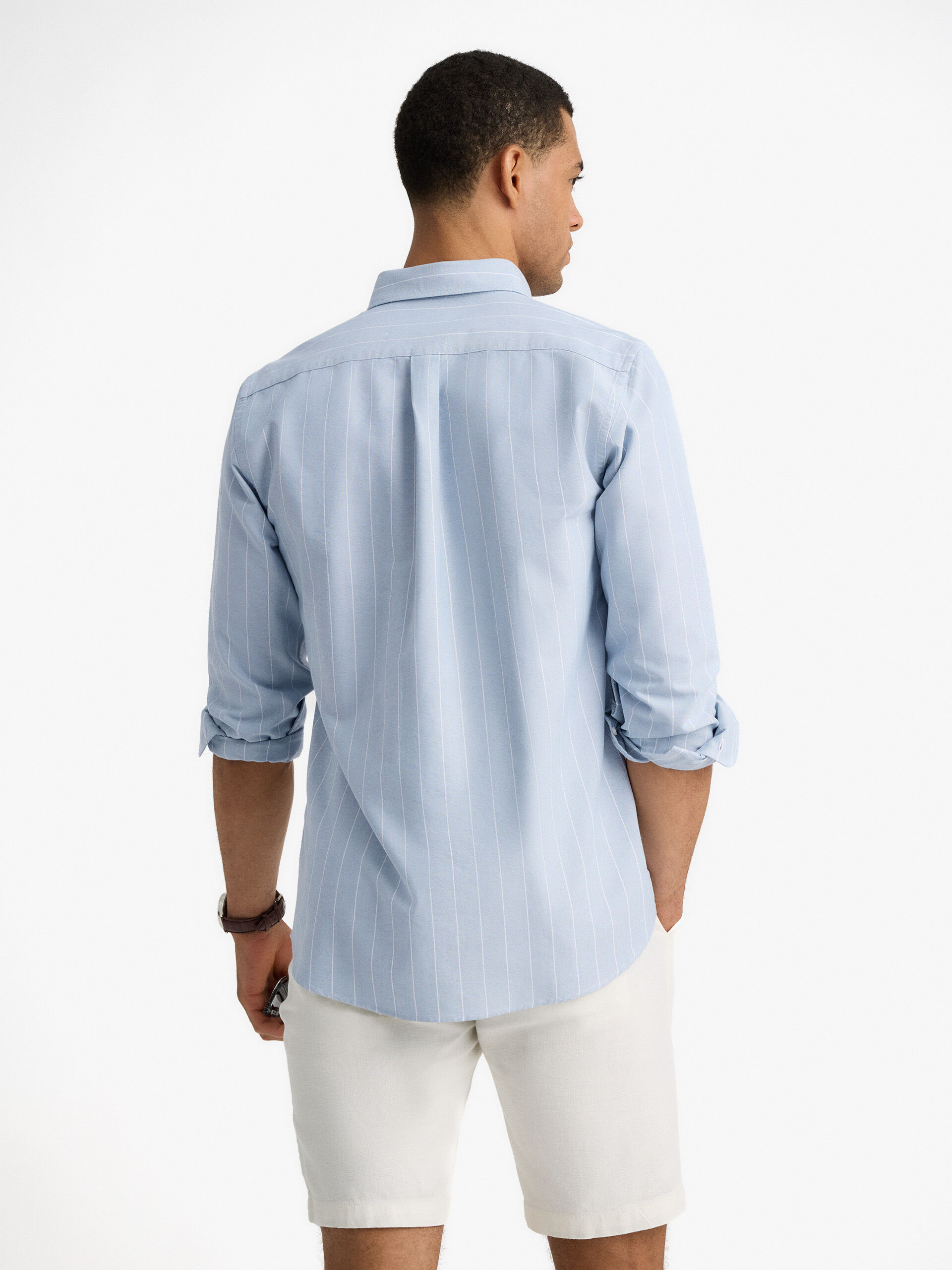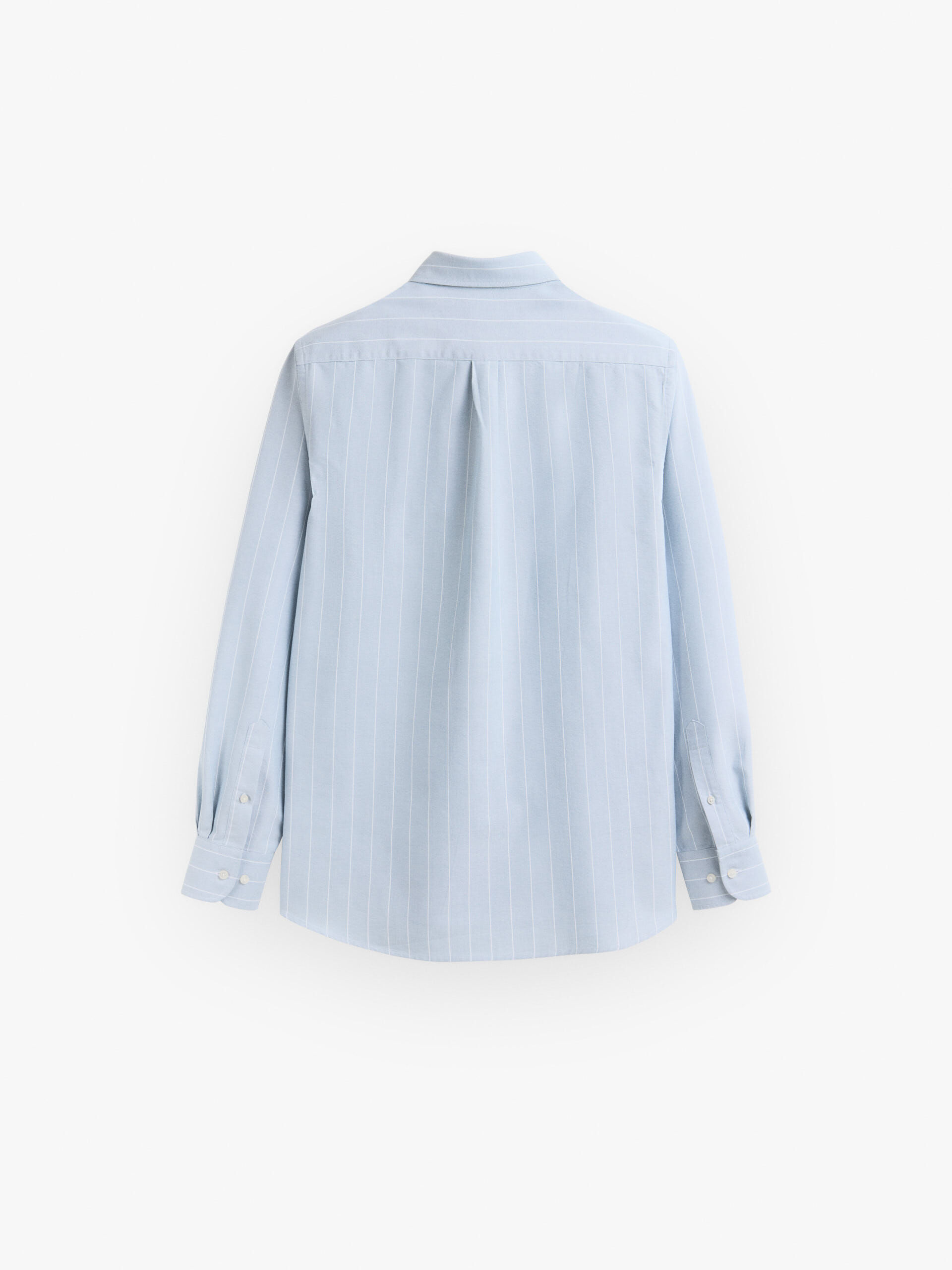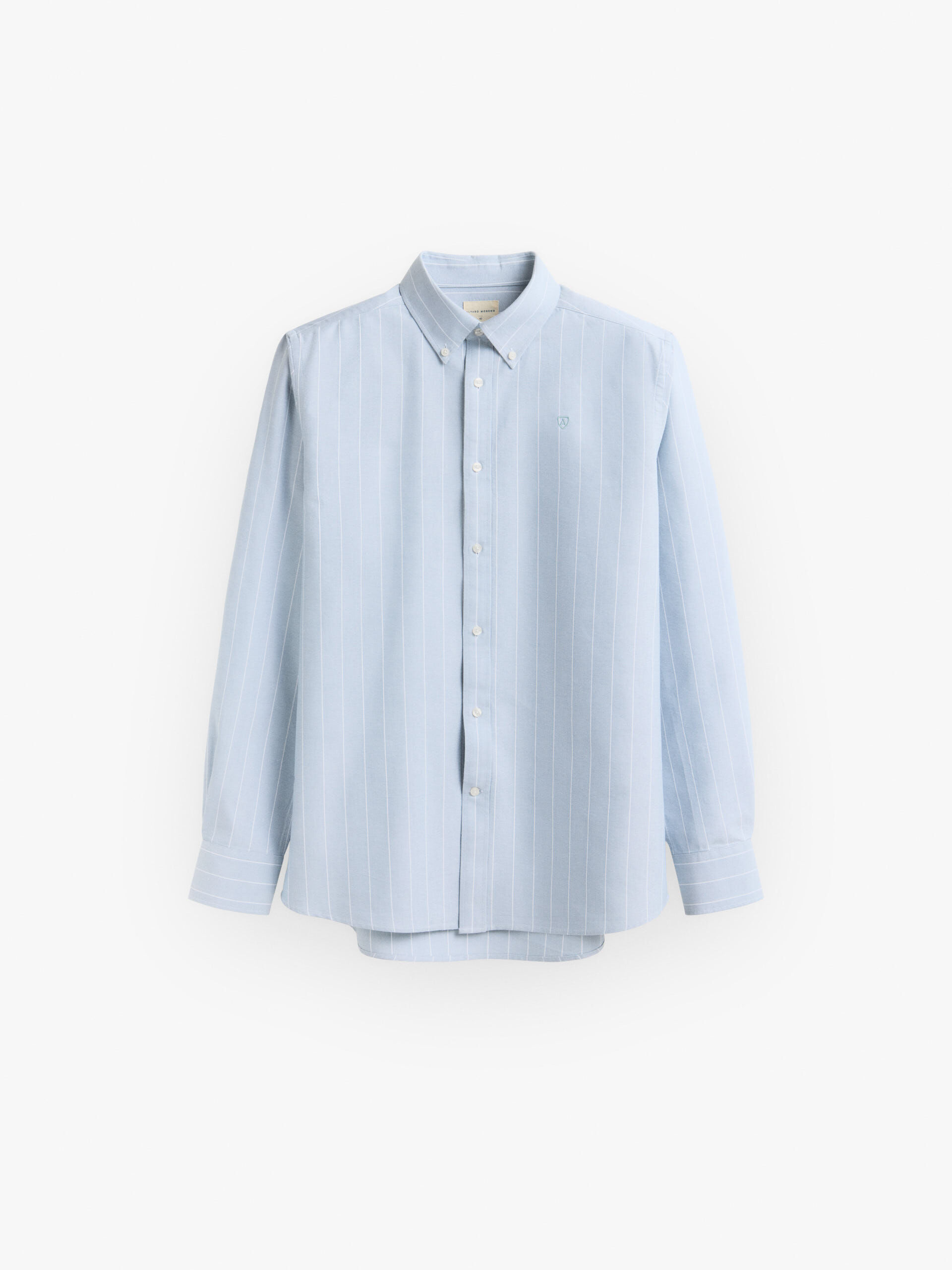 Camisa con diseño a rayas de corte regular fit. Cuenta con cuello de botón, manga larga con puños simples y logo de la marca grabado en el frontal.