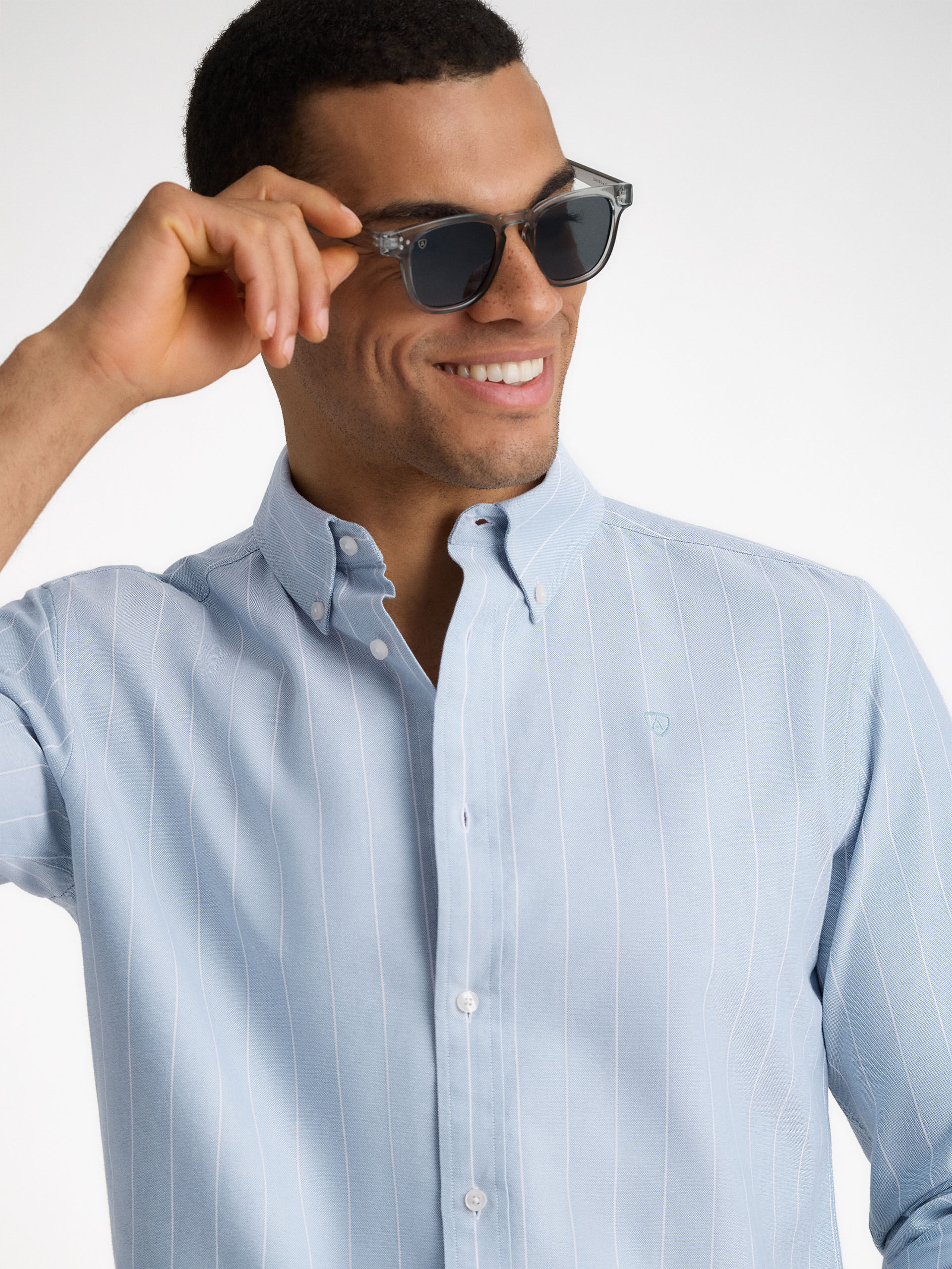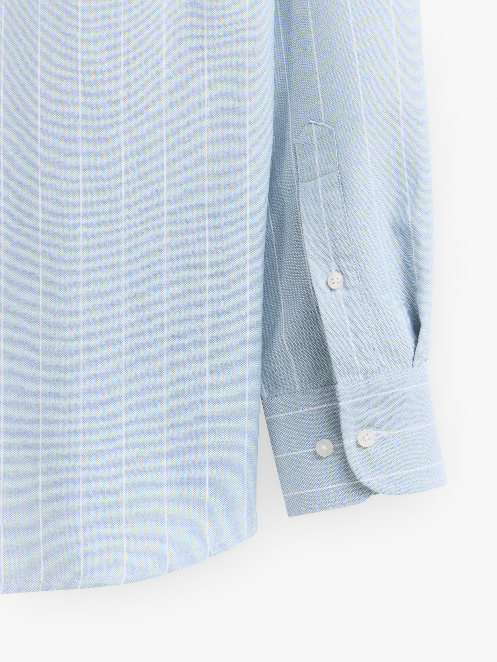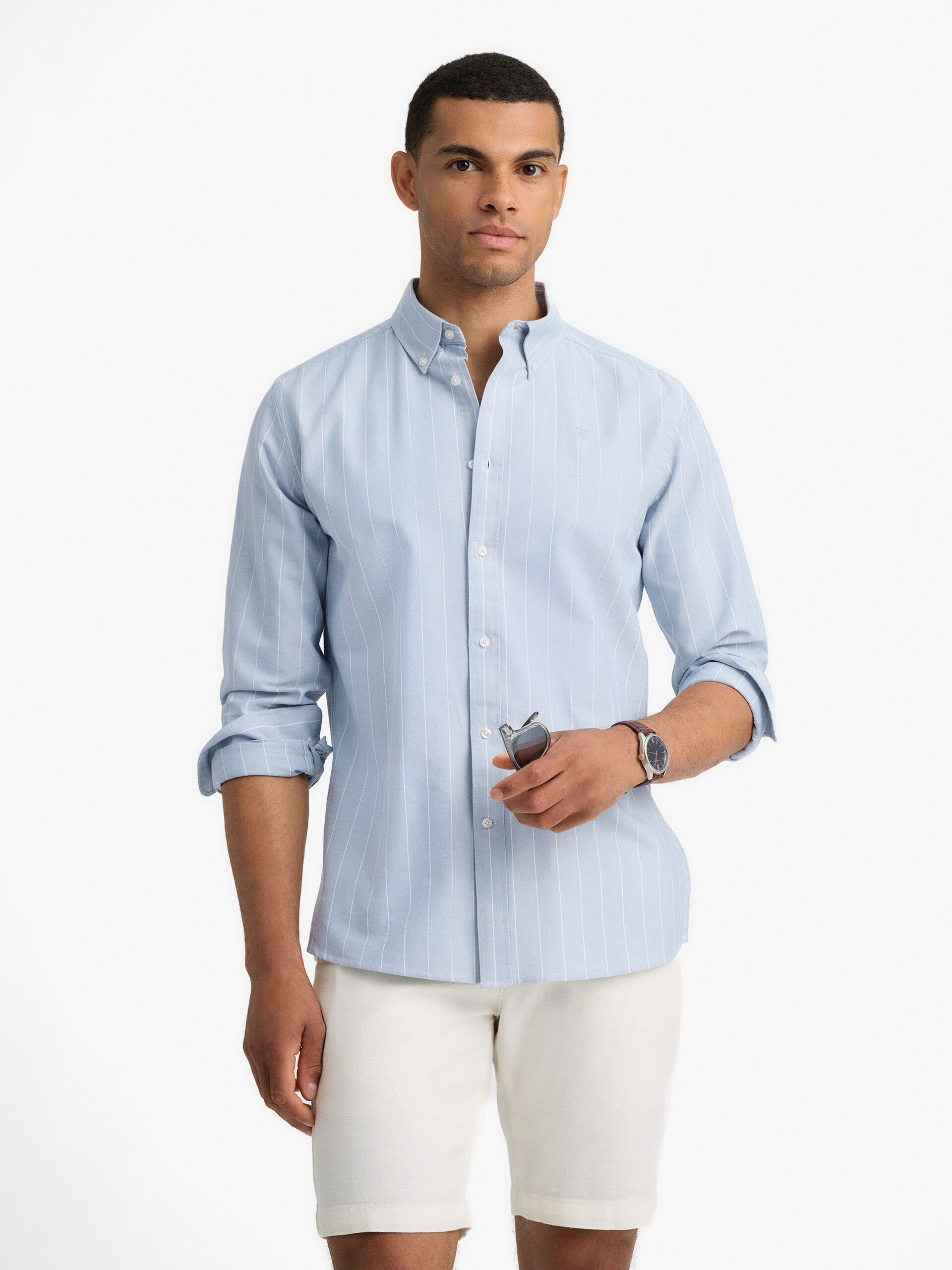 Camisa con diseño a rayas de corte regular fit. Cuenta con cuello de botón, manga larga con puños simples y logo de la marca grabado en el frontal.
