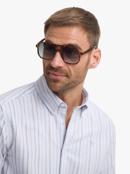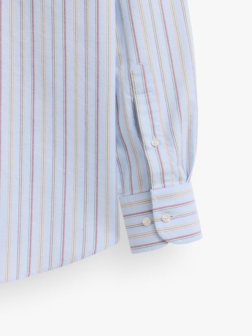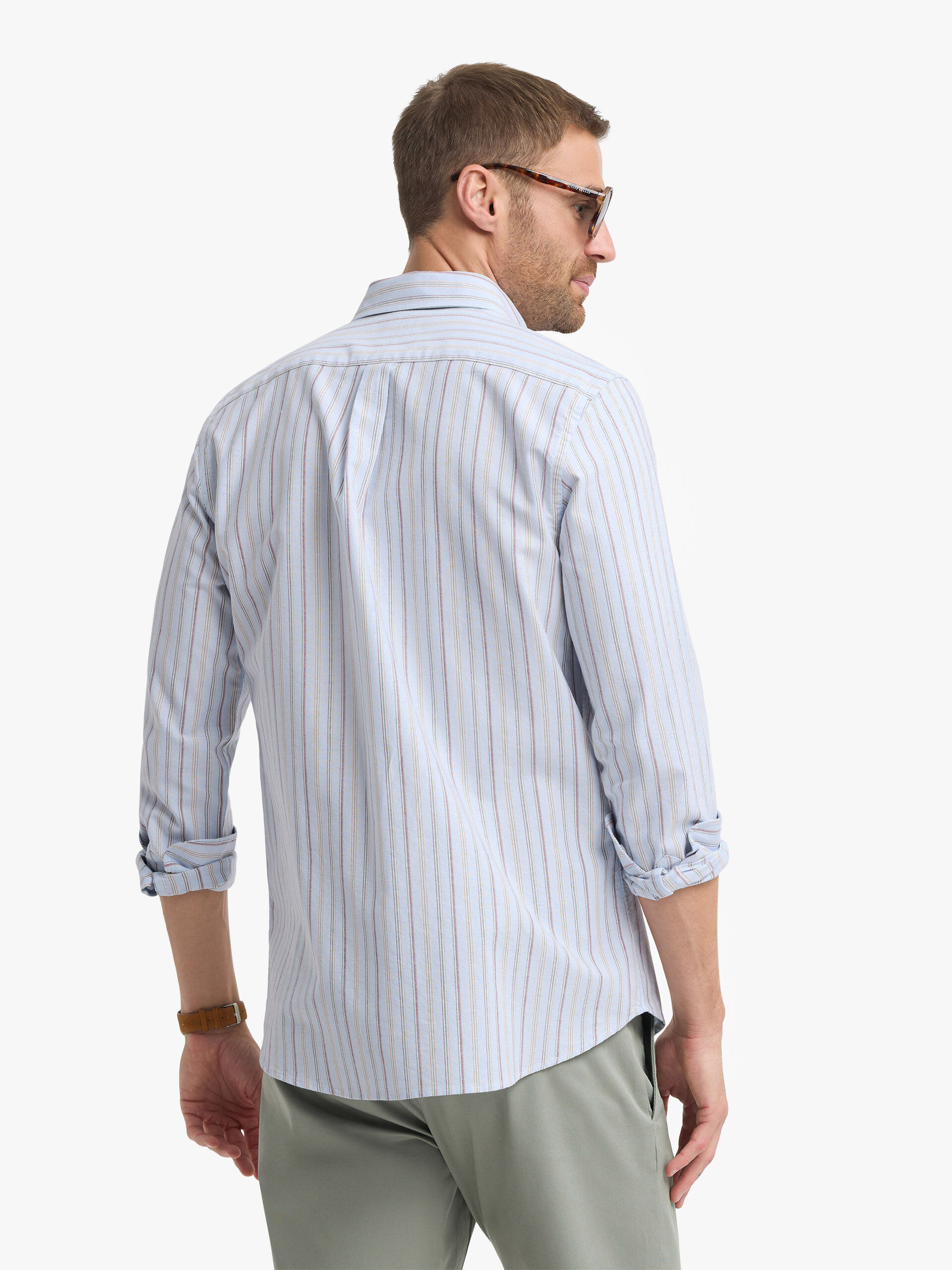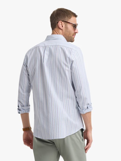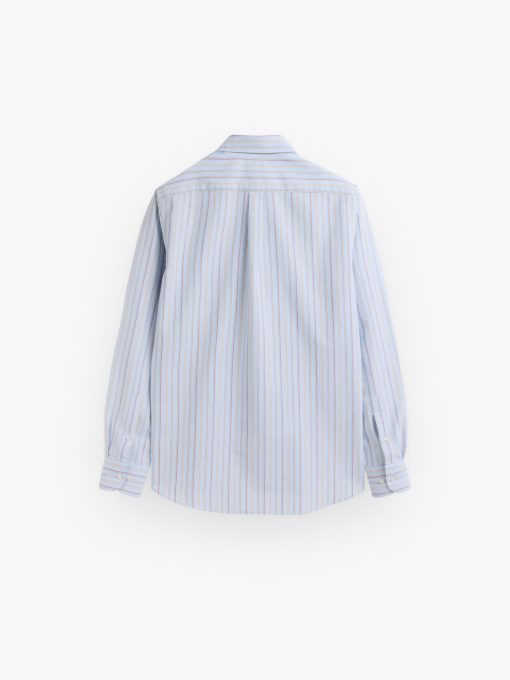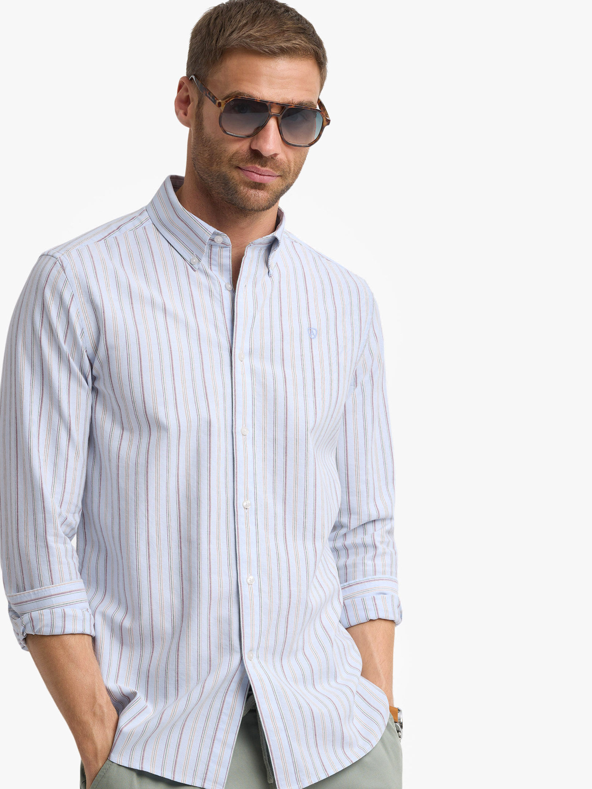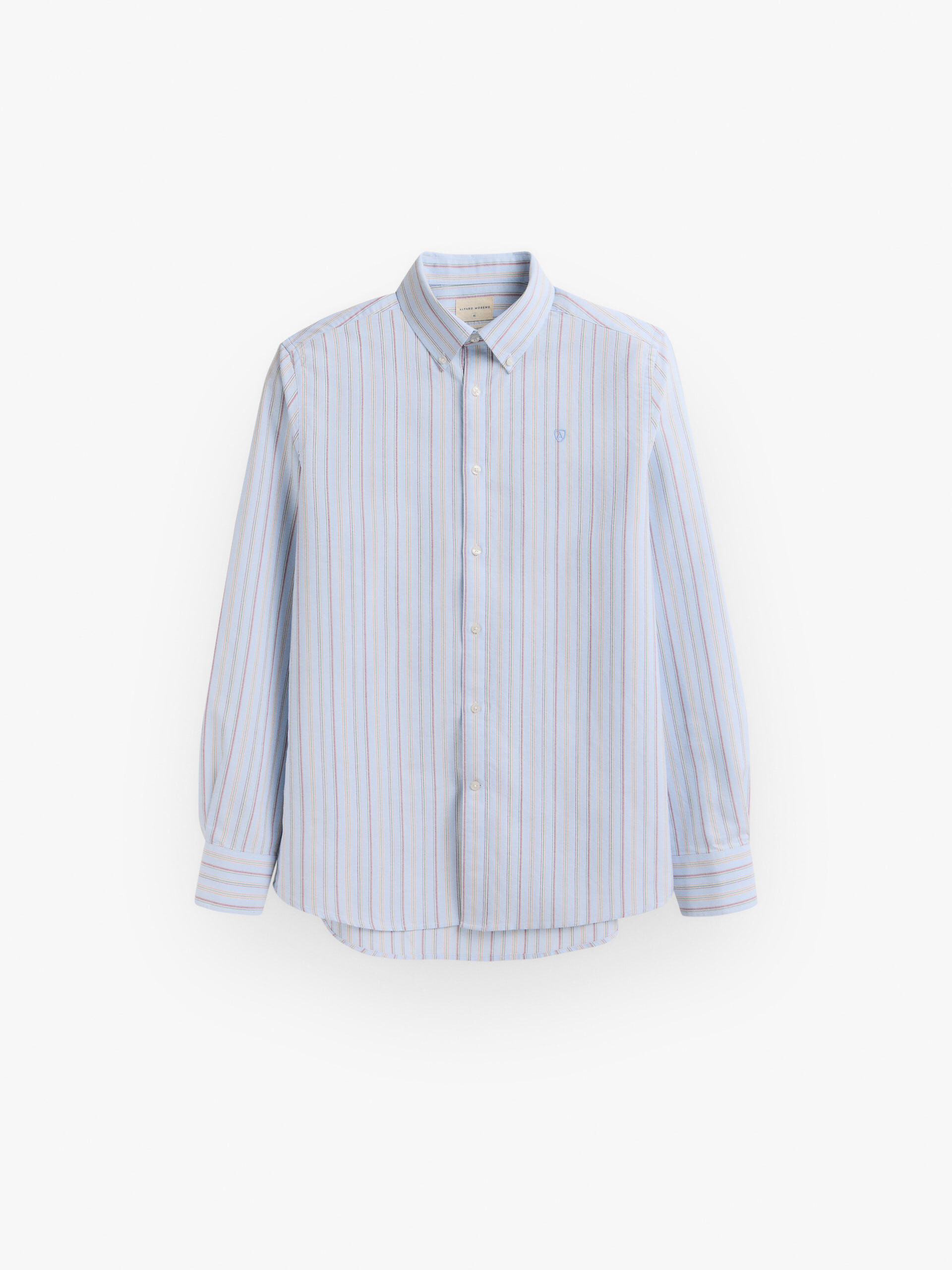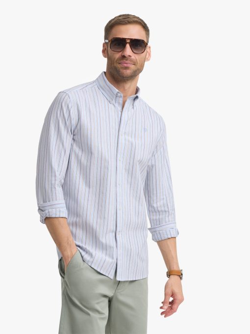Camisa de corte regular fit con diseño a rayas. Cuenta con cuello de botón, logo de la marca grabado en el frontal y manga larga con puños simples.