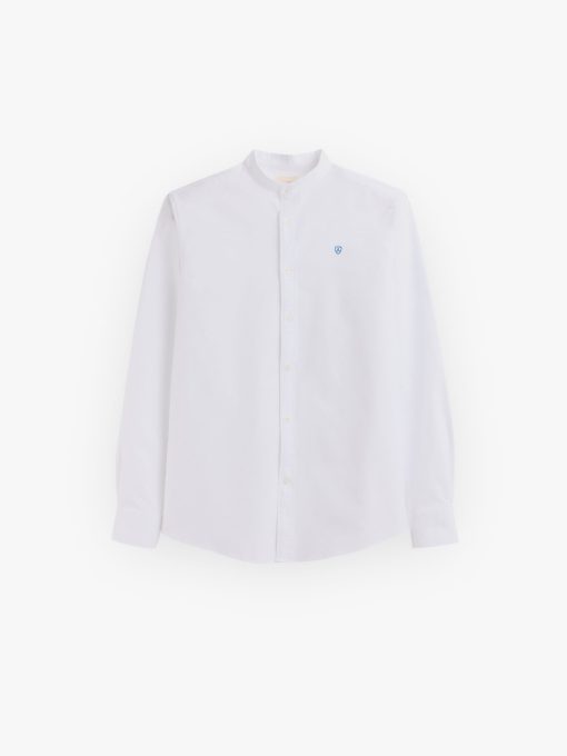 Camisa de corte regular fit con una suave estructura en su tejido. Cuenta con cuello mao, manga larga con puños simples y logo de la marca grabado en el frontal.