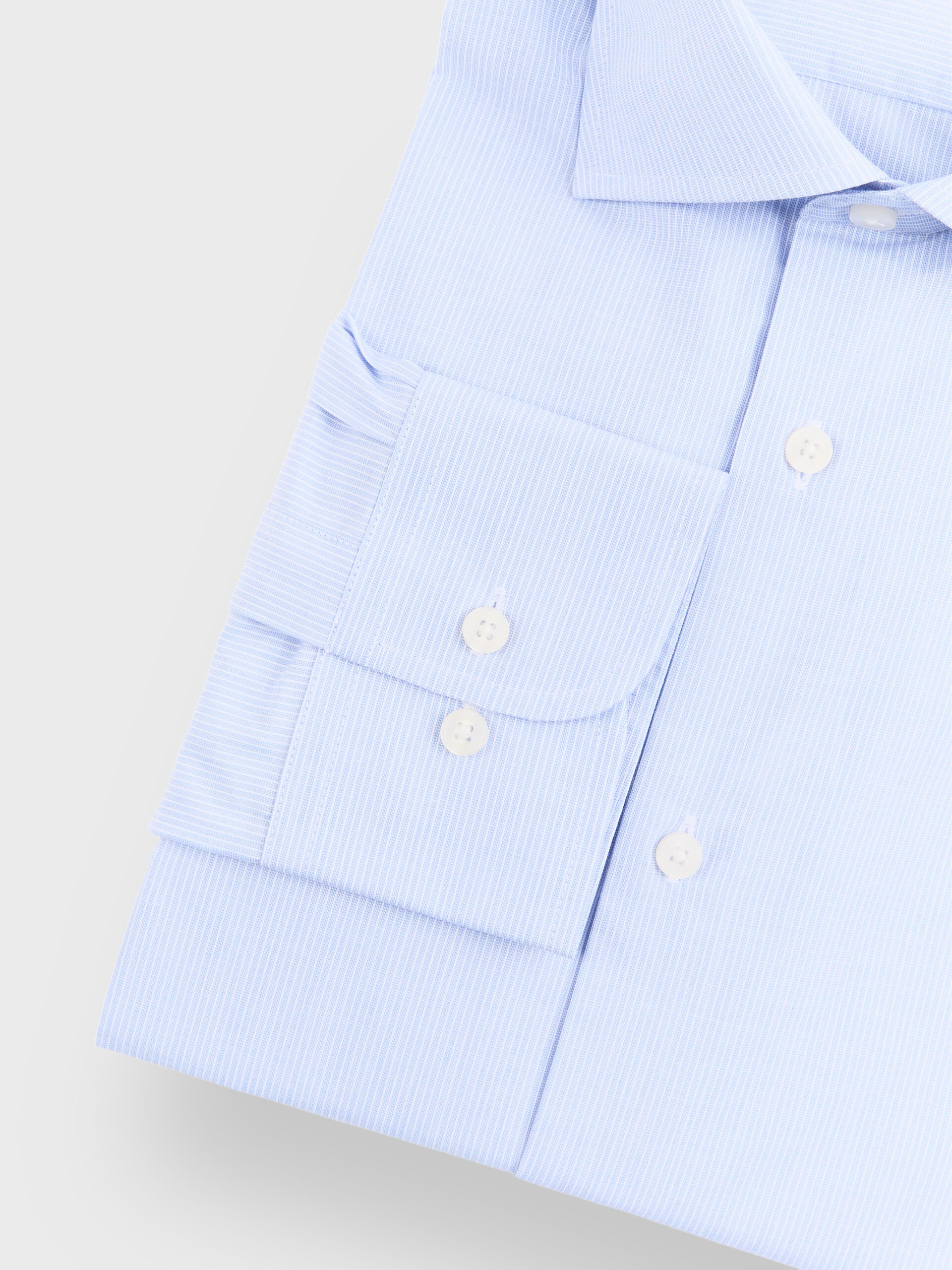 Camisa de vestir con tejido a rayas. Confeccionada en algodón con cuello italiano, puños con cierre simple y logo de la marca grabado al tono en el frontal. Corte slim fit.