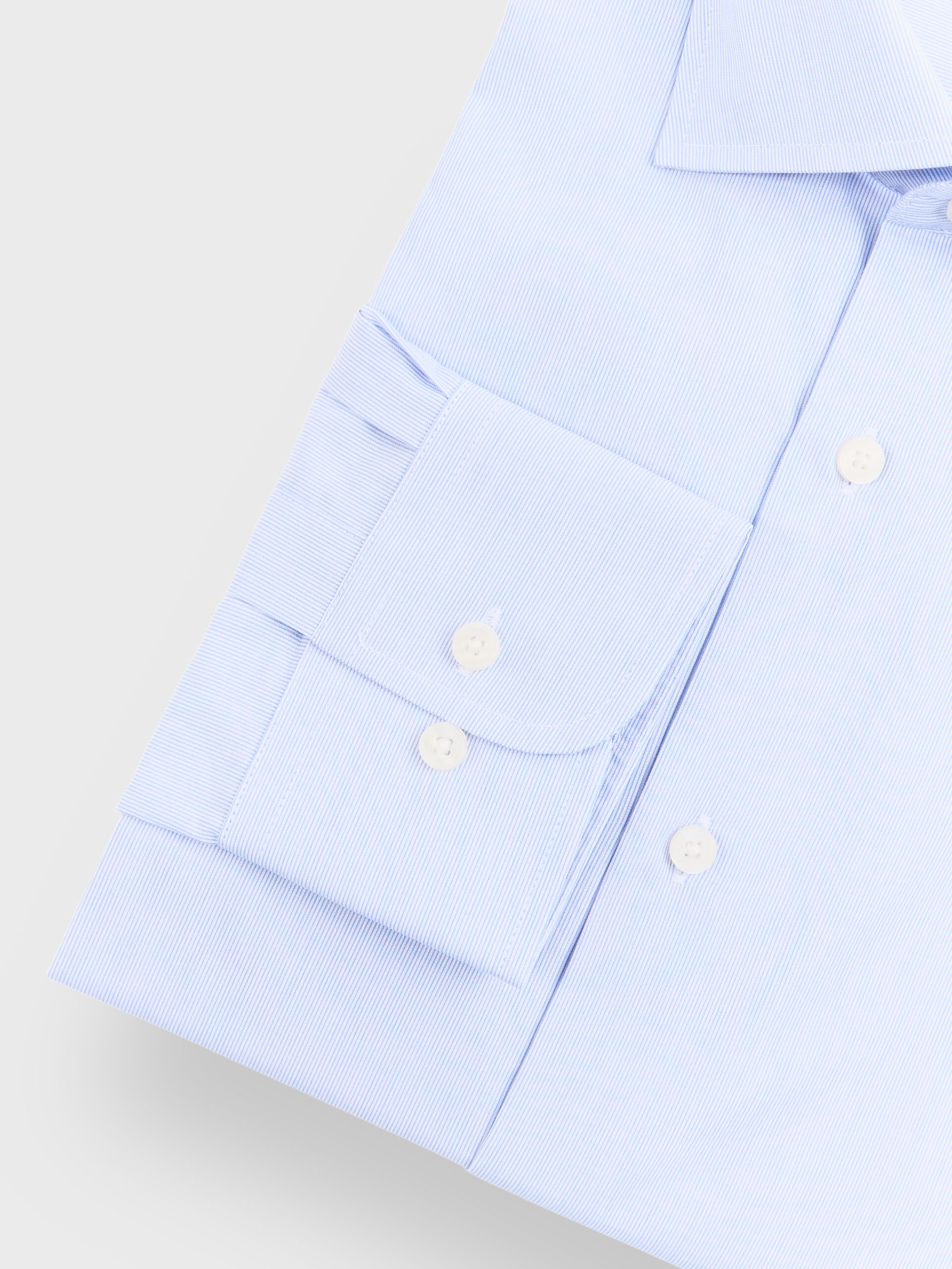 Camisa de vestir con tejido a rayas. Confeccionada en algodón con cuello italiano, puños con cierre simple y logo de la marca grabado al tono en el frontal. Corte slim fit.