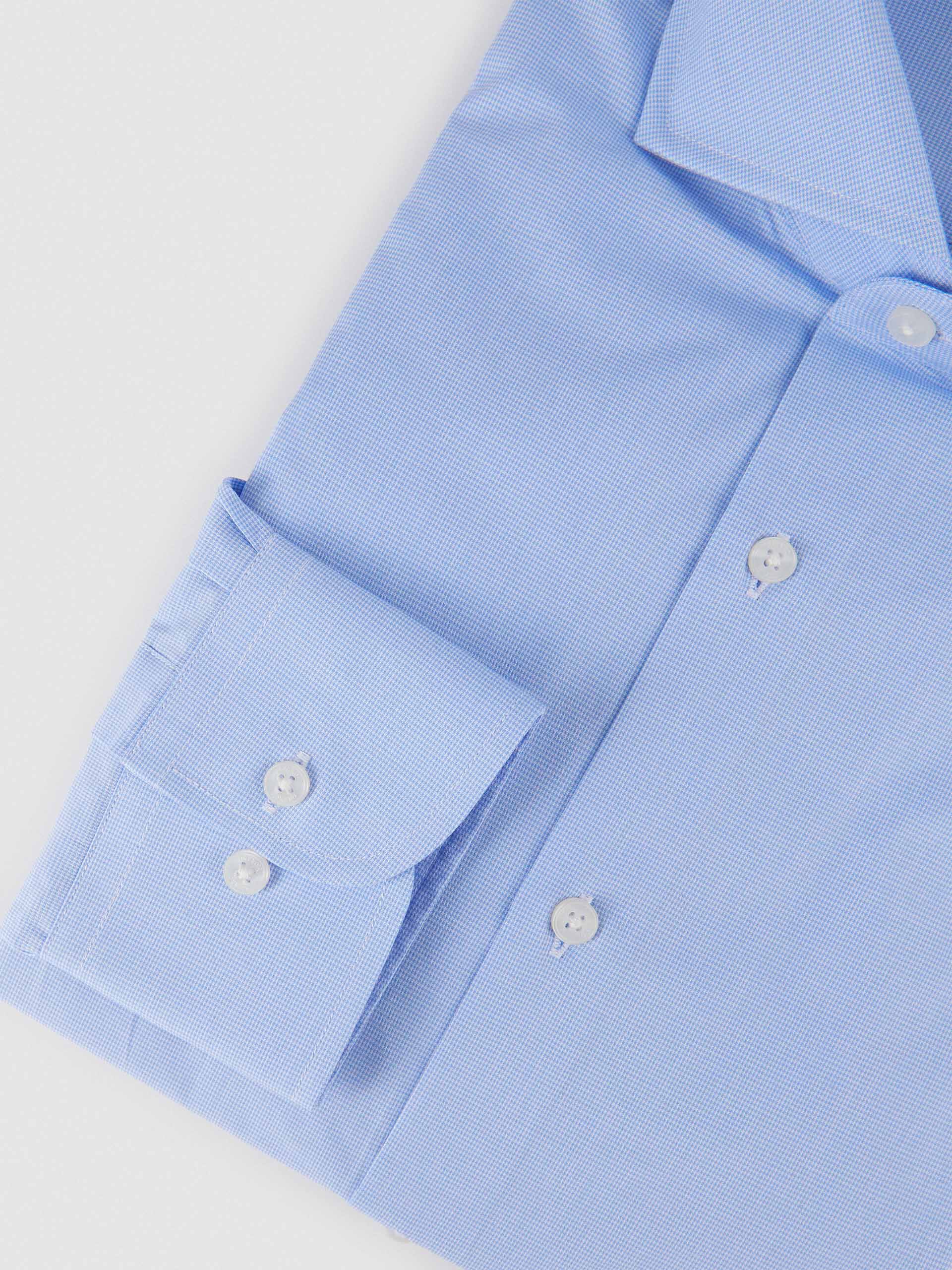 Camisa de vestir con tejido en pata de gallo confeccionada en algodón. Cuenta con cuello italiano, manga larga con puños simples y logo de la marca grabado en el frontal. Corte slim fit.