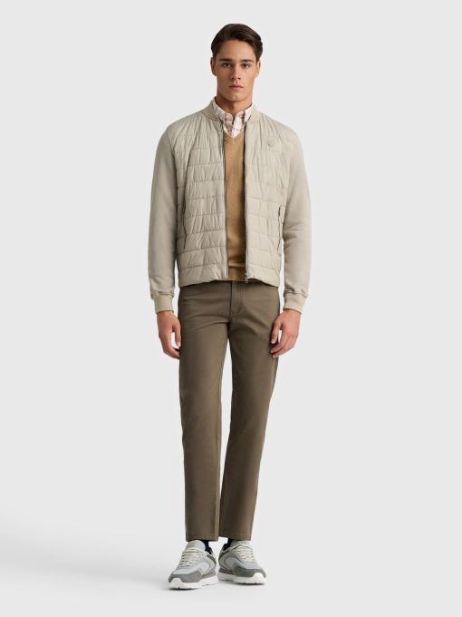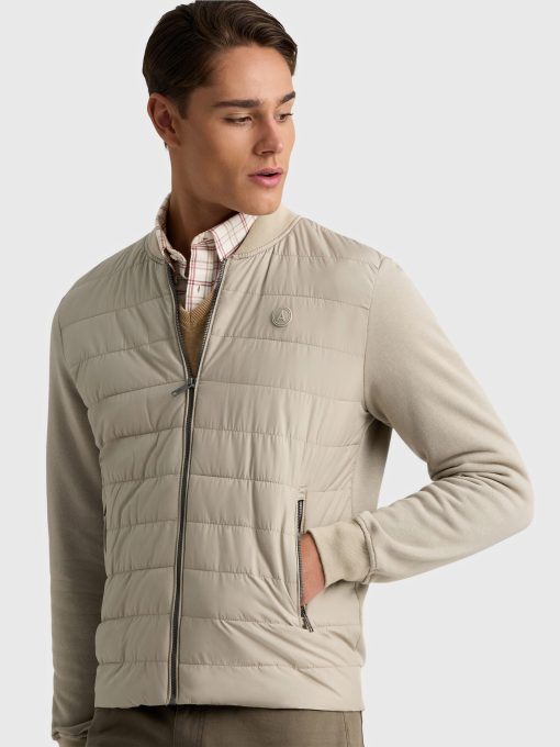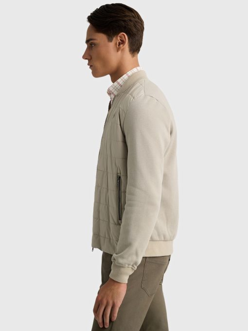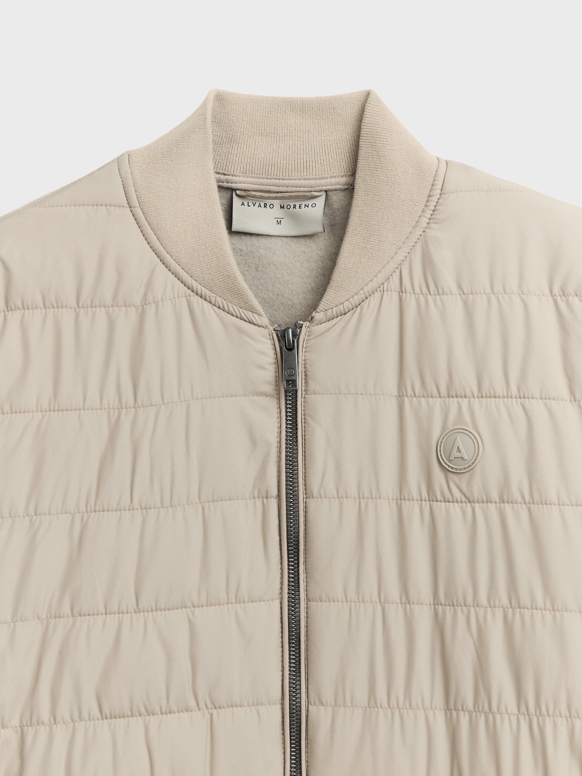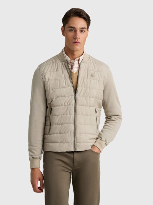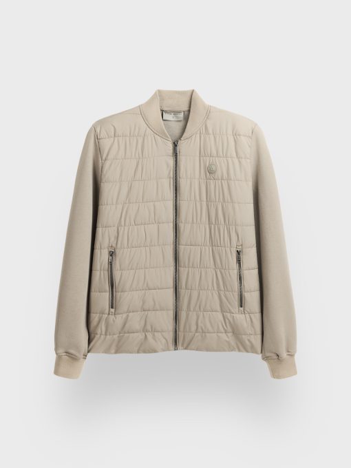 Cazadora estilo bomber de corte regular fit. Parte delantera acolchada. Cuello, mangas y espalda en tejido de punto. Cierre central mediante cremallera, dos bolsillos a la altura de la cintura y parche engomado con el logo de la marca.