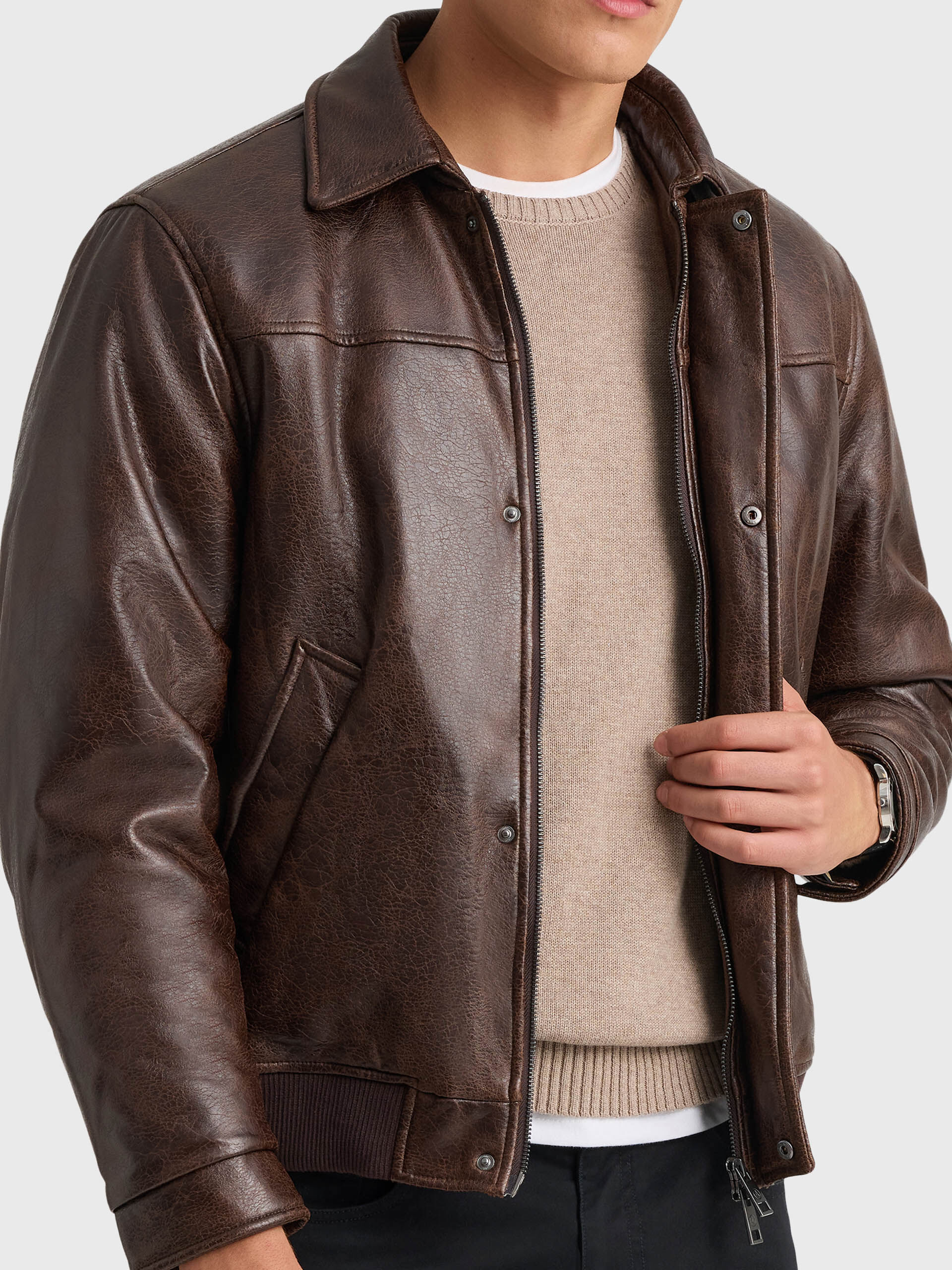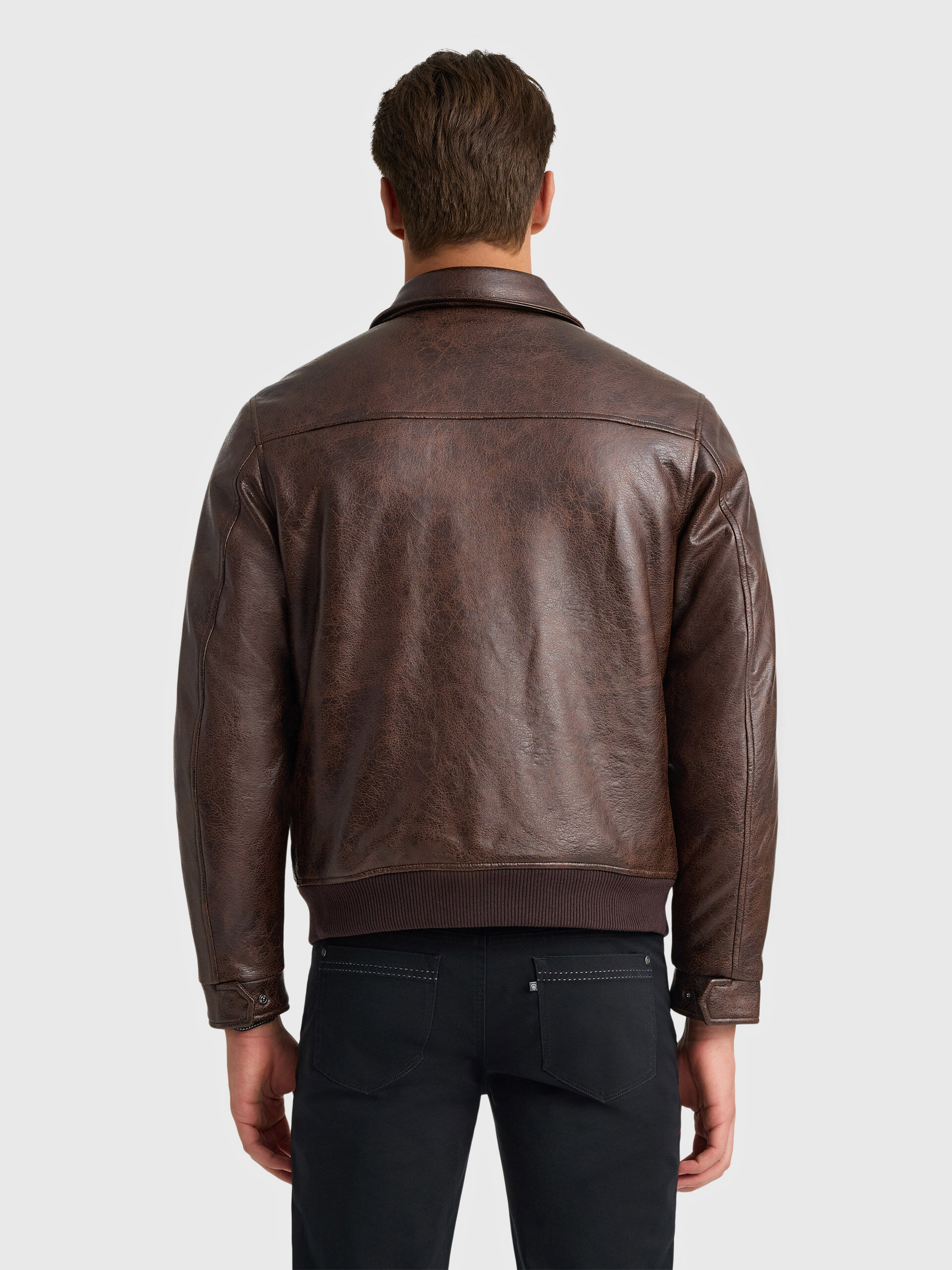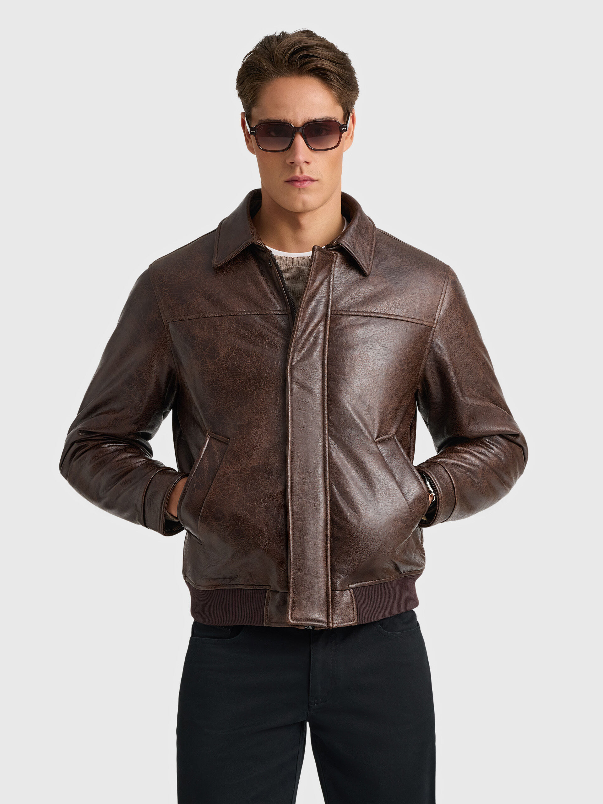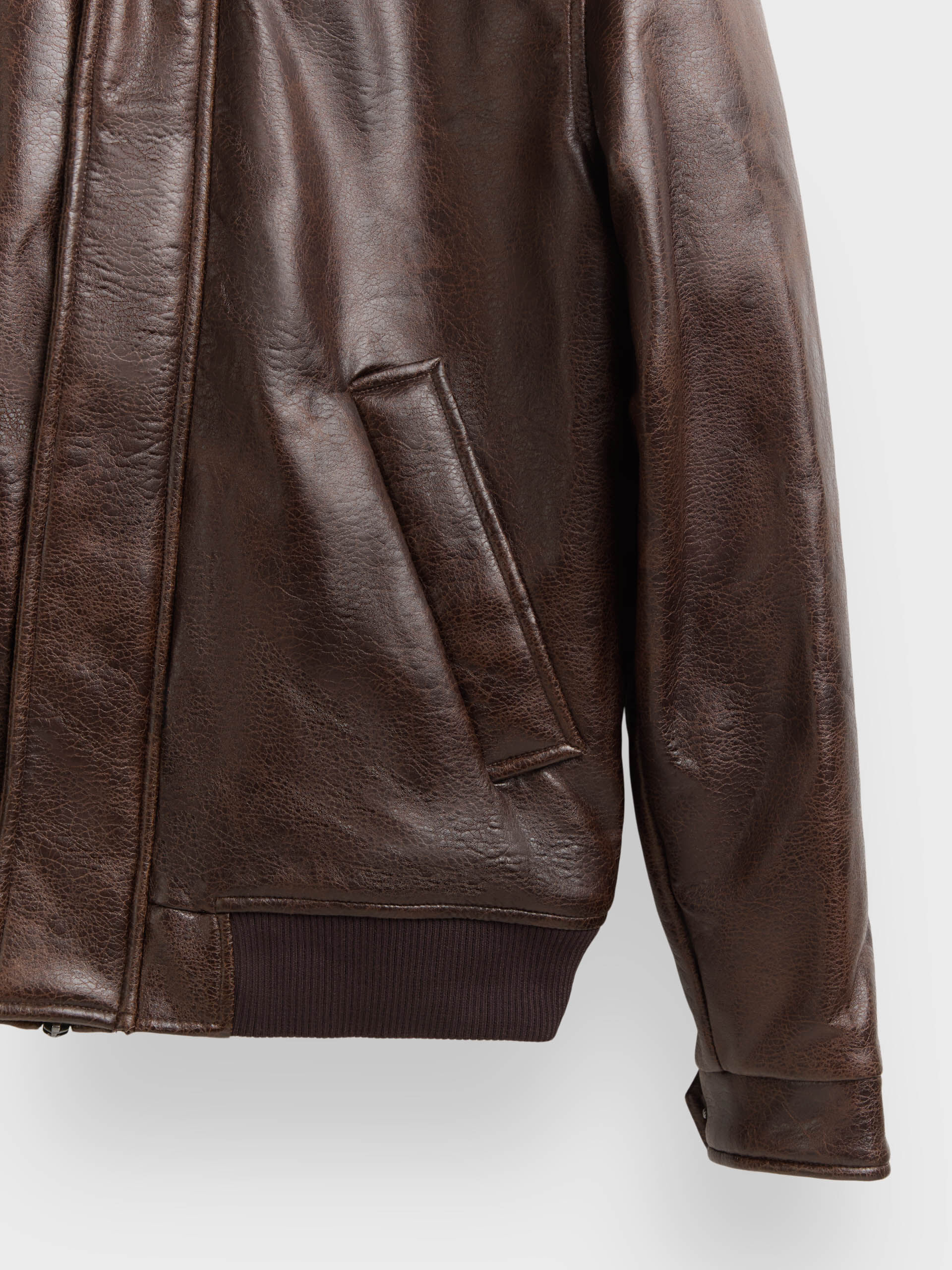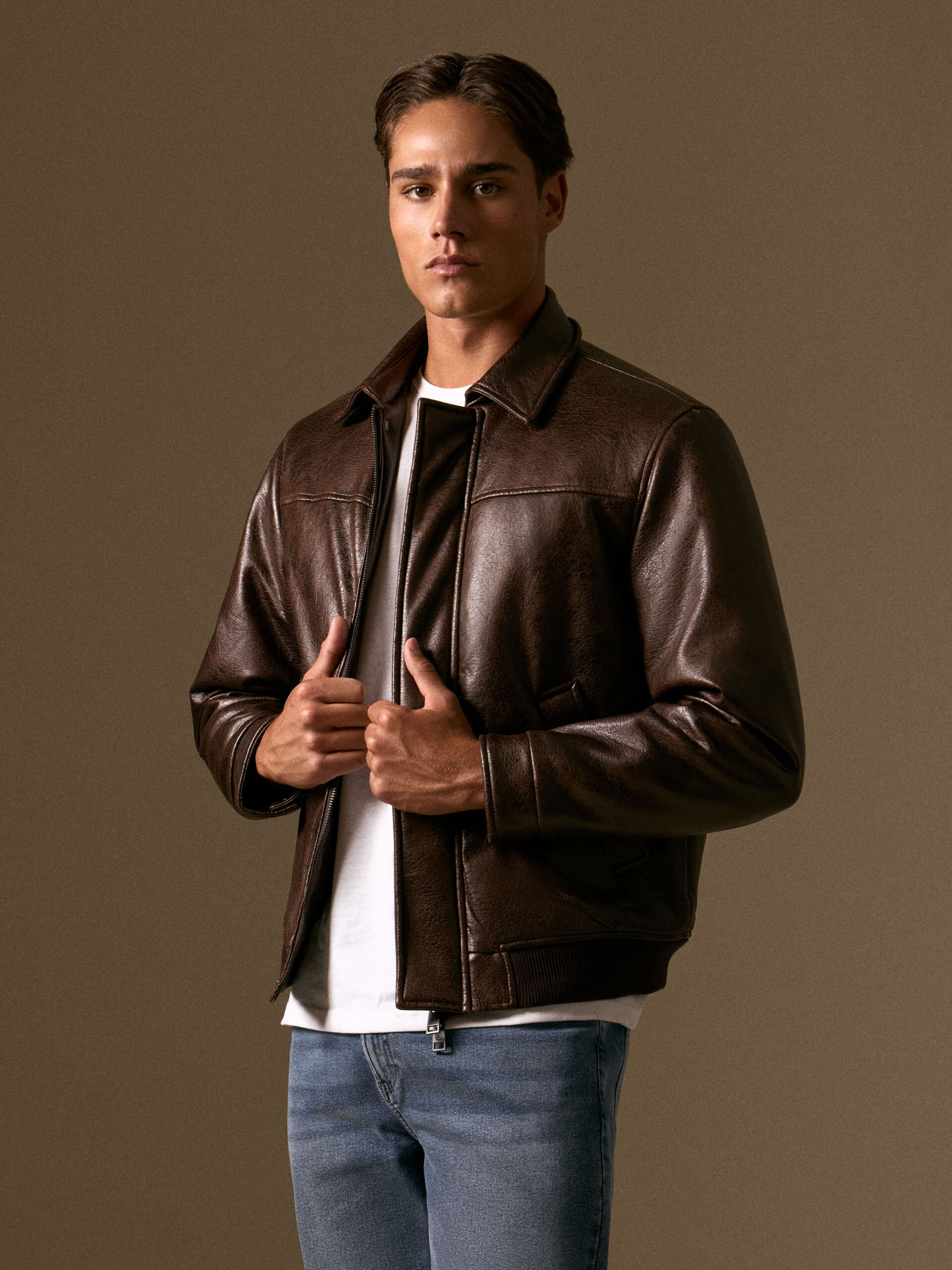 Cazadora confeccionado en efecto piel con cuello de solapa, cierre central mediante cremallera oculta por tapeta de botones a presión, dos bolsillos en la cintura y puños ajustables. Corte regular fit.