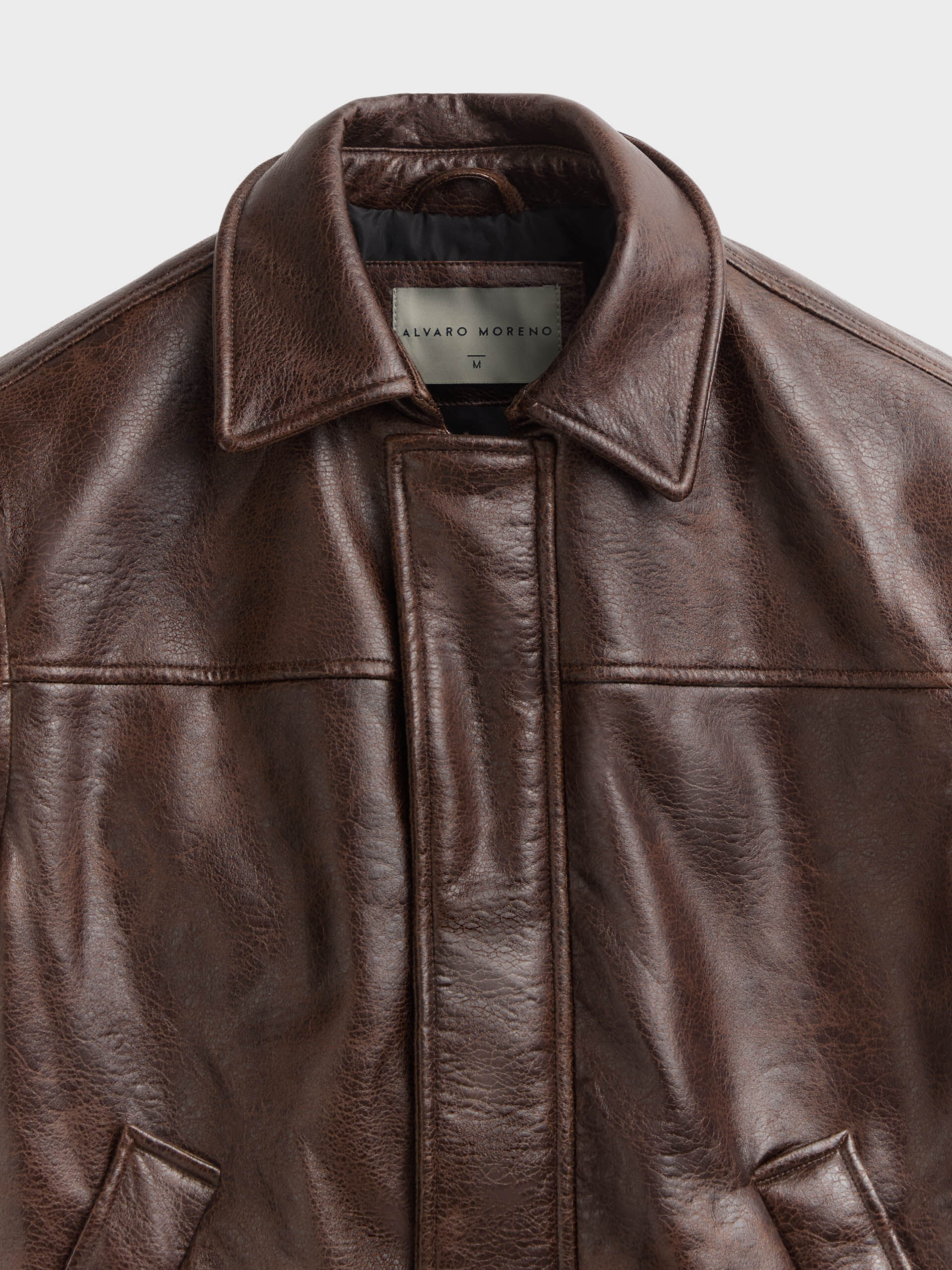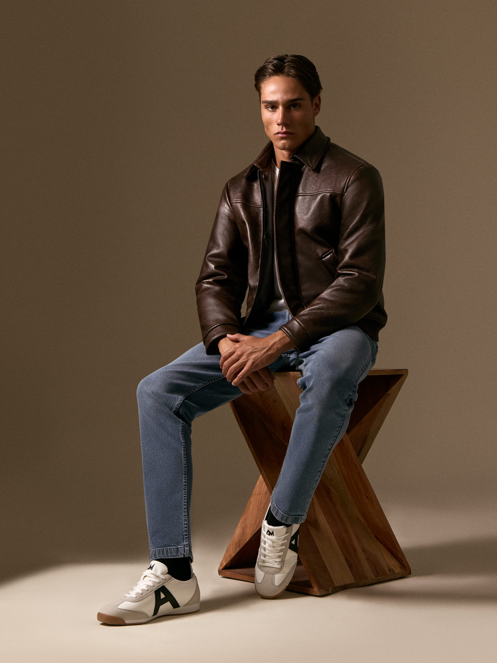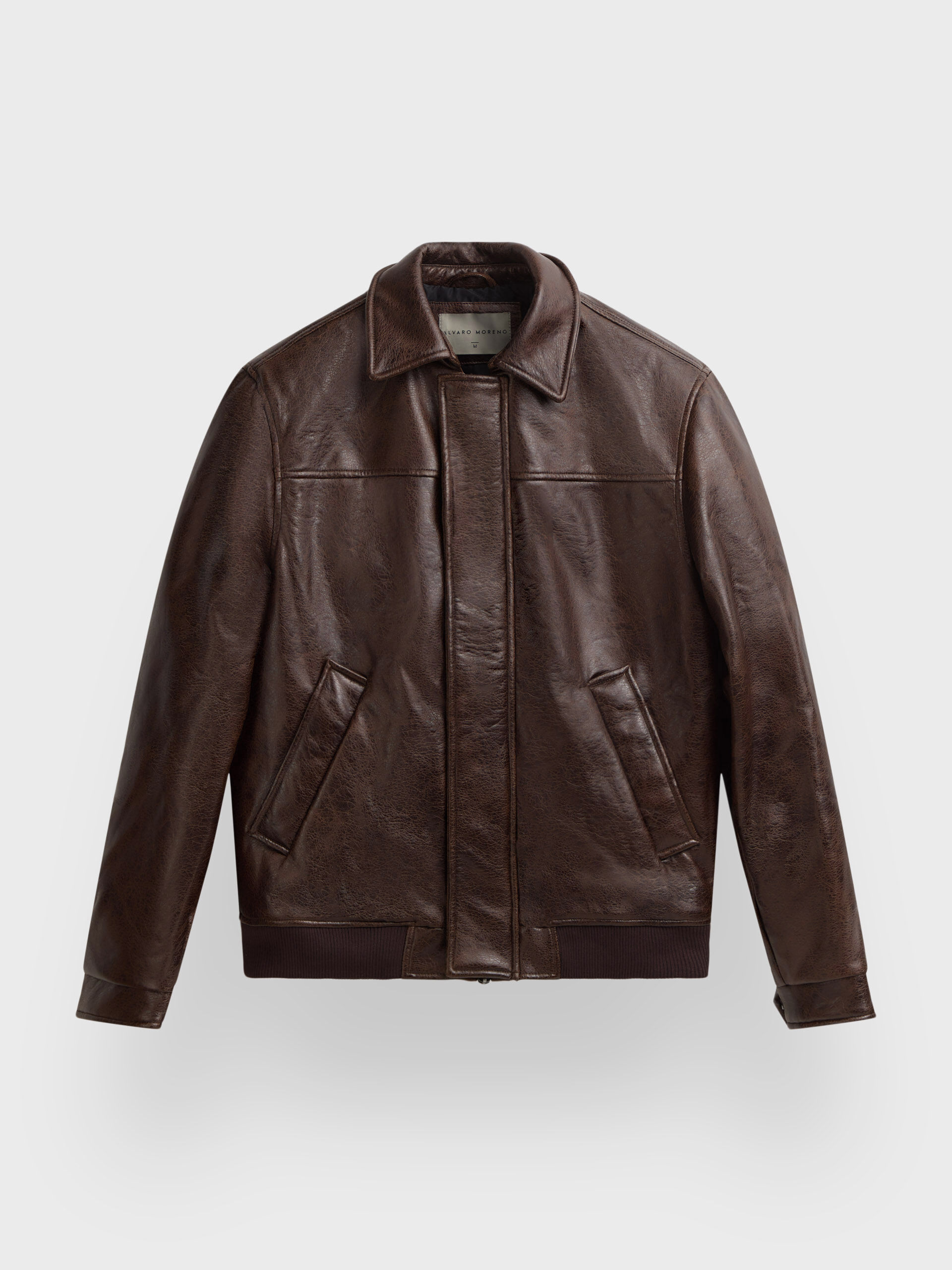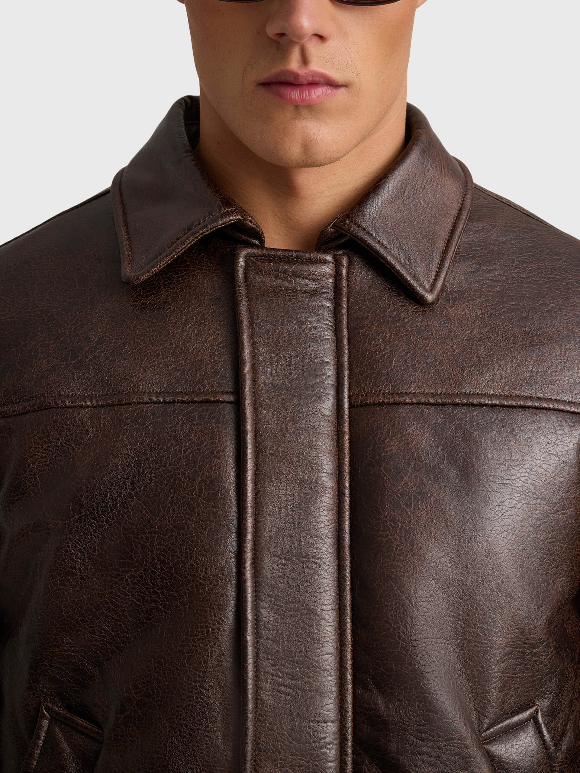 Cazadora confeccionado en efecto piel con cuello de solapa, cierre central mediante cremallera oculta por tapeta de botones a presión, dos bolsillos en la cintura y puños ajustables. Corte regular fit.