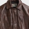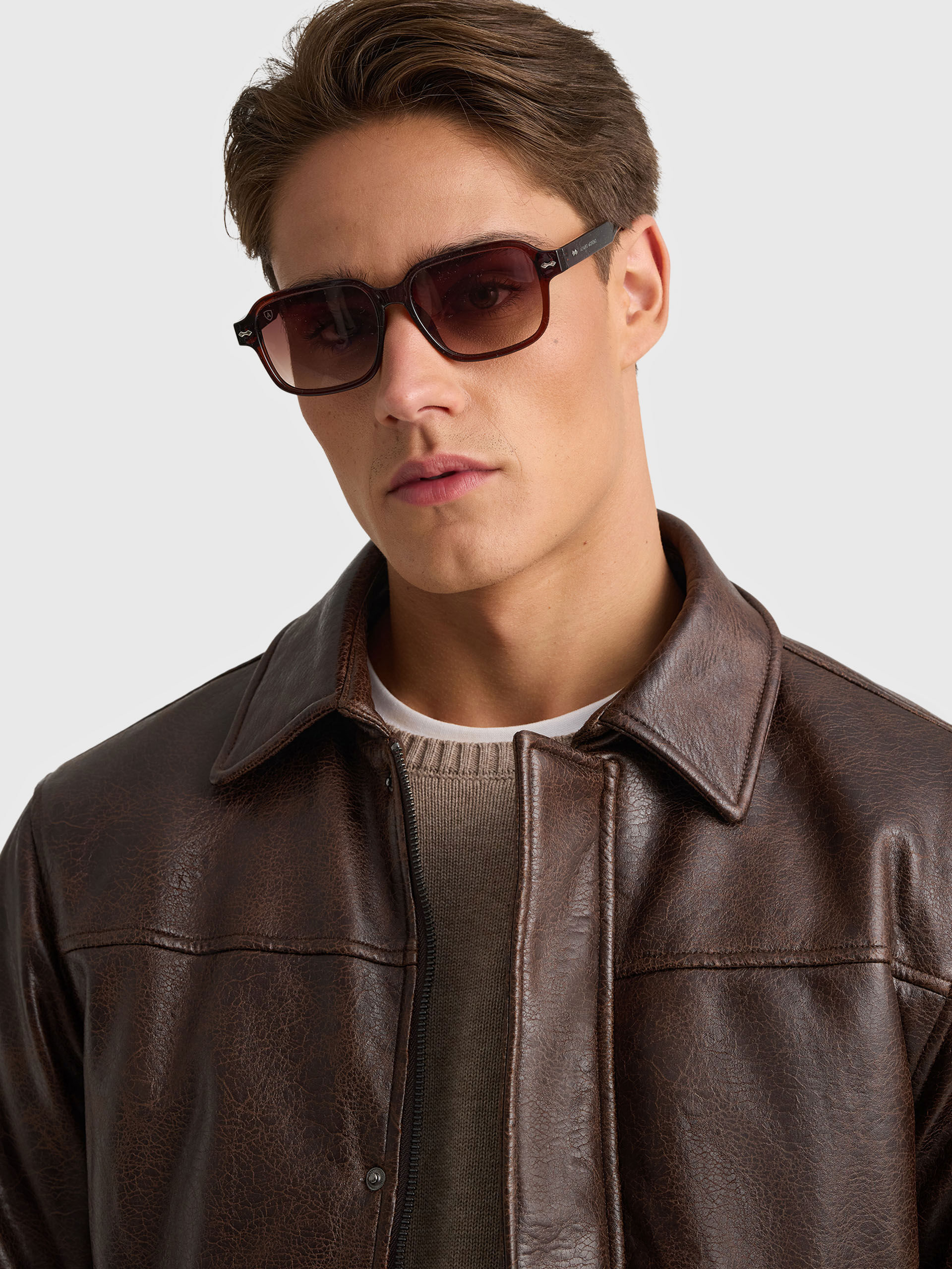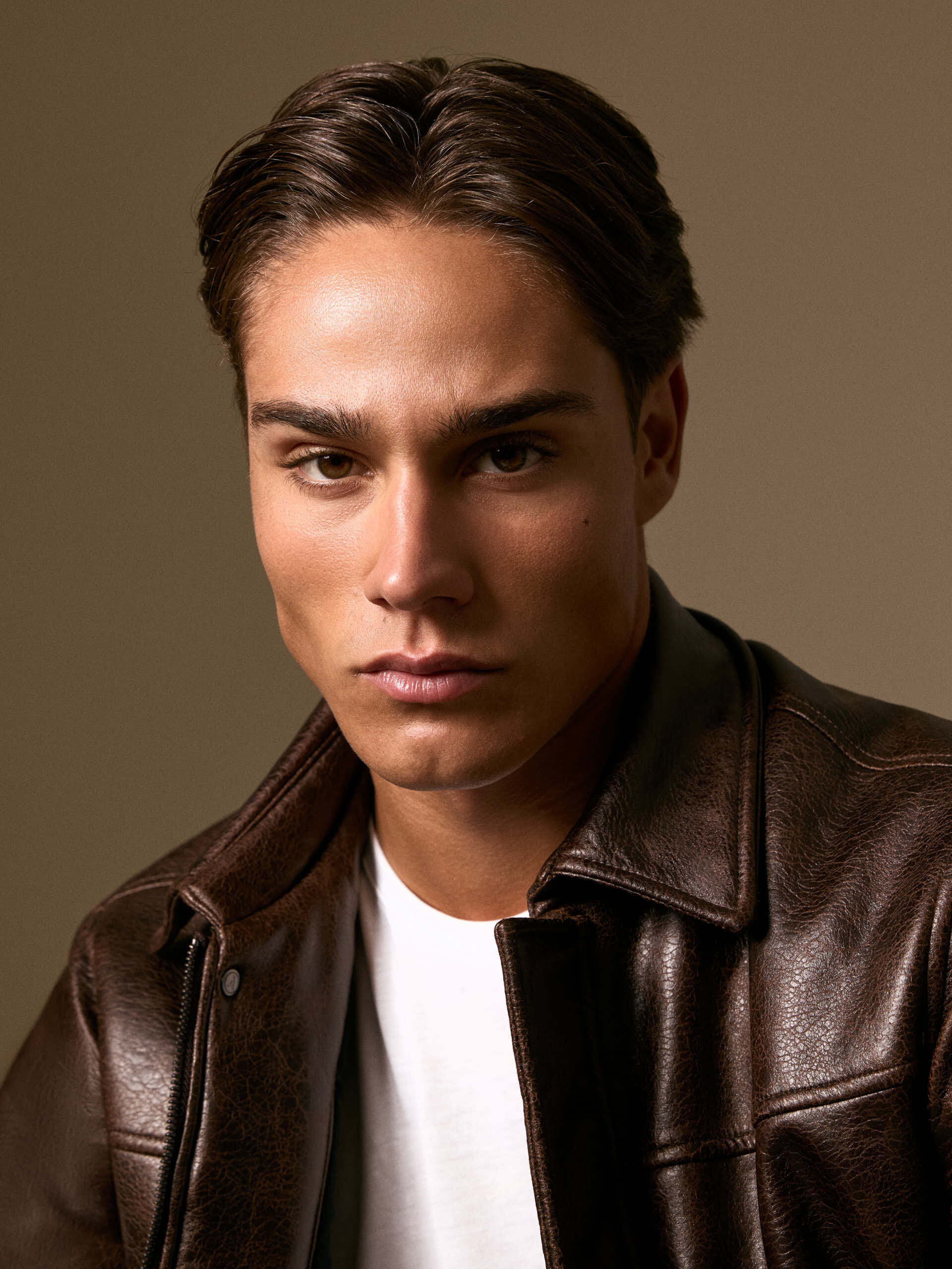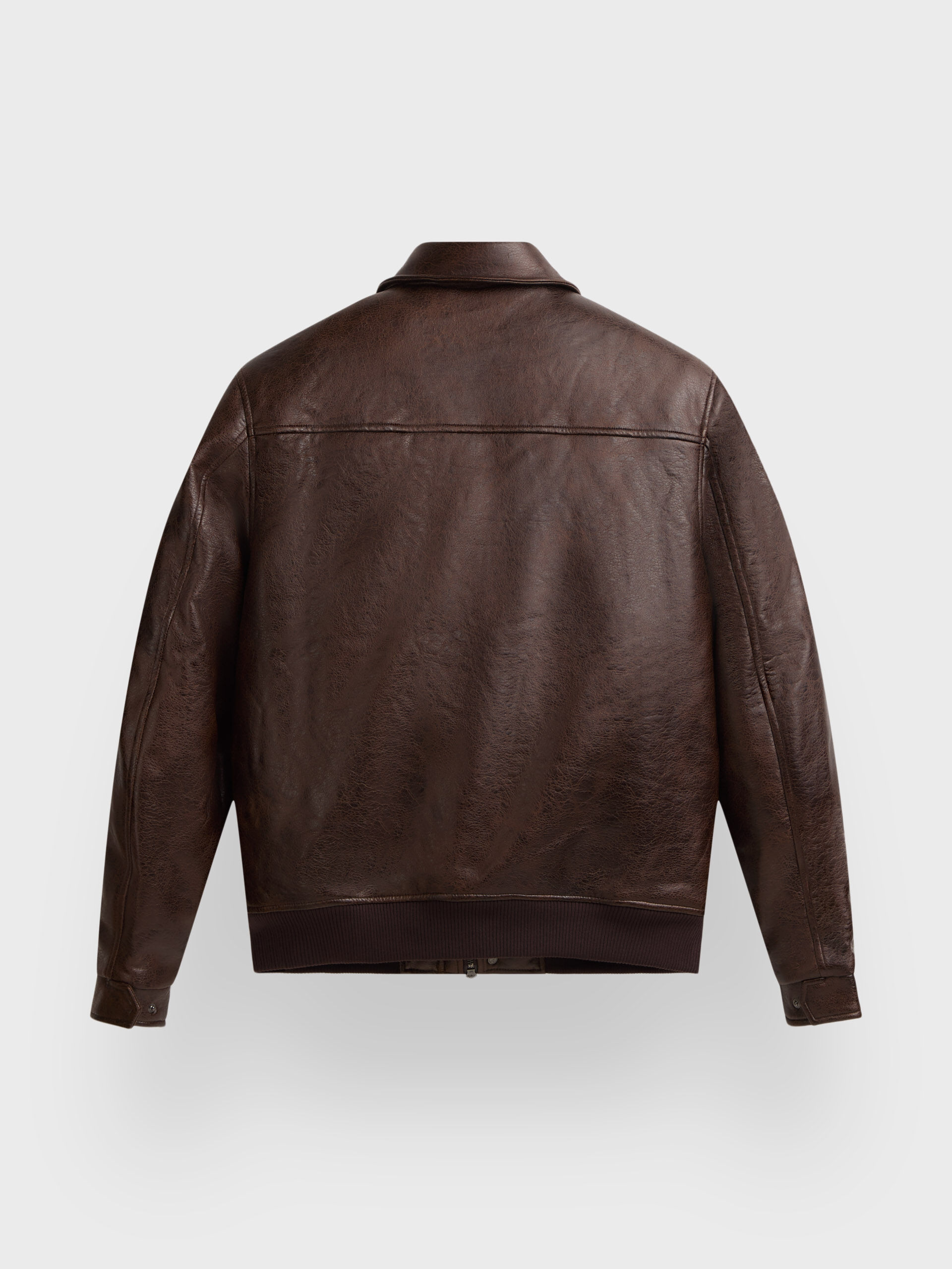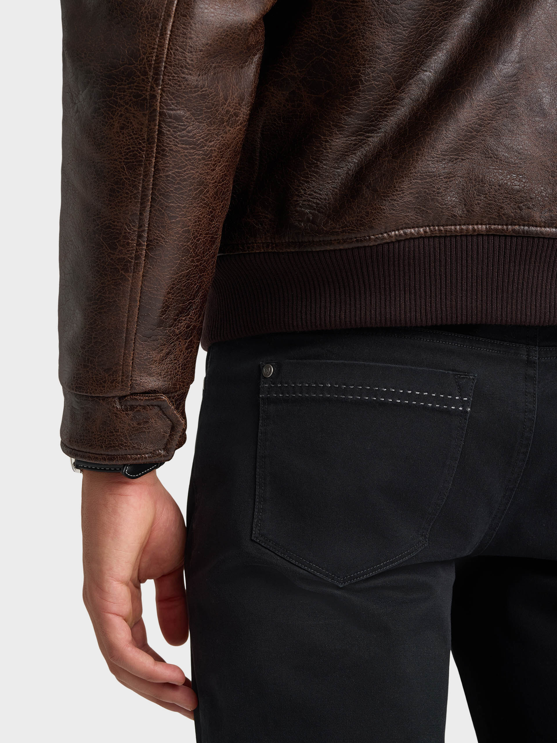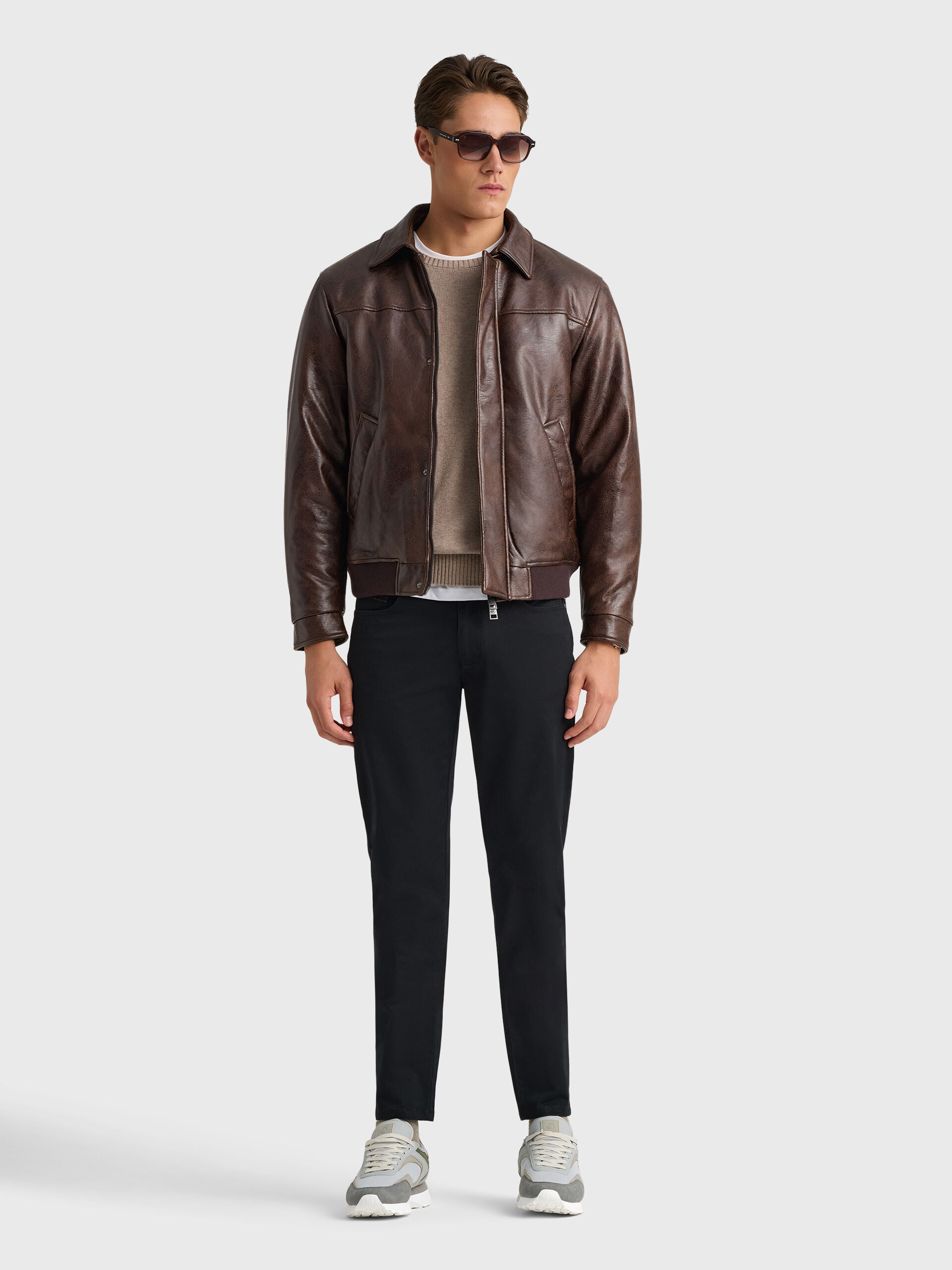 Cazadora confeccionado en efecto piel con cuello de solapa, cierre central mediante cremallera oculta por tapeta de botones a presión, dos bolsillos en la cintura y puños ajustables. Corte regular fit.