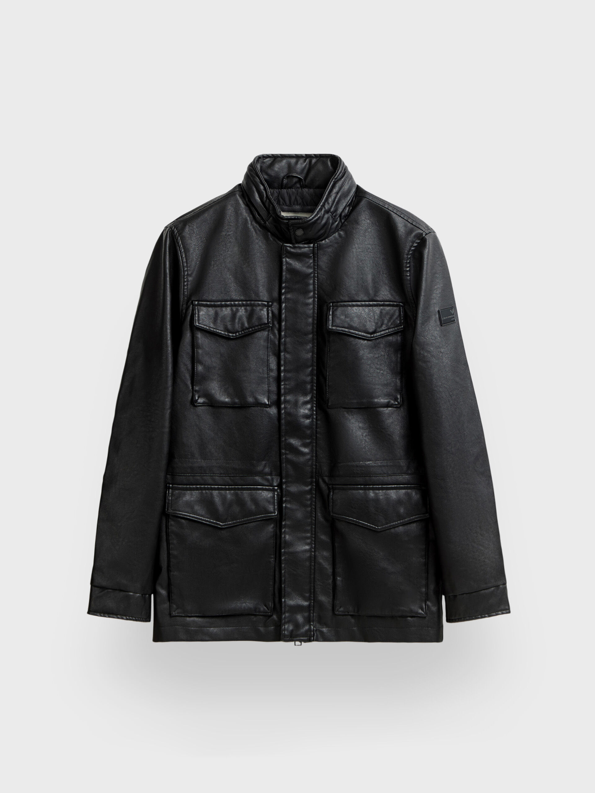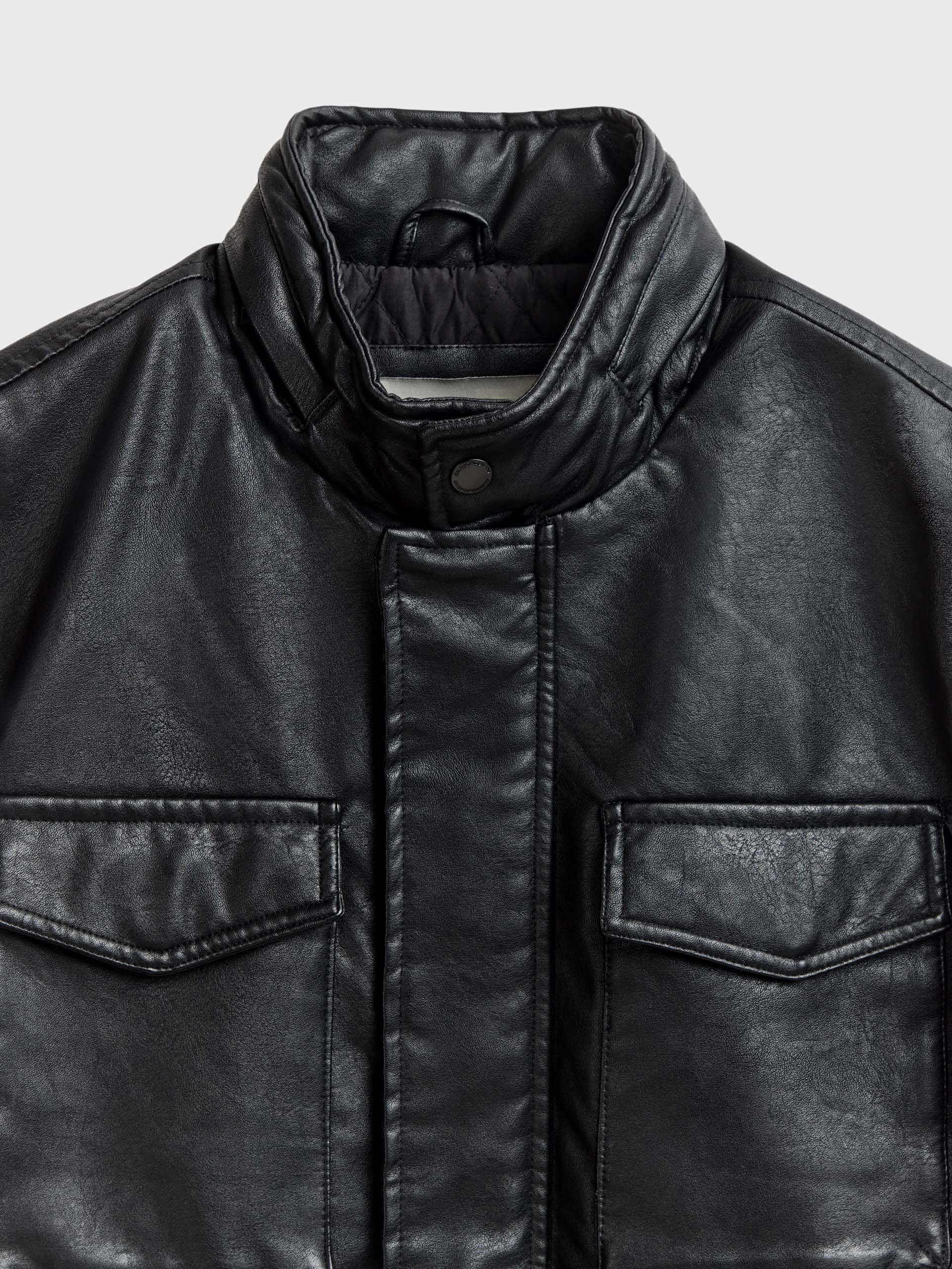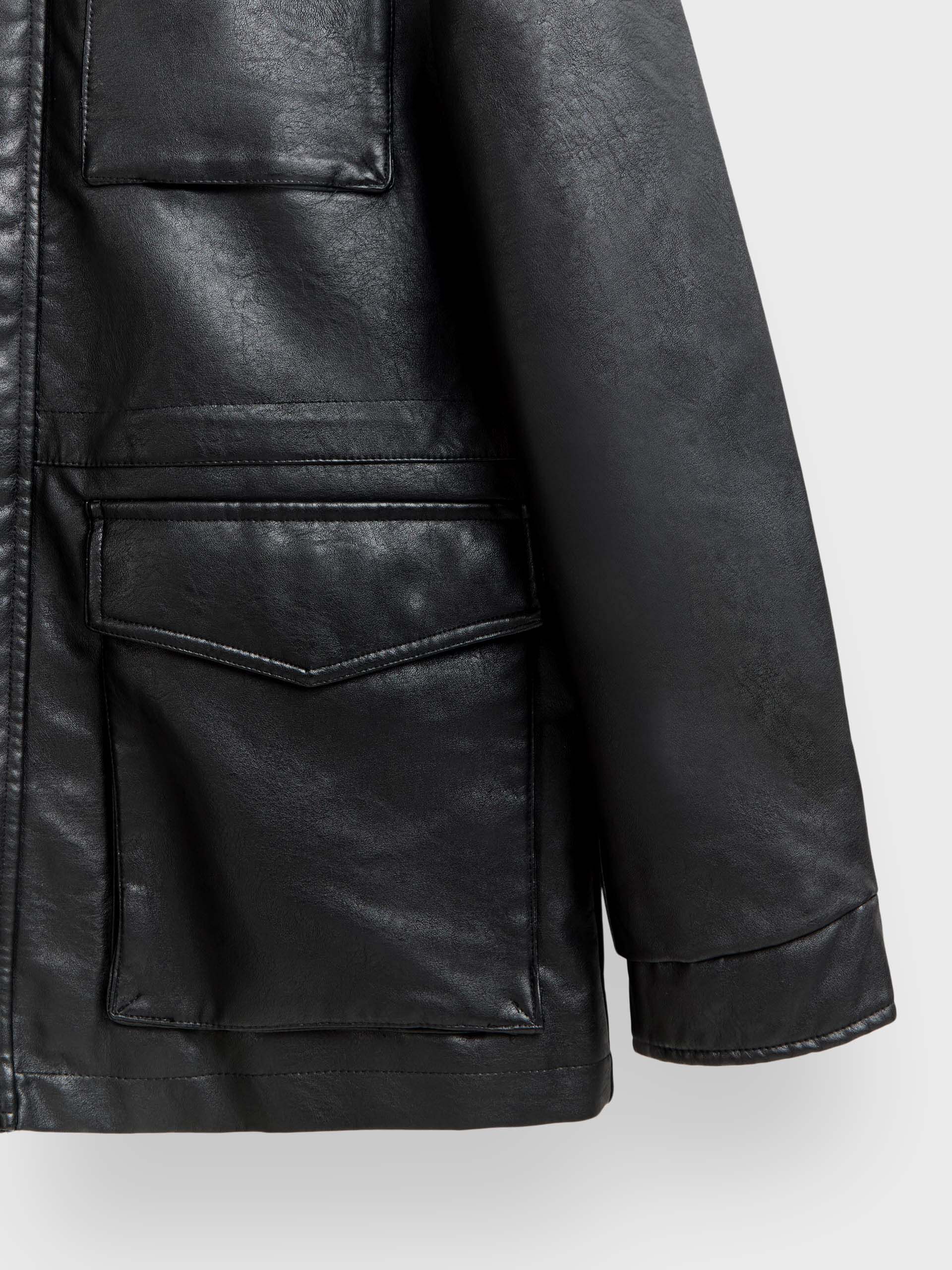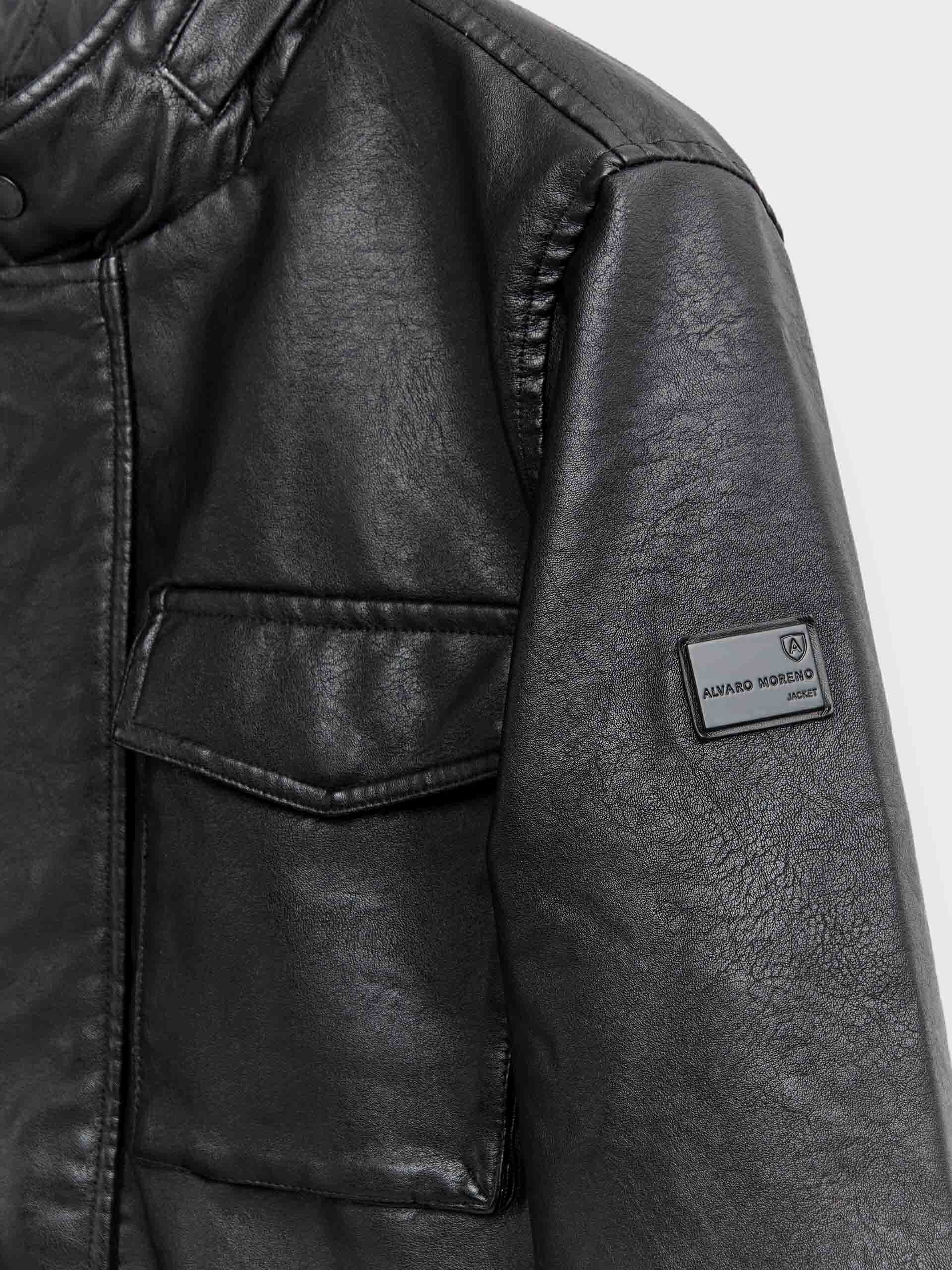 Cazadora confeccionada en símil piel con cuello subido y cuatro bolsillos de solapa en el frontal. Cierre central mediante cremallera oculta por tapeta de botones a presión, manga larga con puños ajustables y detalle personalizado en una de las mangas. Bolsillo en el interior.
