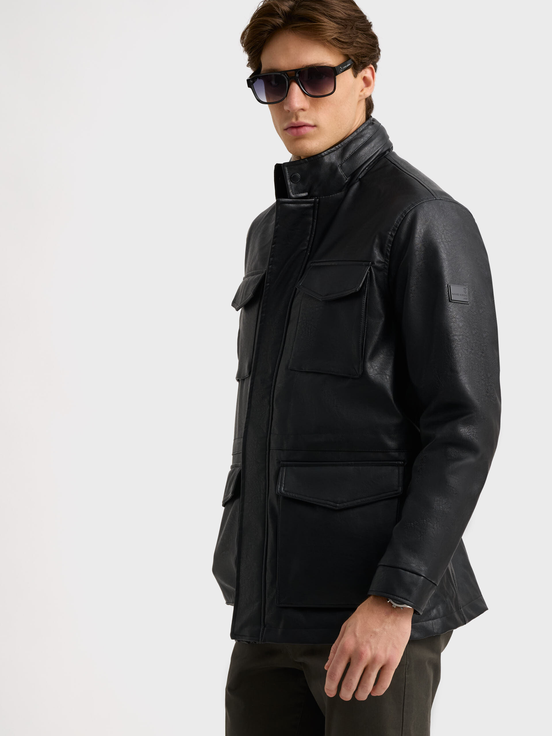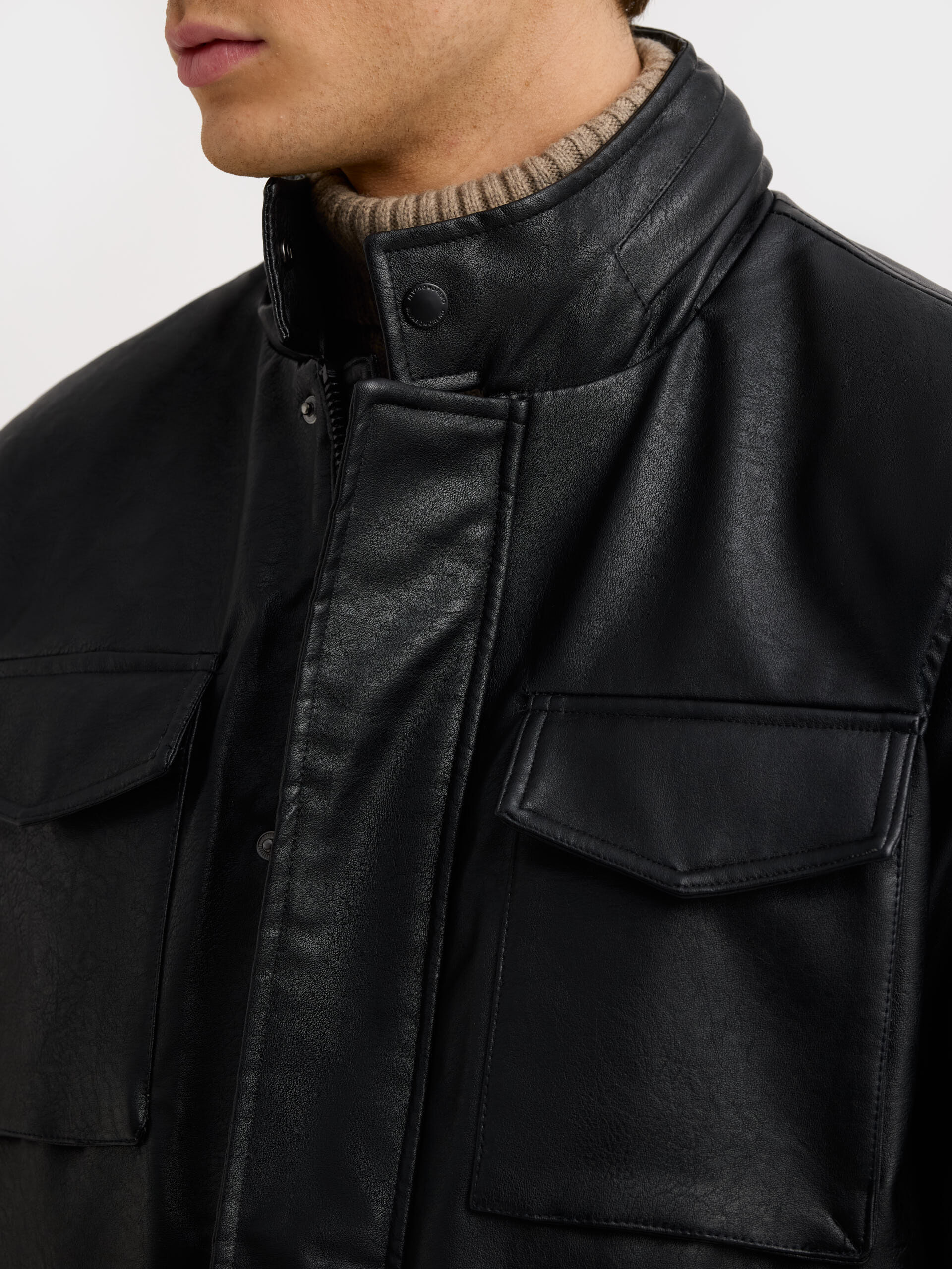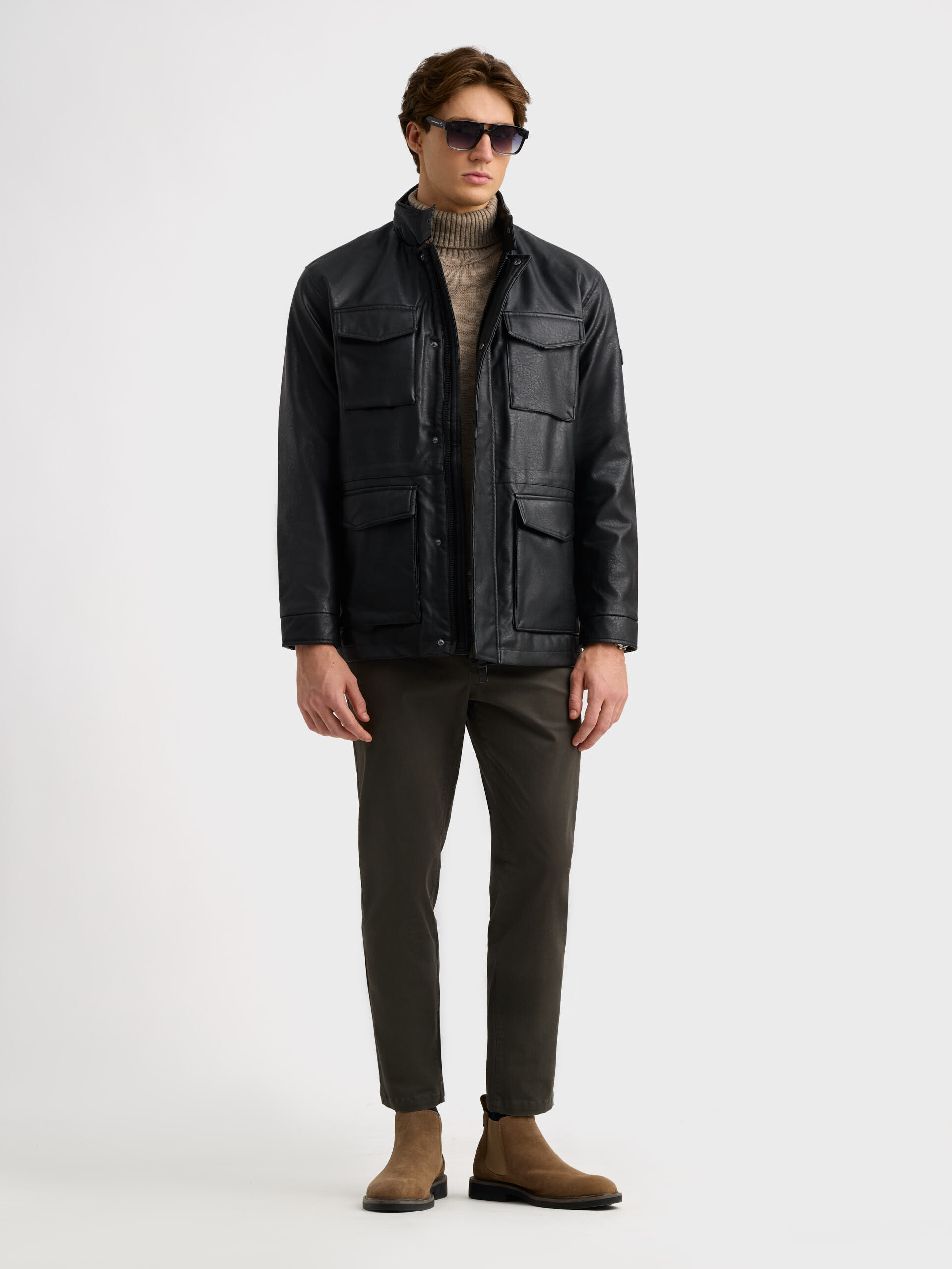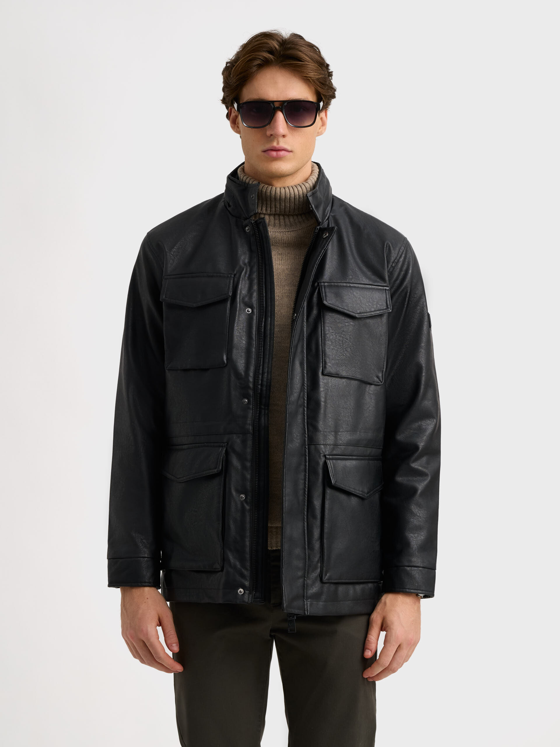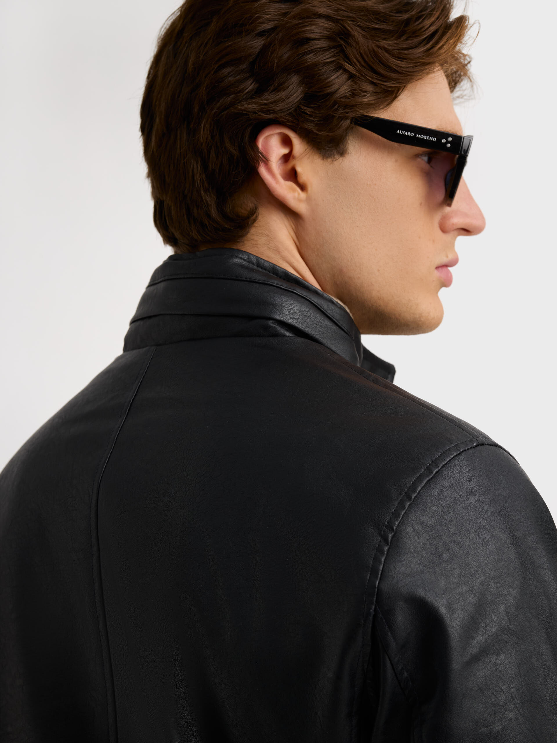 Cazadora confeccionada en símil piel con cuello subido y cuatro bolsillos de solapa en el frontal. Cierre central mediante cremallera oculta por tapeta de botones a presión, manga larga con puños ajustables y detalle personalizado en una de las mangas. Bolsillo en el interior.