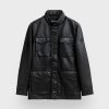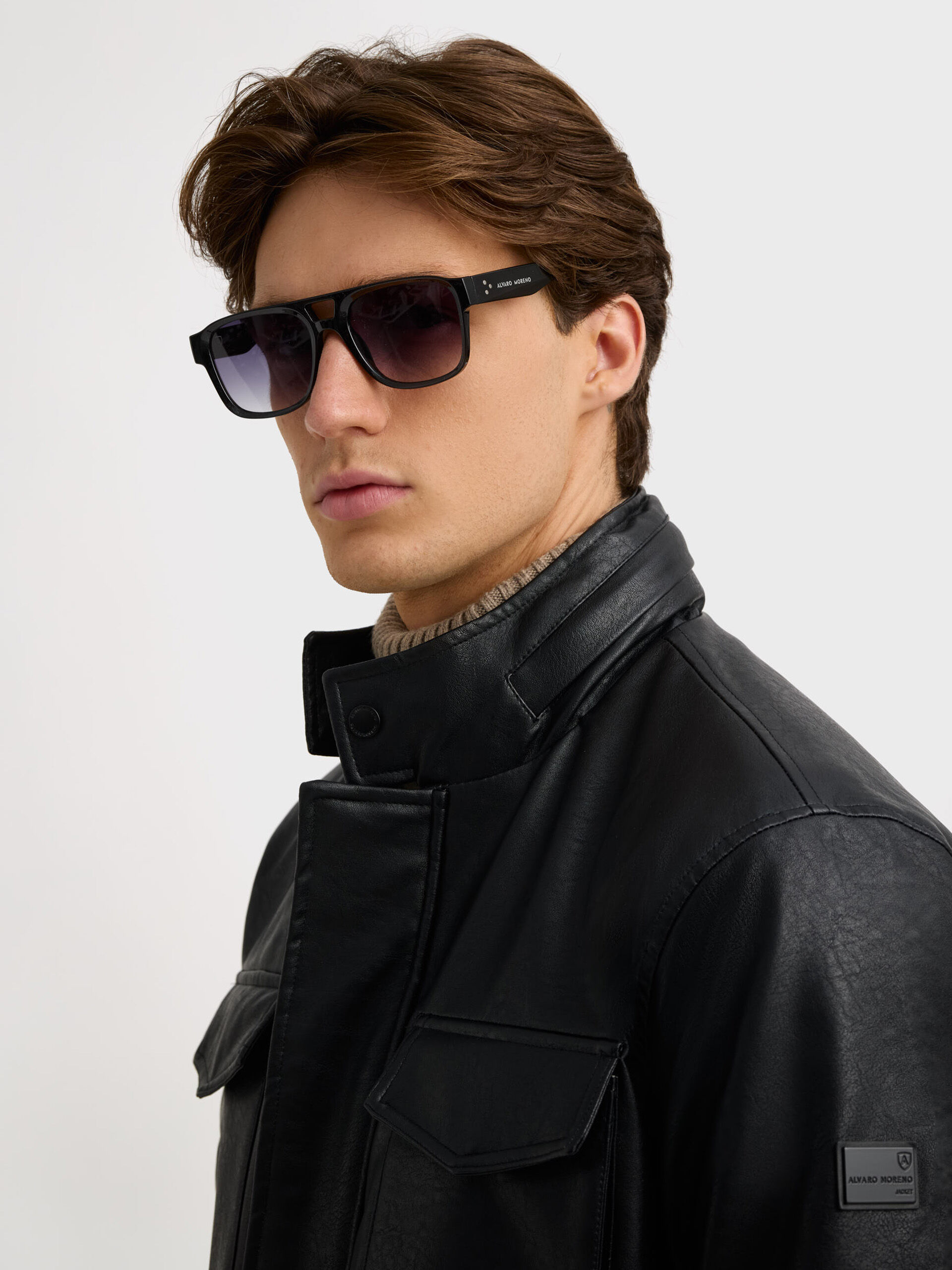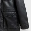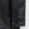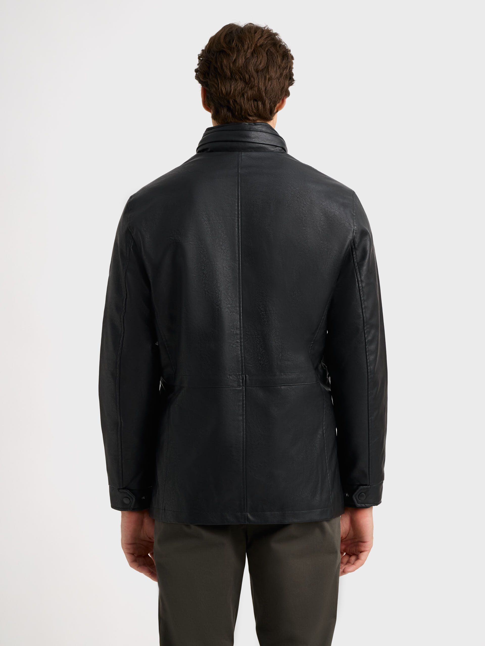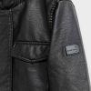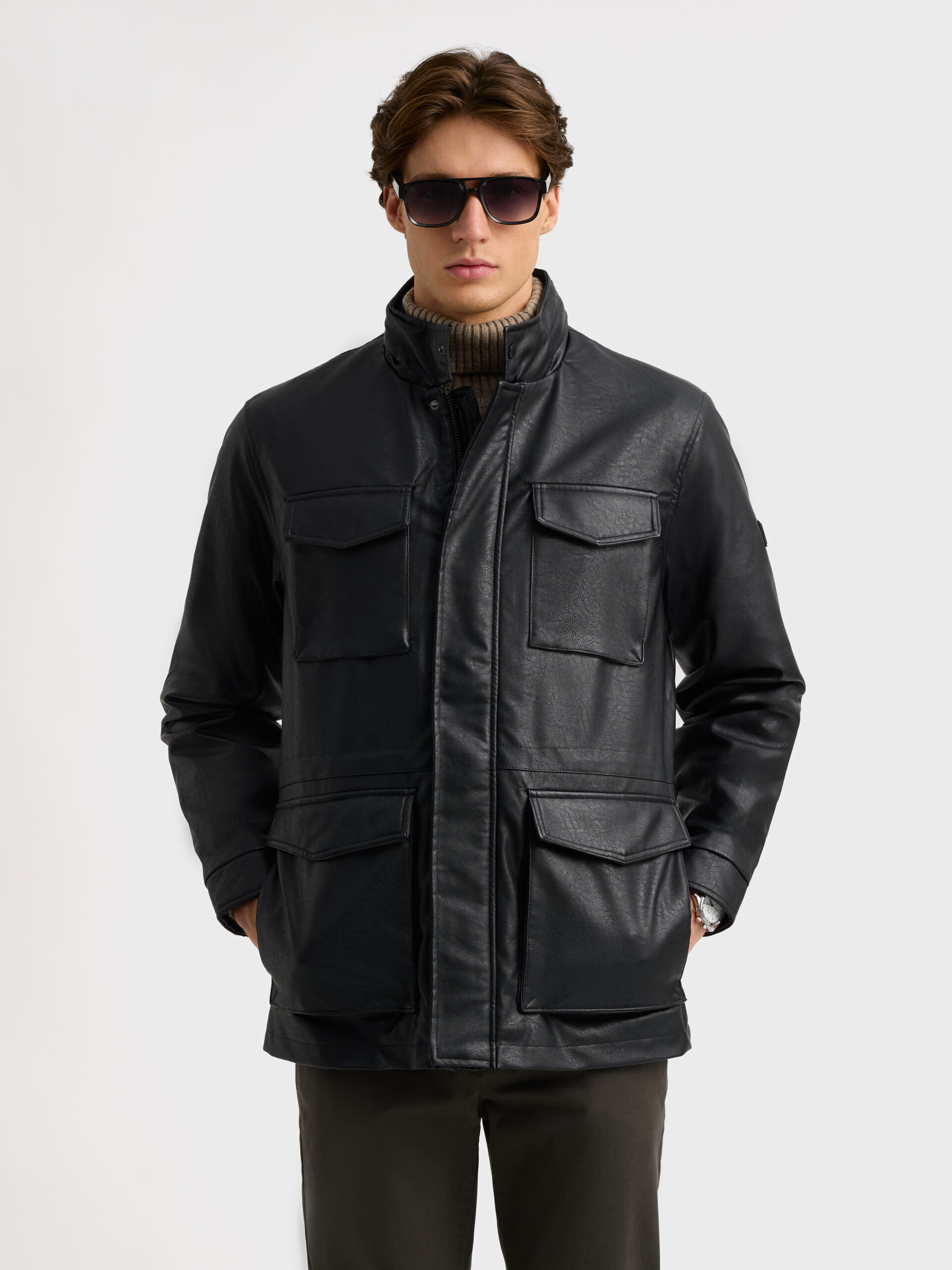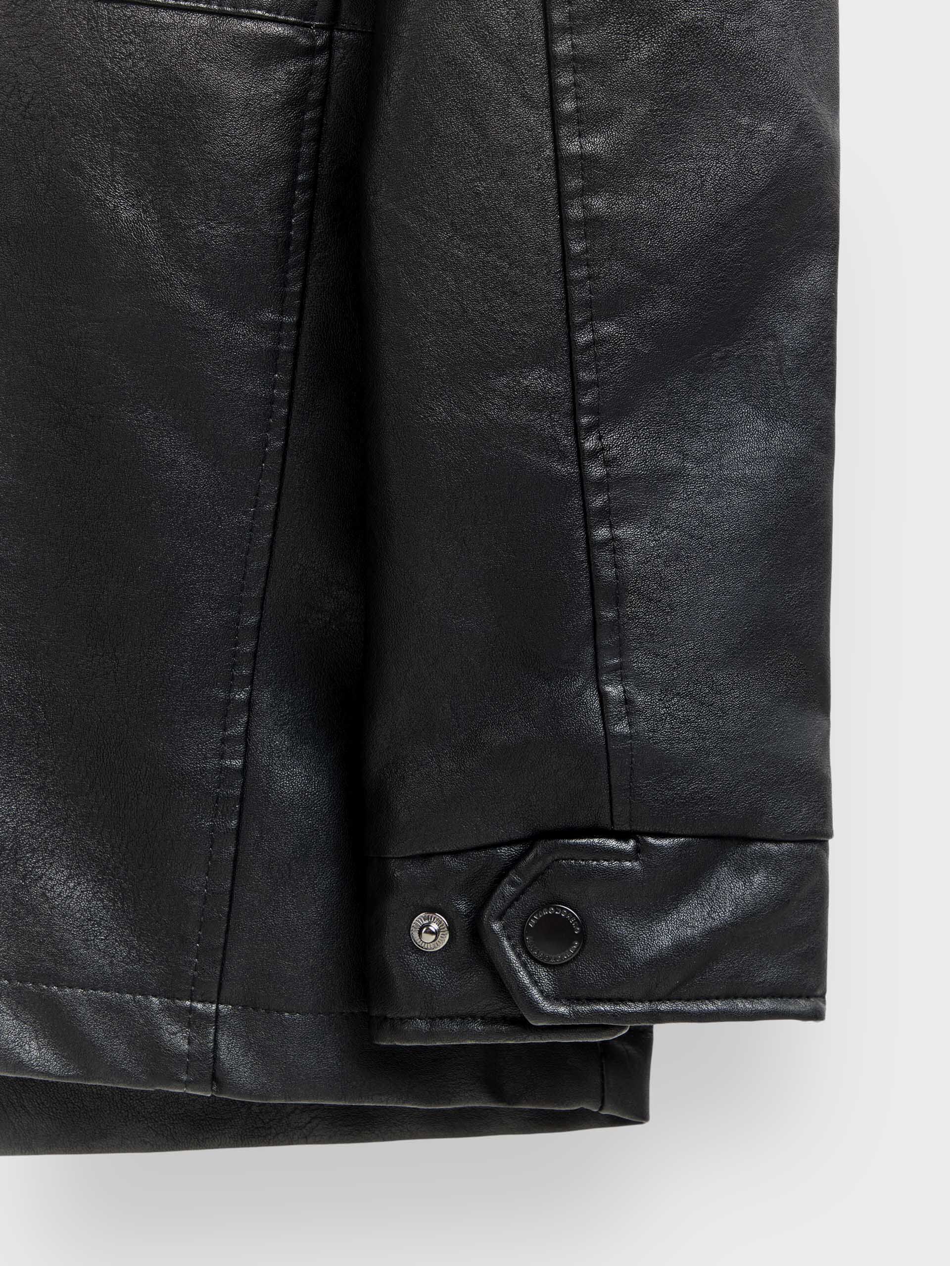 Cazadora confeccionada en símil piel con cuello subido y cuatro bolsillos de solapa en el frontal. Cierre central mediante cremallera oculta por tapeta de botones a presión, manga larga con puños ajustables y detalle personalizado en una de las mangas. Bolsillo en el interior.