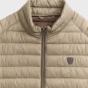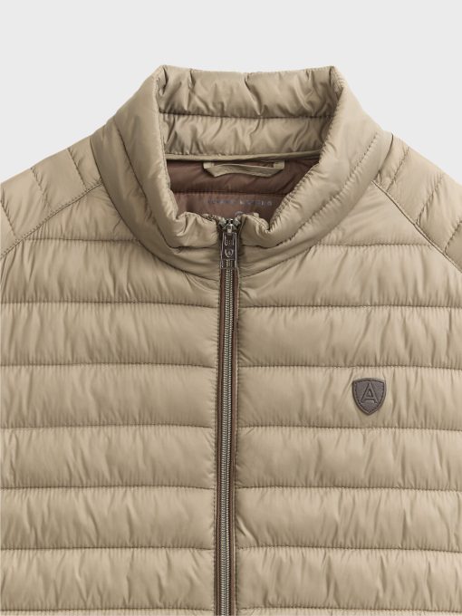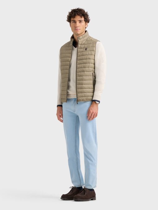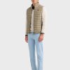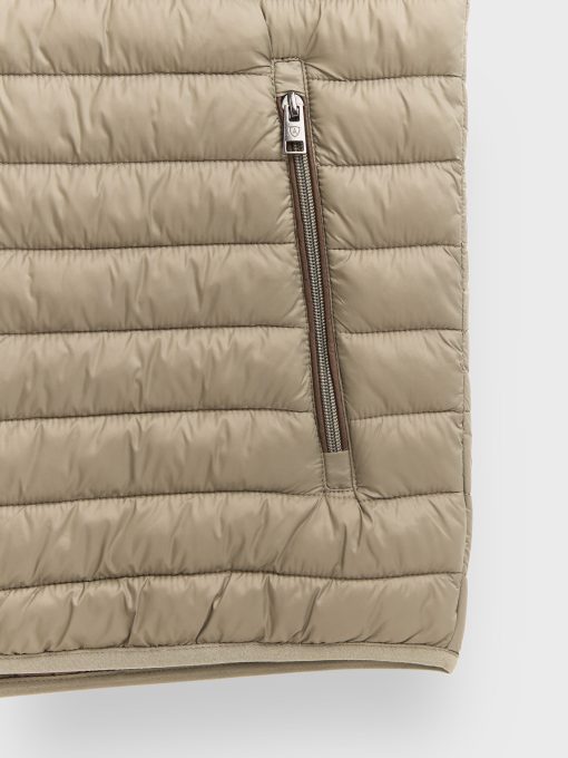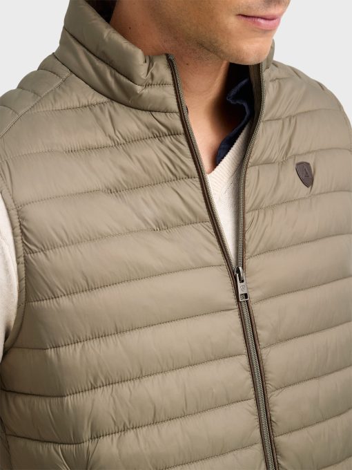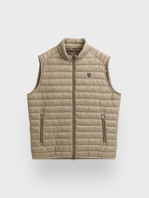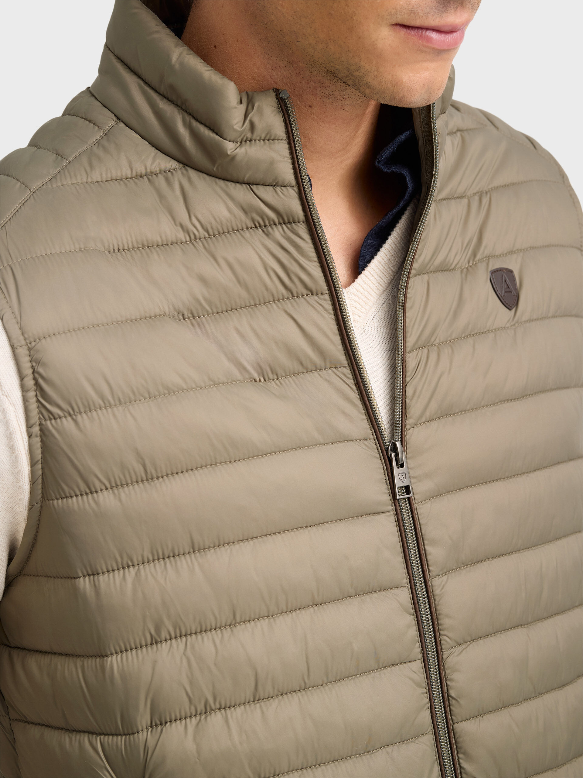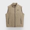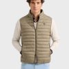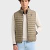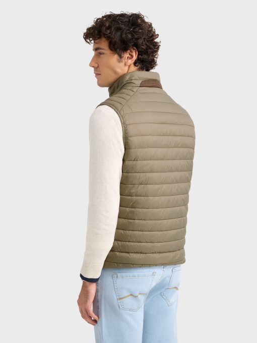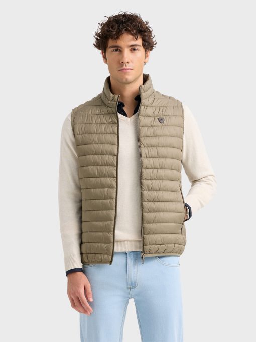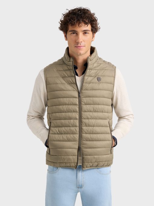 Chaleco acolchado con cuello subido. Cierre central mediante doble cremallera, dos bolsillo a la altura de la cintura y logo de la marca grabado en el pecho. Elástico en la sisa y cintura. Detalle a contraste en la parte trasera del cuello.