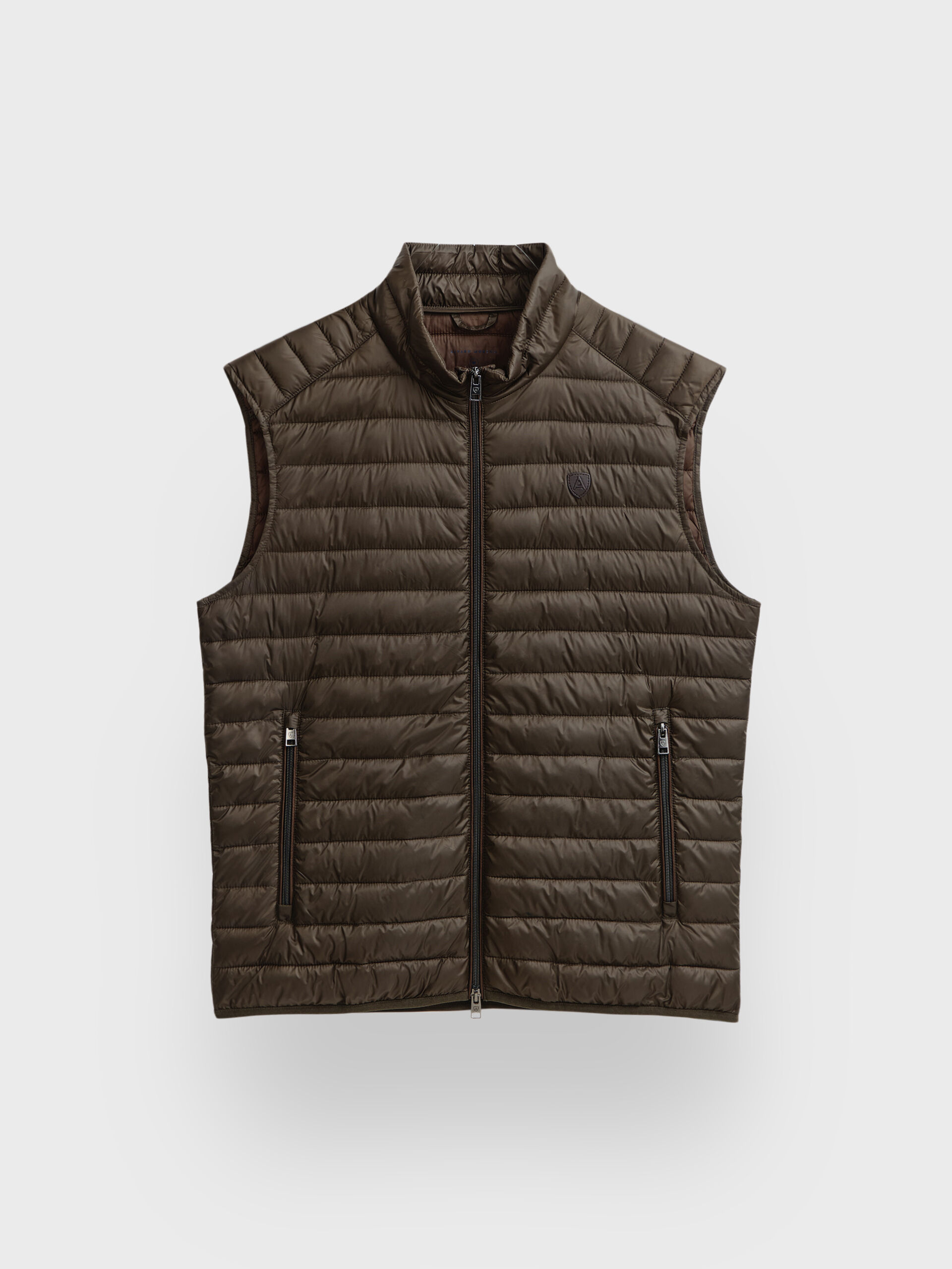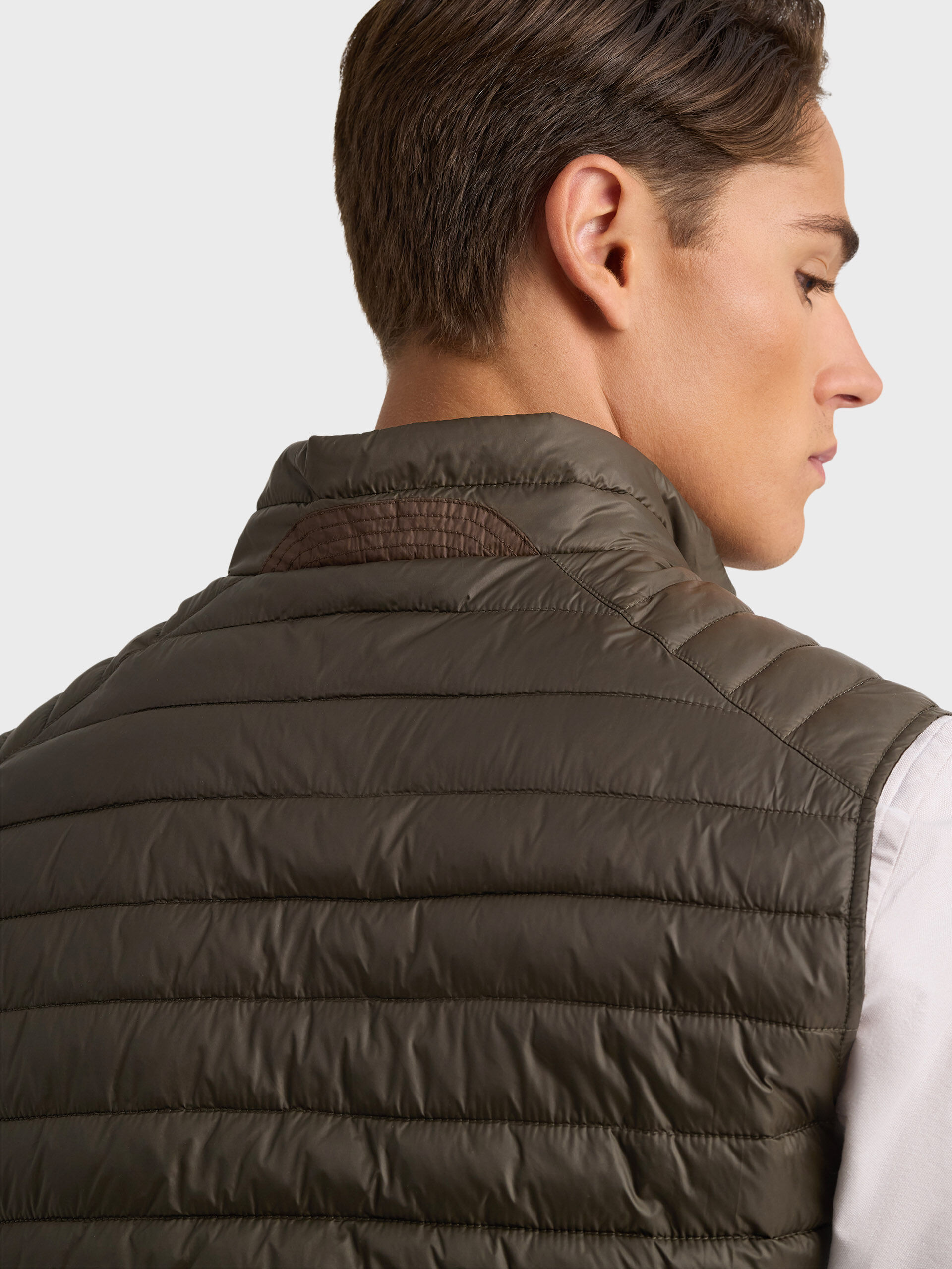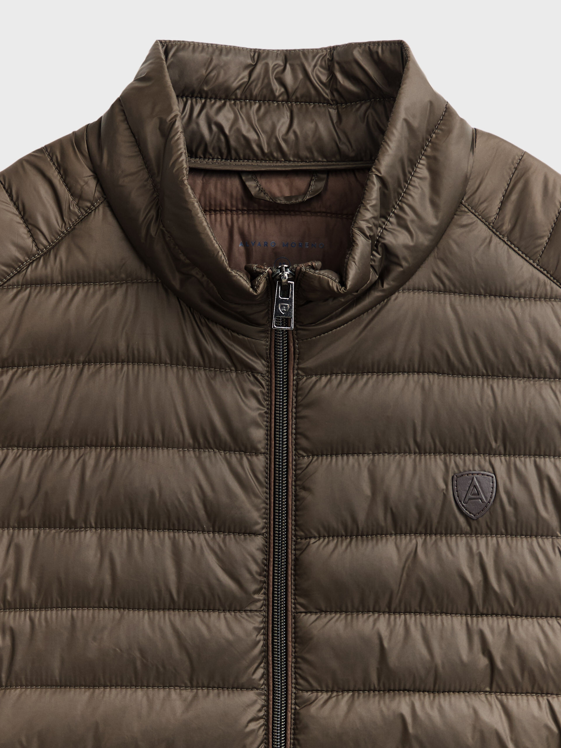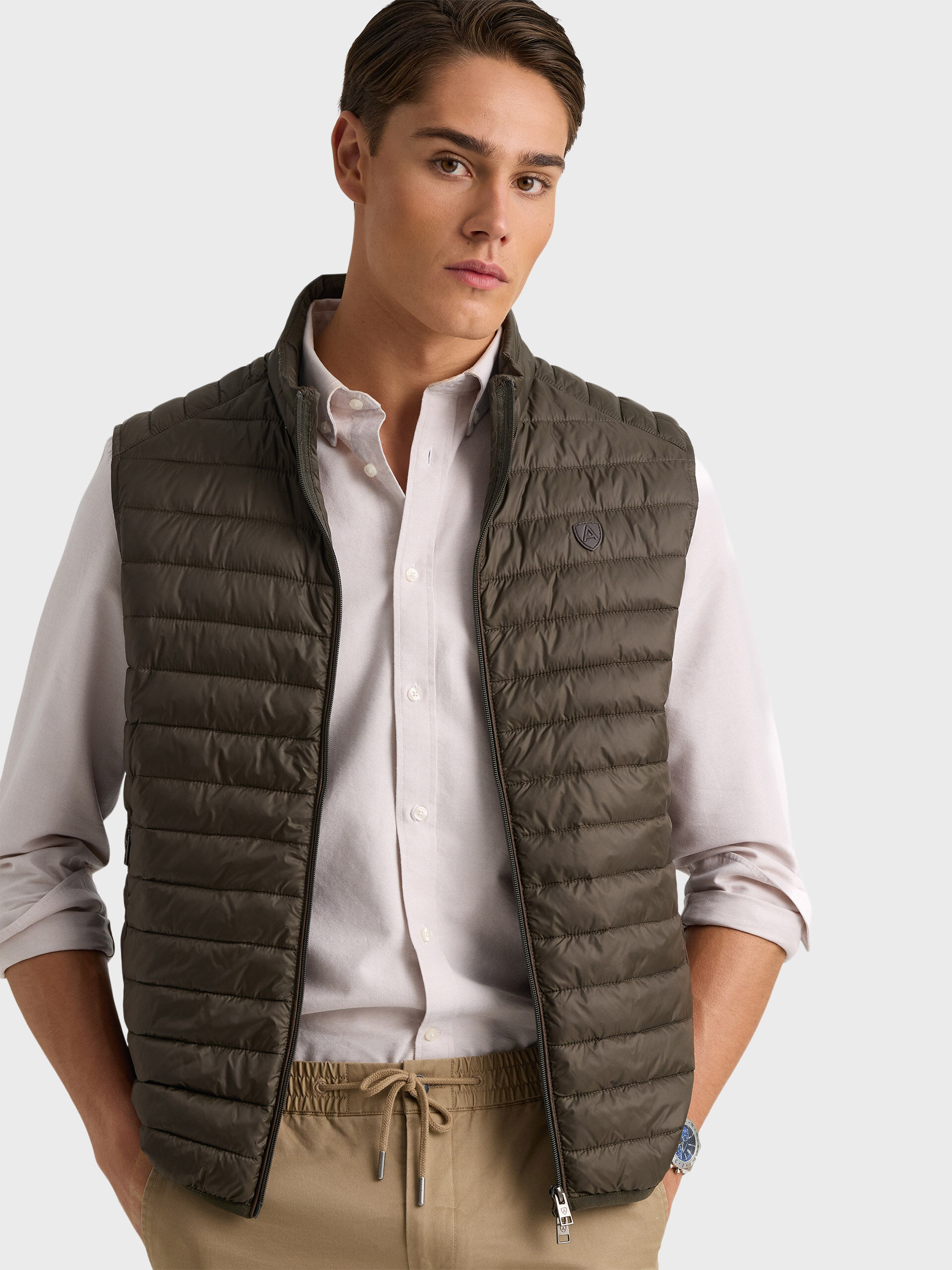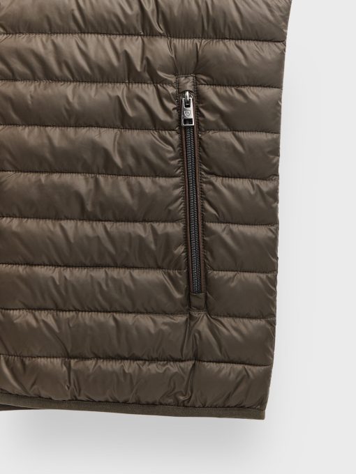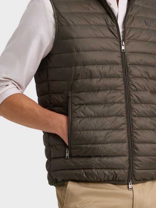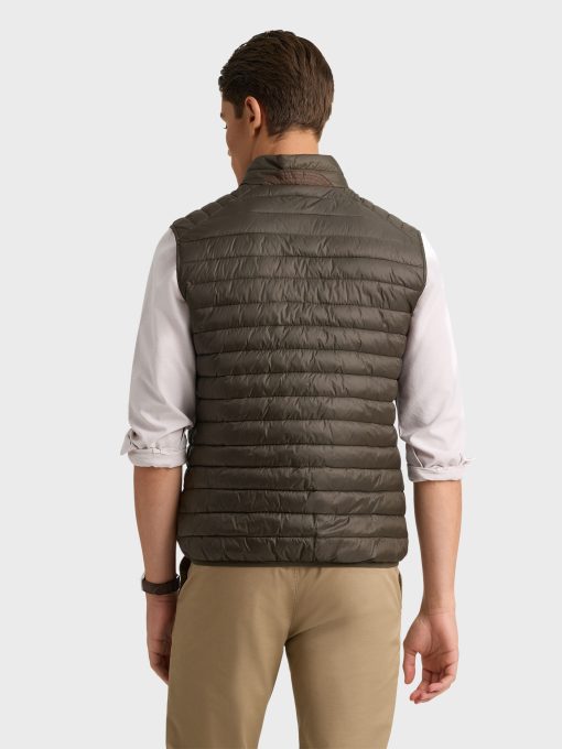 Chaleco acolchado con cuello subido. Cierre central mediante doble cremallera, dos bolsillo a la altura de la cintura y logo de la marca grabado en el pecho. Elástico en la sisa y cintura. Detalle a contraste en la parte trasera del cuello.
