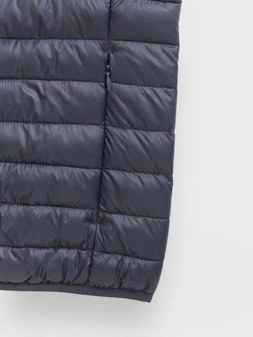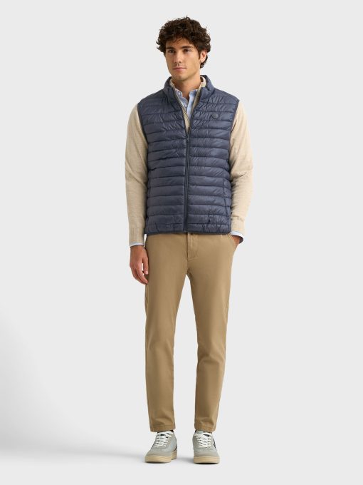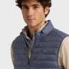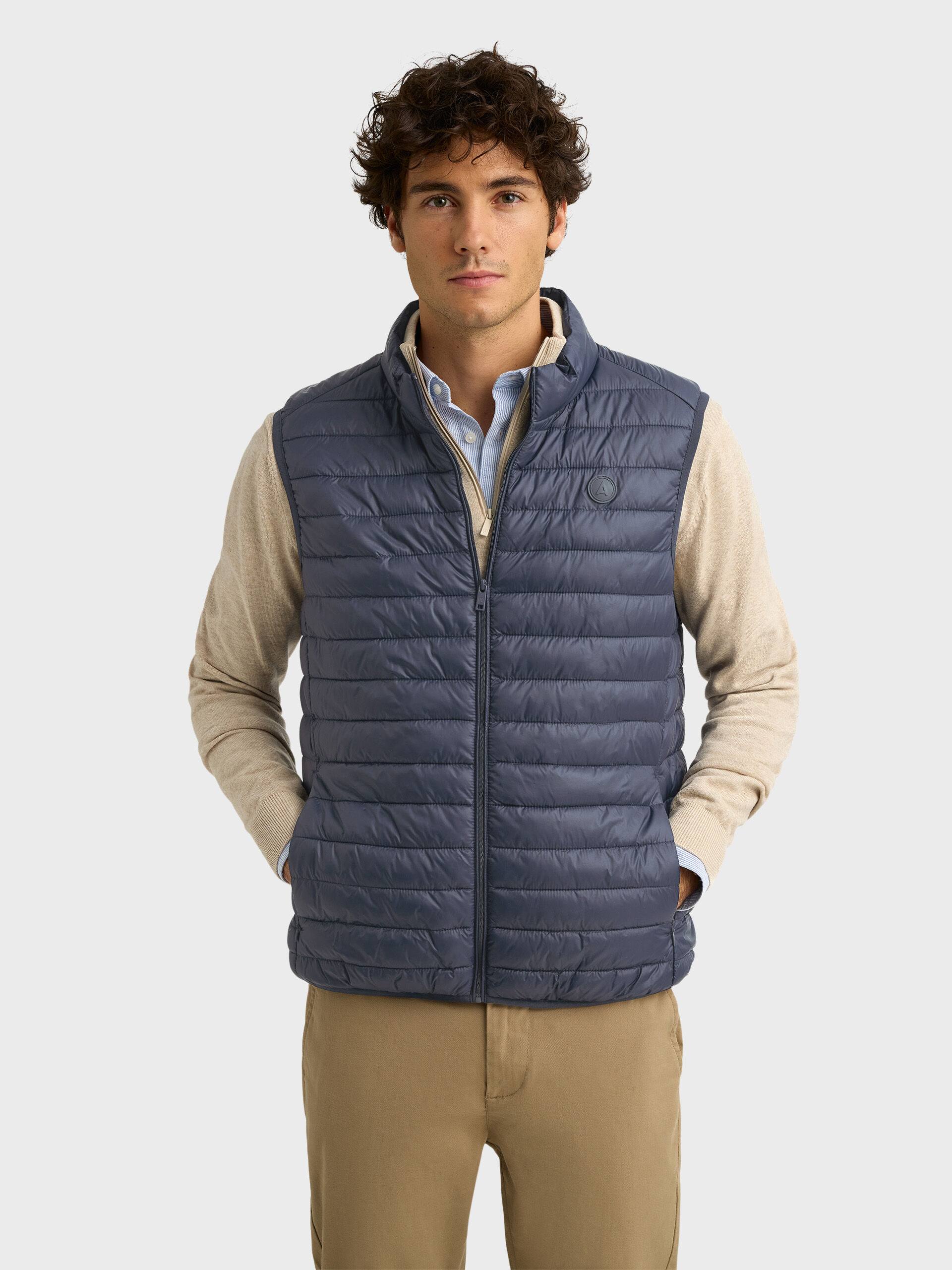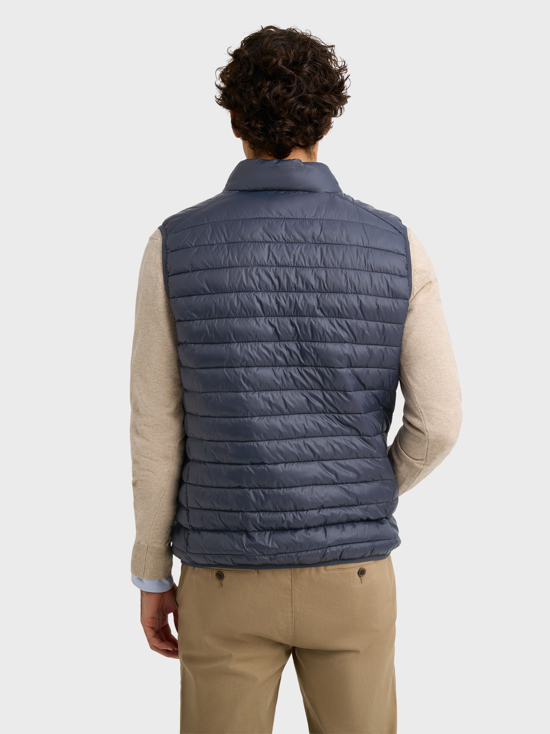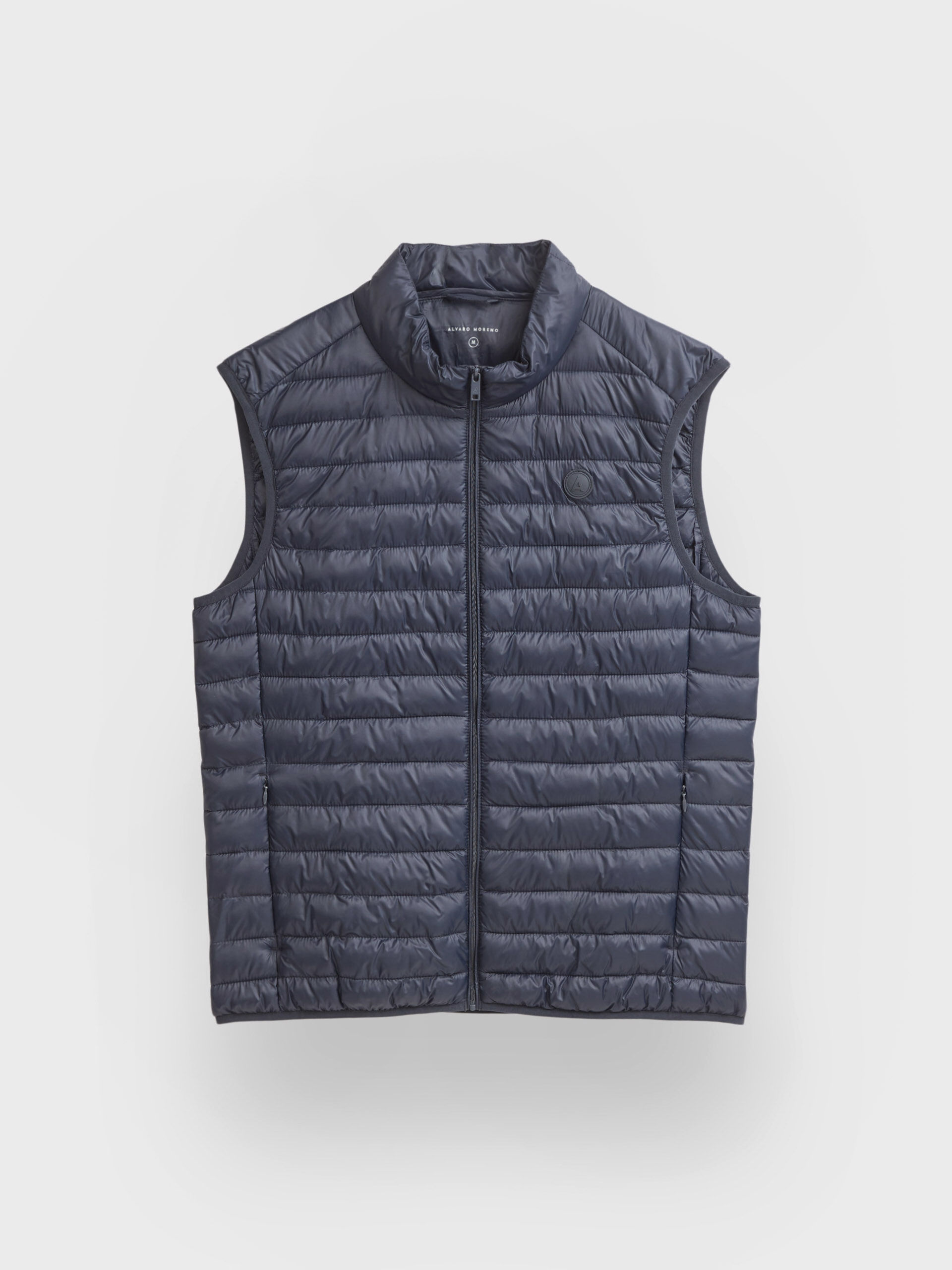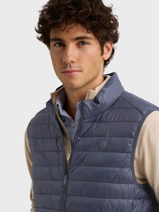 Chaleco acolchado de corte regular fit. Cuello subido, cierre central mediante cremallera, dos bolsillos a la altura de la cintura y logo de la marca grabado en el pecho. Elástico en la sisa y cintura. Bolsillo en el interior.