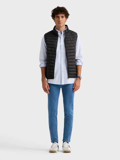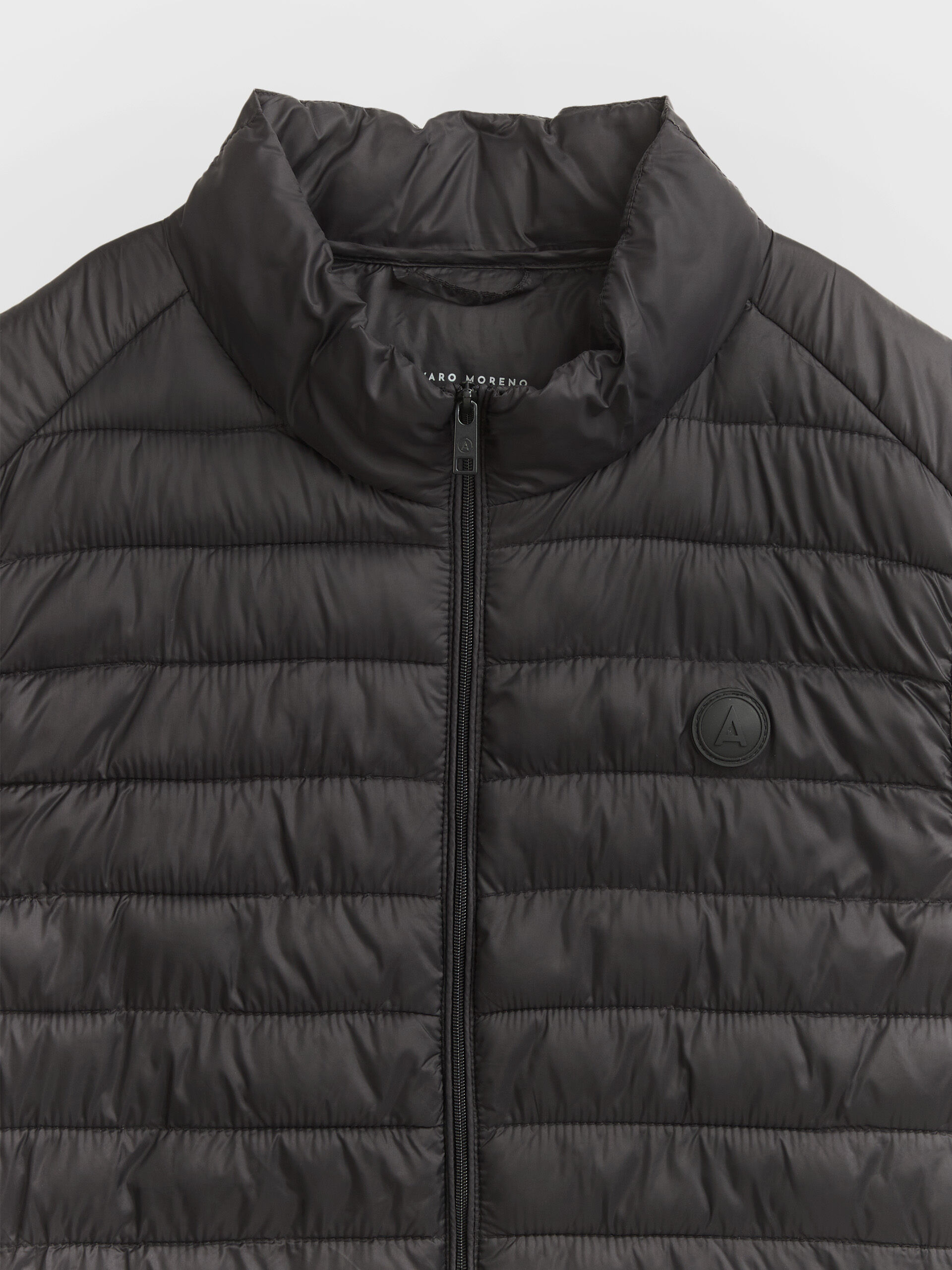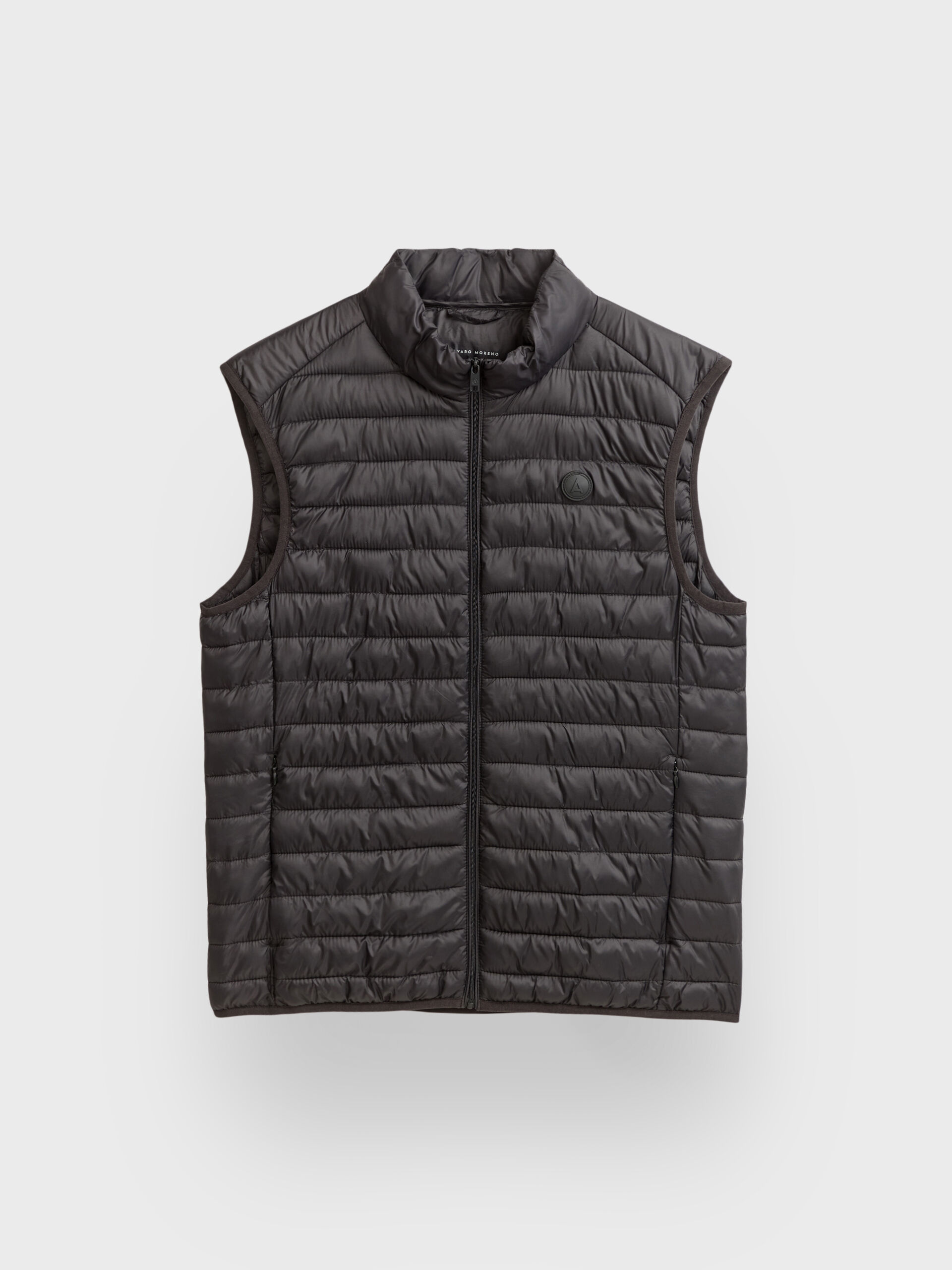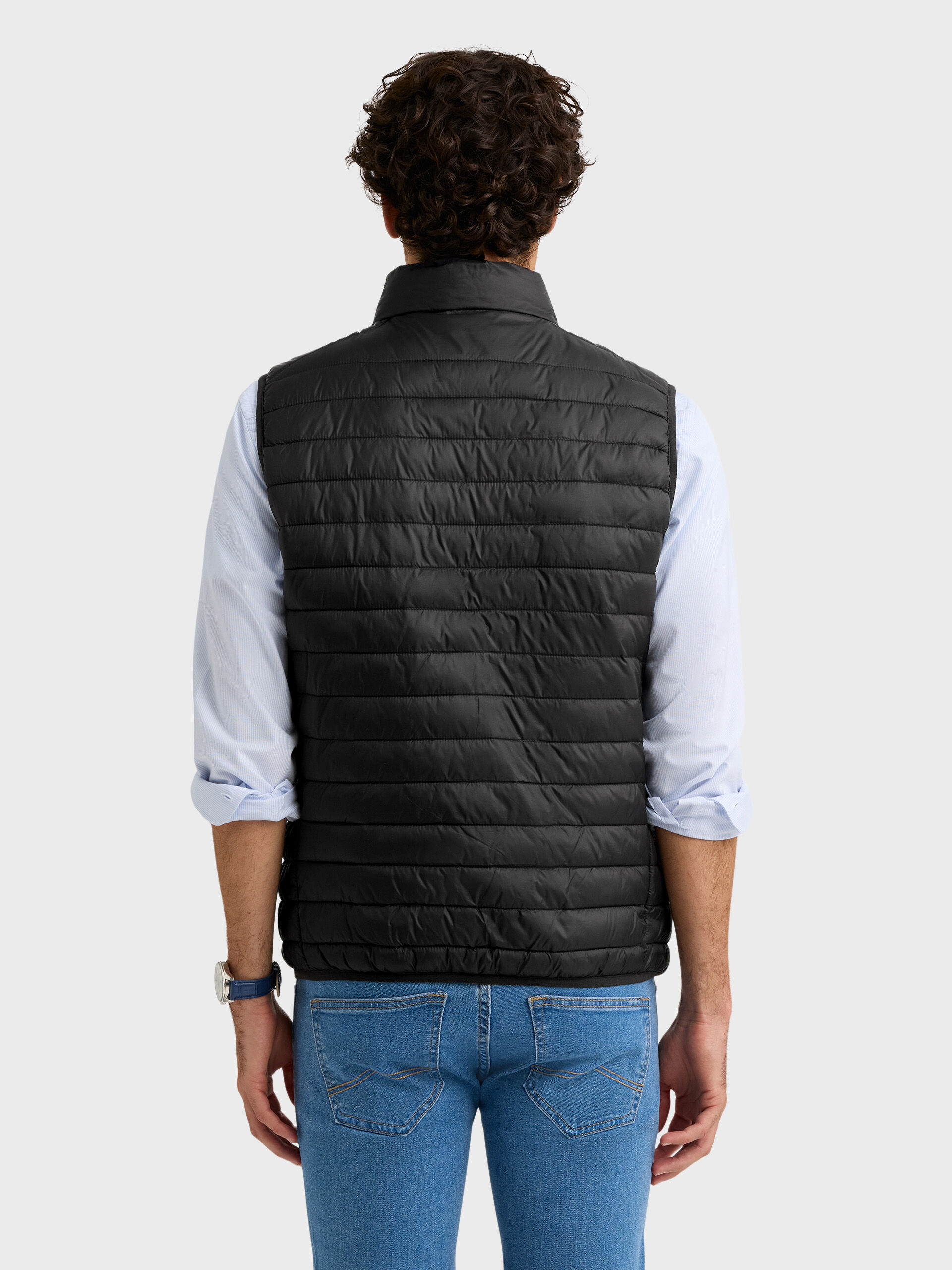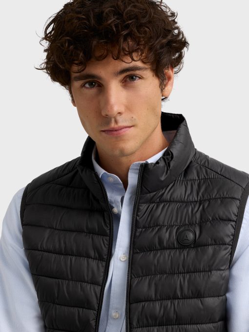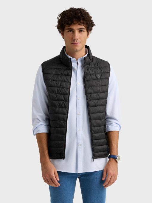 Chaleco acolchado de corte regular fit. Cuello subido, cierre central mediante cremallera, dos bolsillos a la altura de la cintura y logo de la marca grabado en el pecho. Elástico en la sisa y cintura. Bolsillo en el interior.