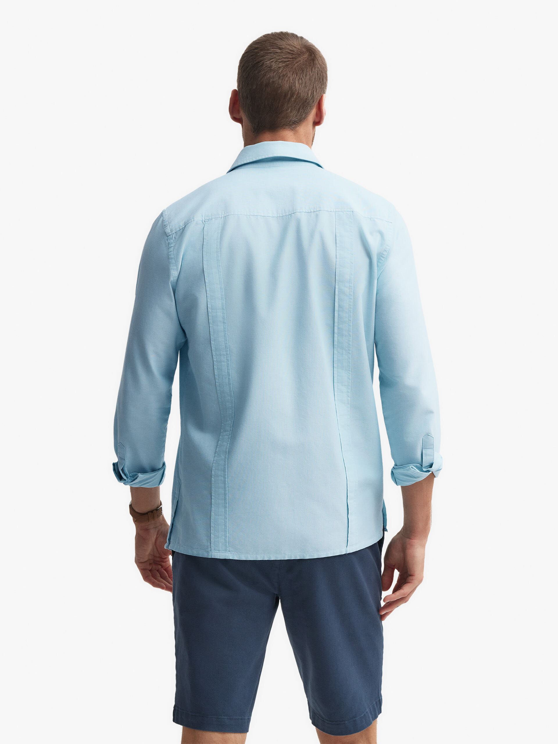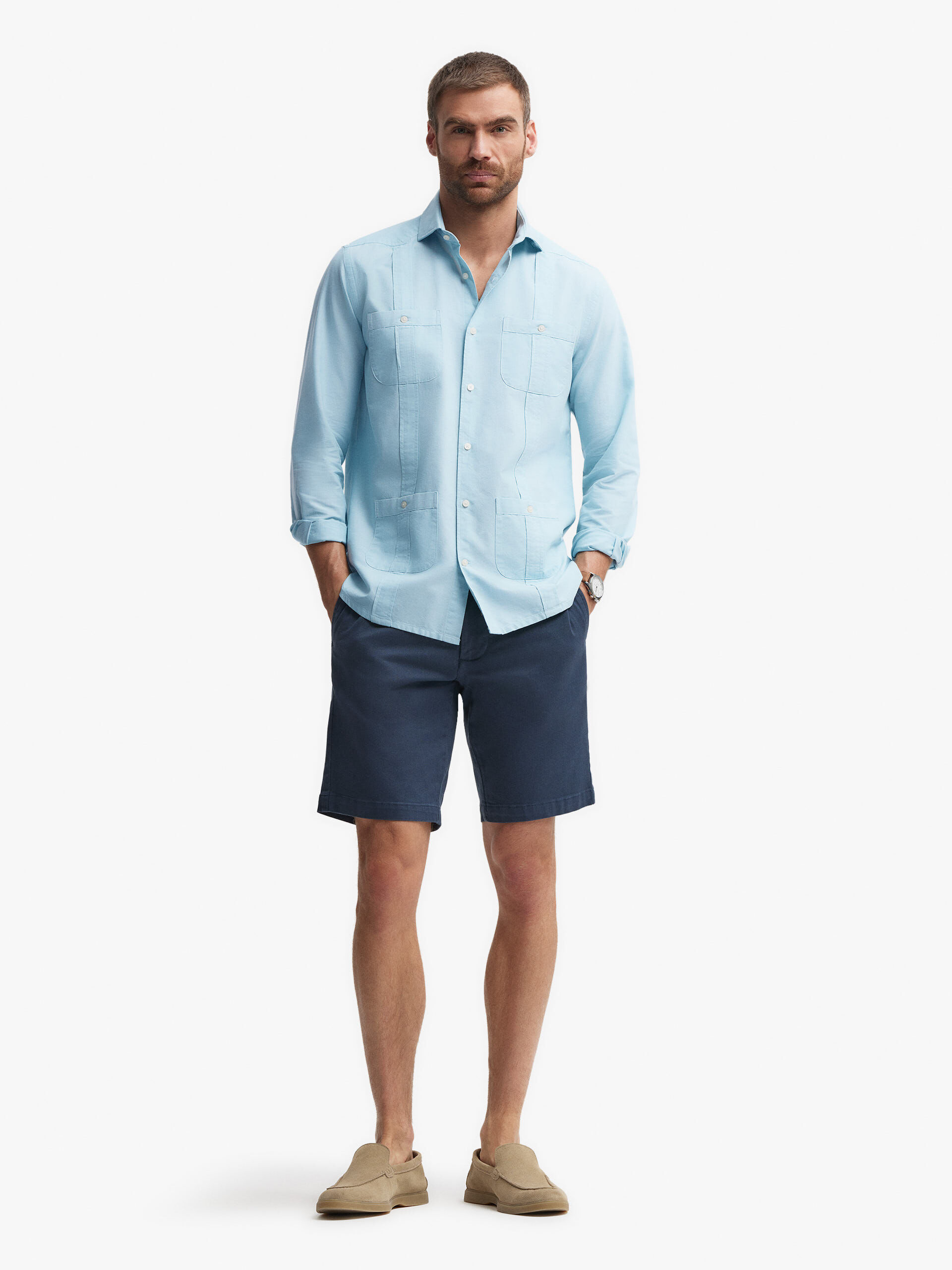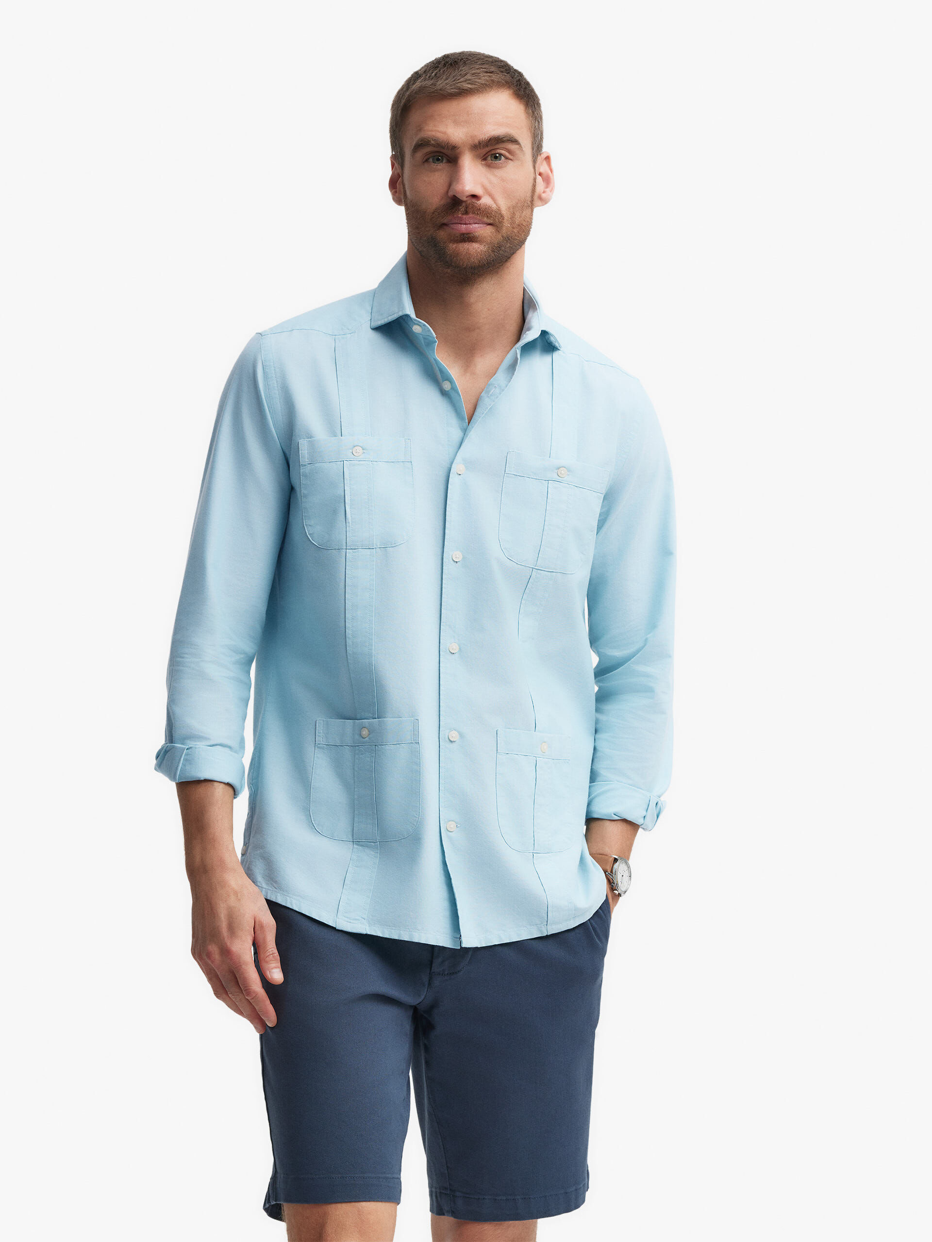 Camisa estilo cubana con cuatro bolsillos en el frontal confeccionada en algodón. Cuello de solapa, manga larga con terminación de botones y abertura en el bajo con cierre de botón. Corte regular fit.