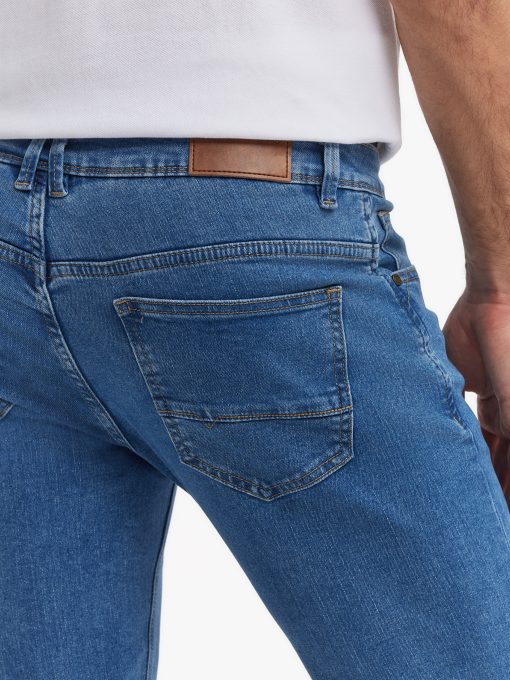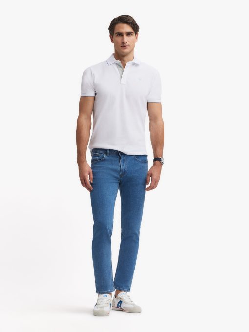 Pantalón denim de corte regular fit con cinco bolsillos y cierre central mediante botón y cremallera, pespuntes en color camel, fornituras personalizadas y etiqueta en efecto piel en la cinturilla.