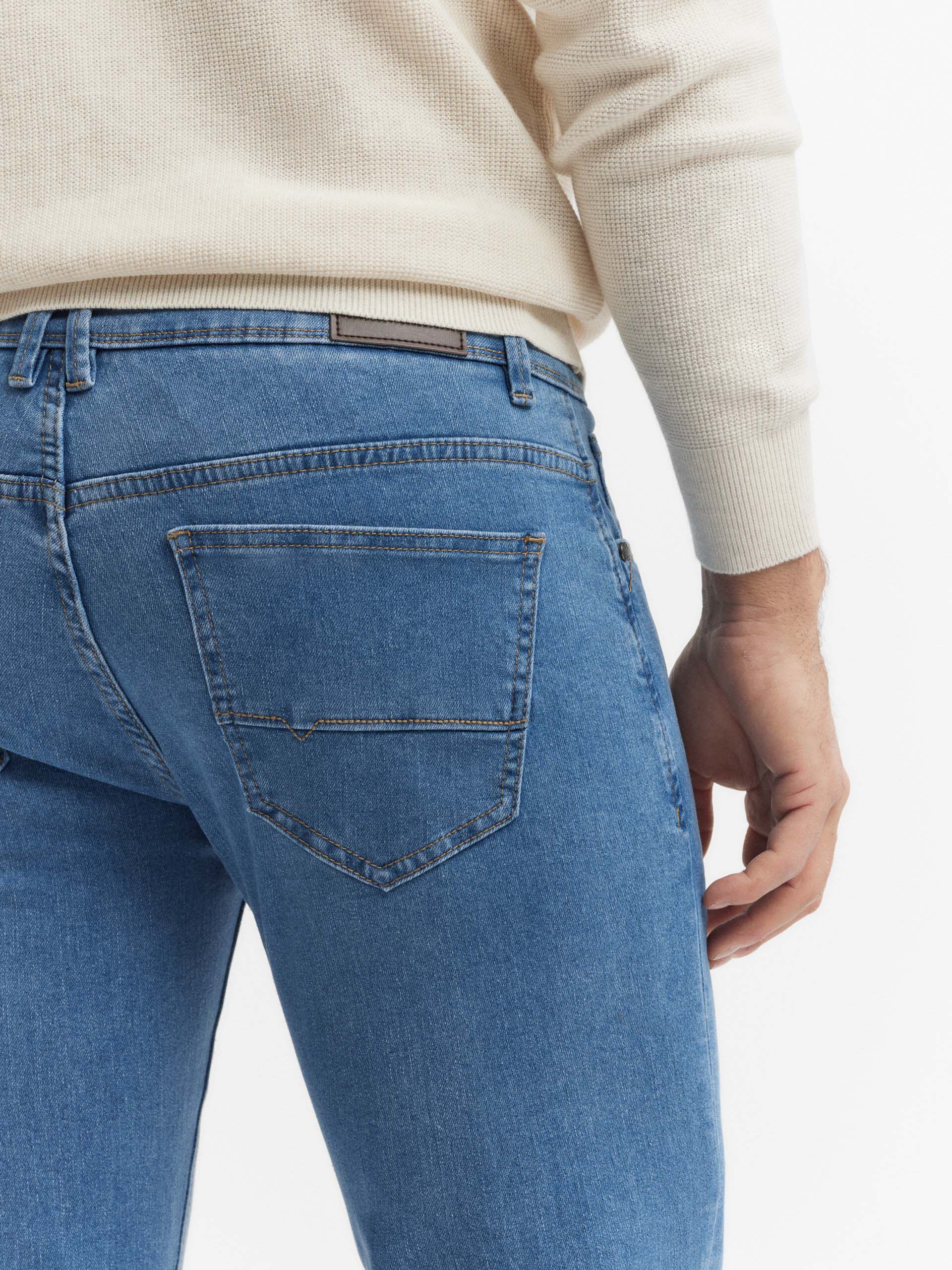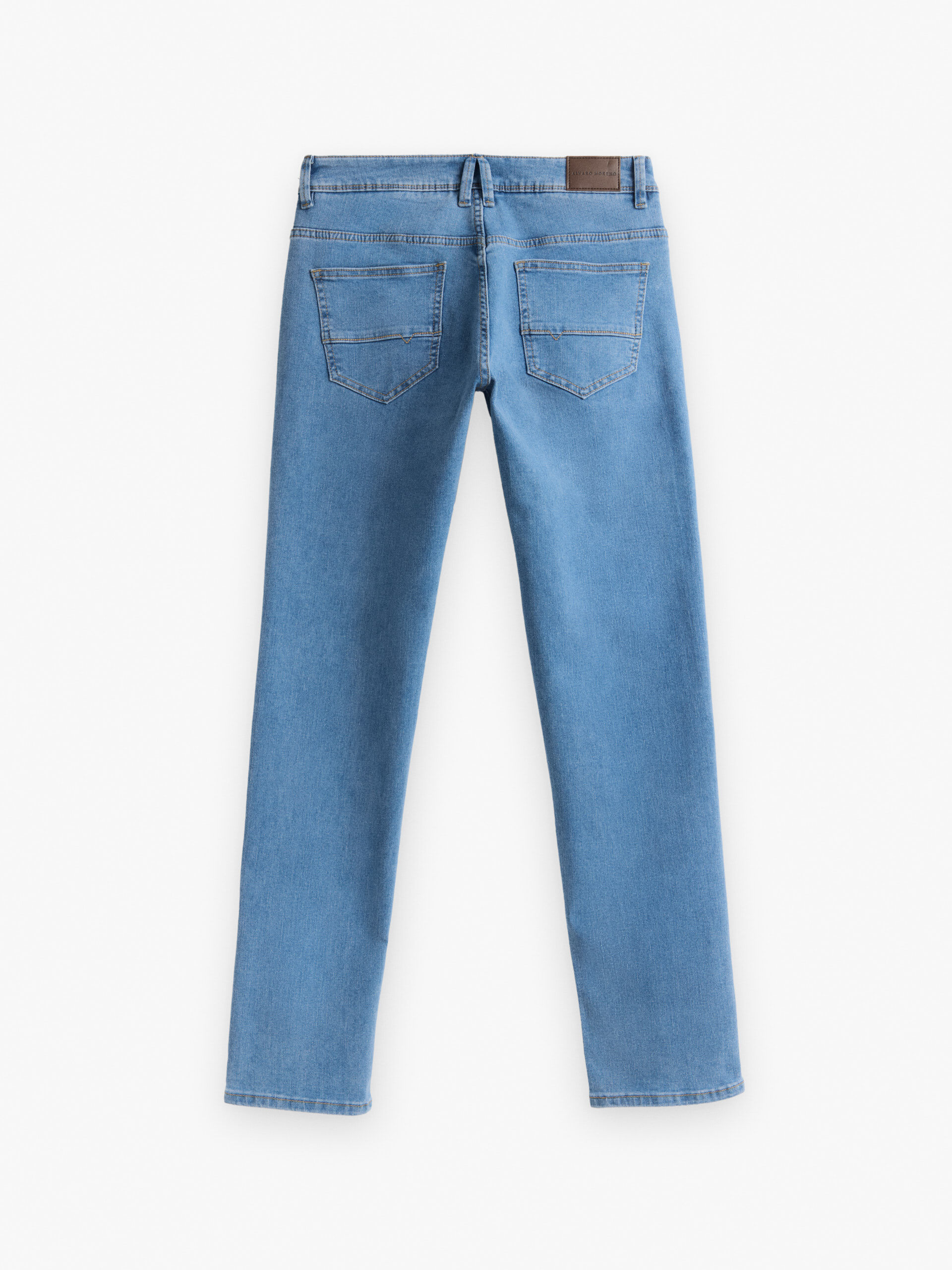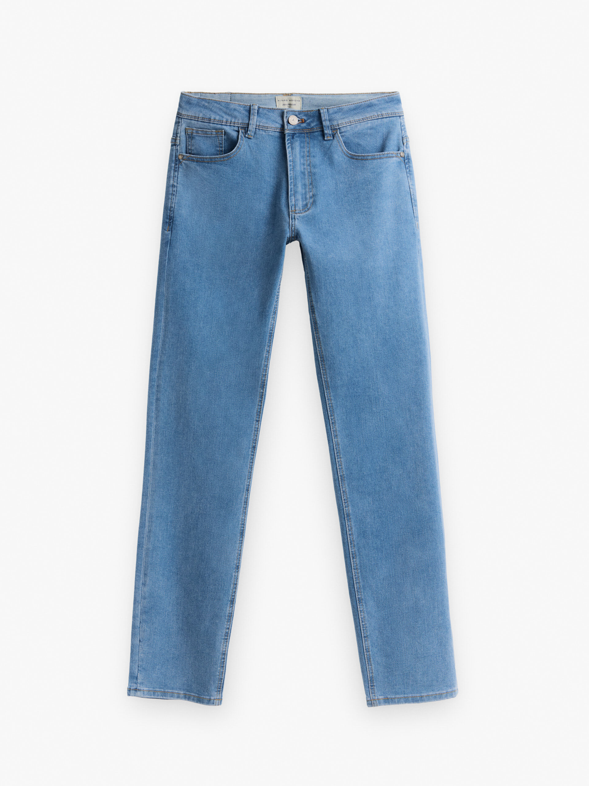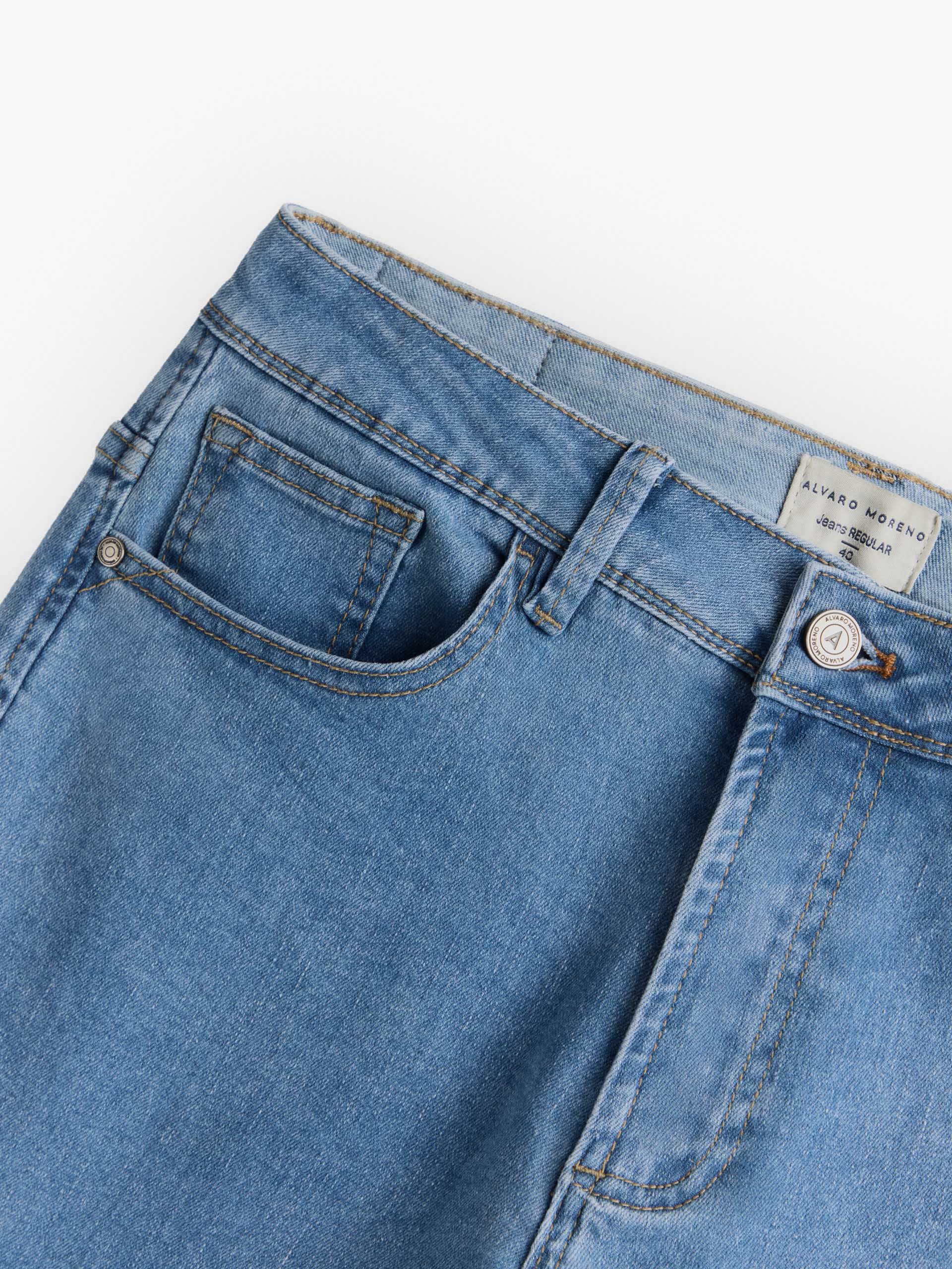 Pantalón denim de corte regular fit con cinco bolsillos y cierre central mediante botón y cremallera, pespuntes en color camel, fornituras personalizadas y etiqueta en efecto piel en la cinturilla.