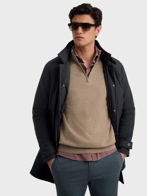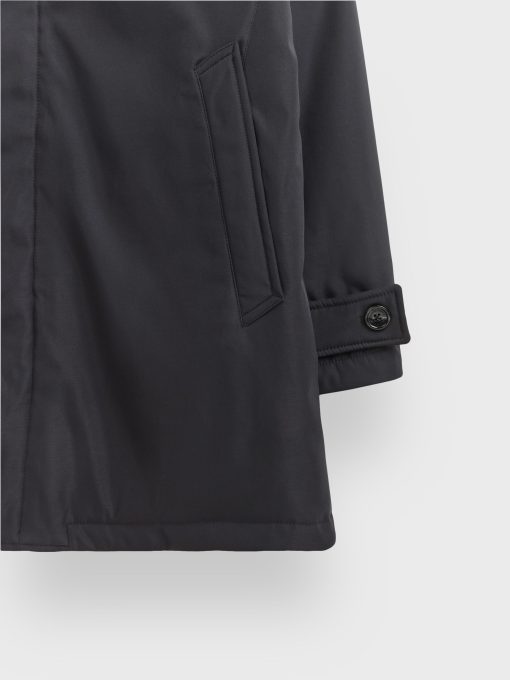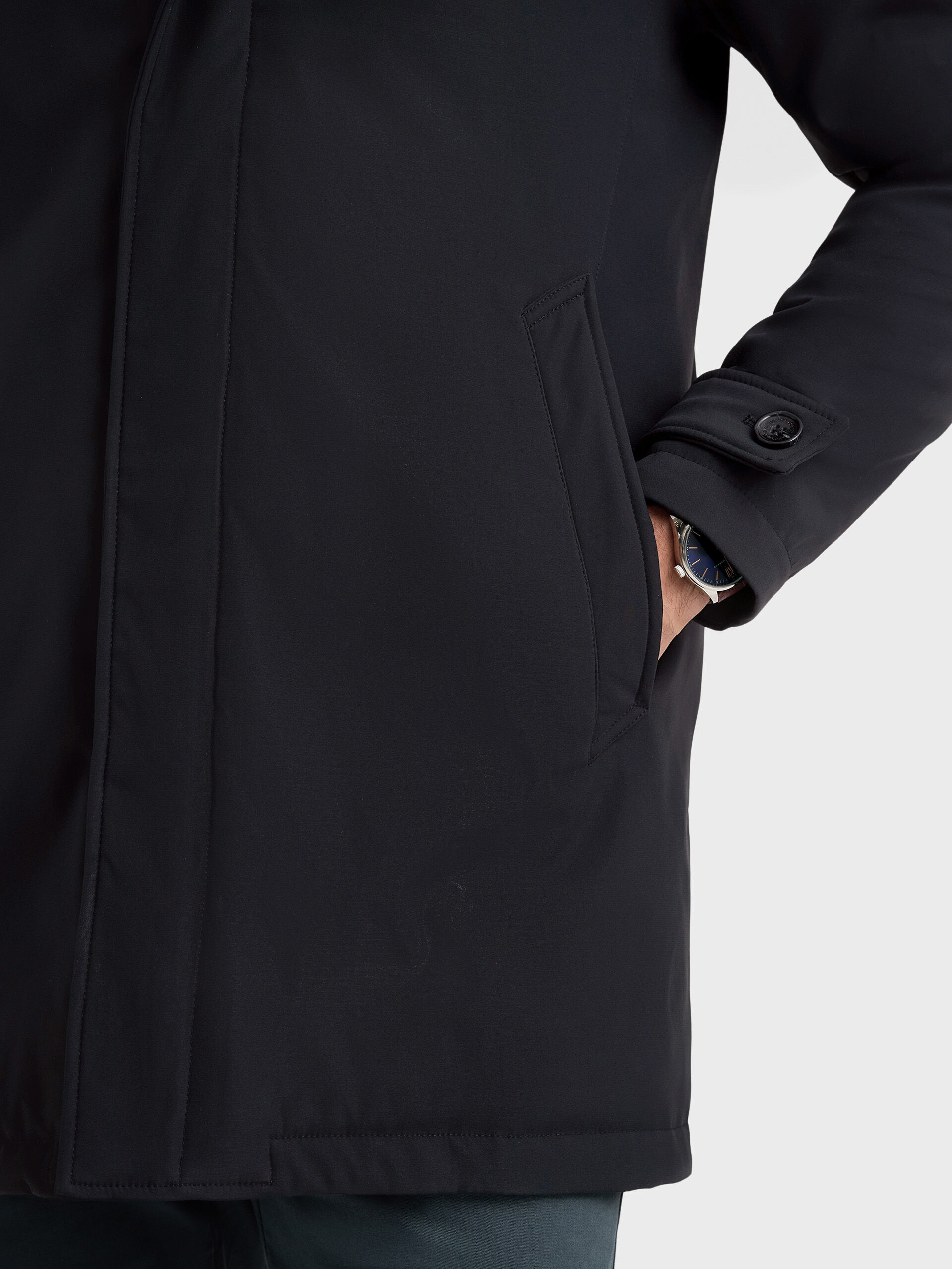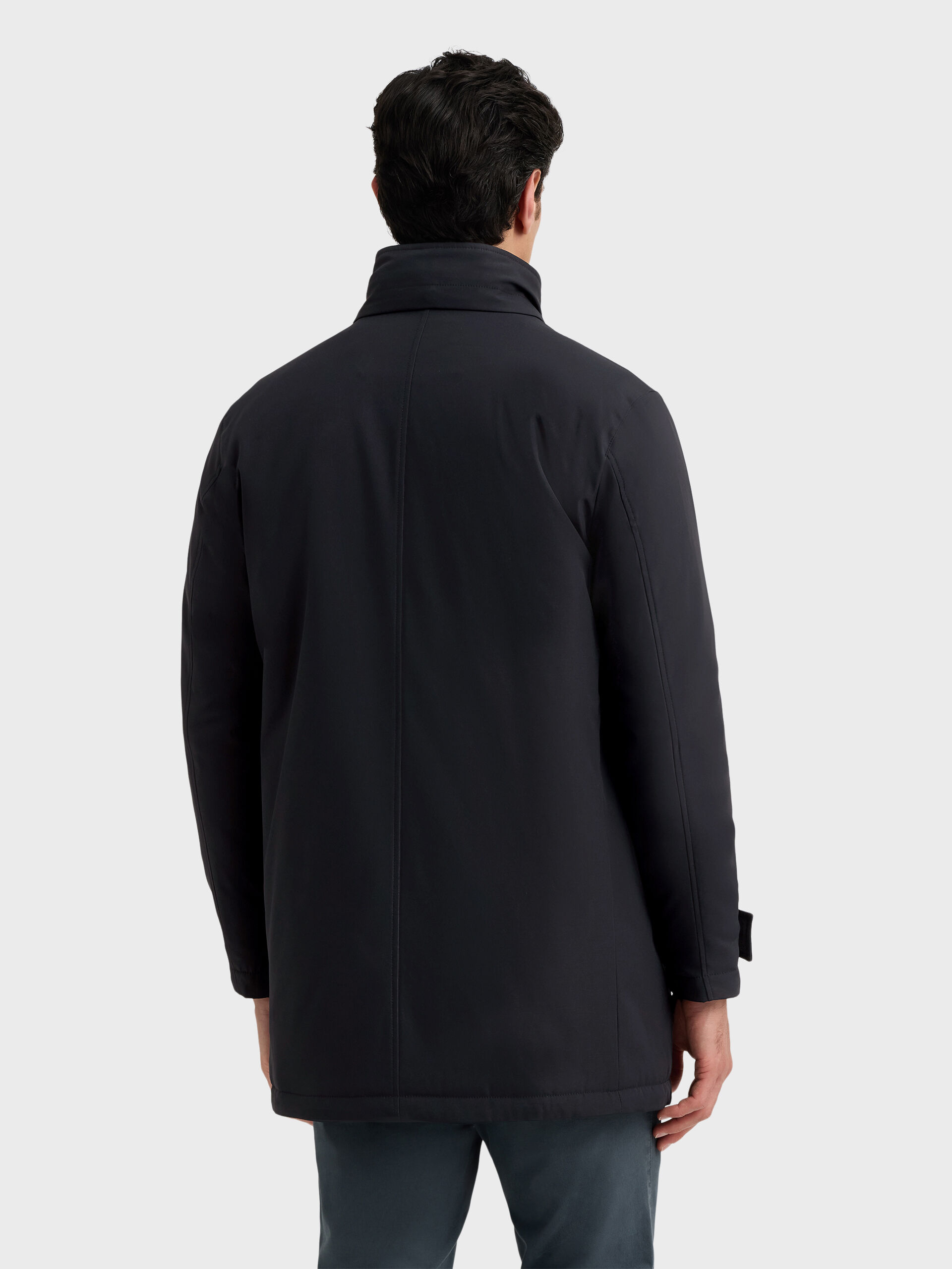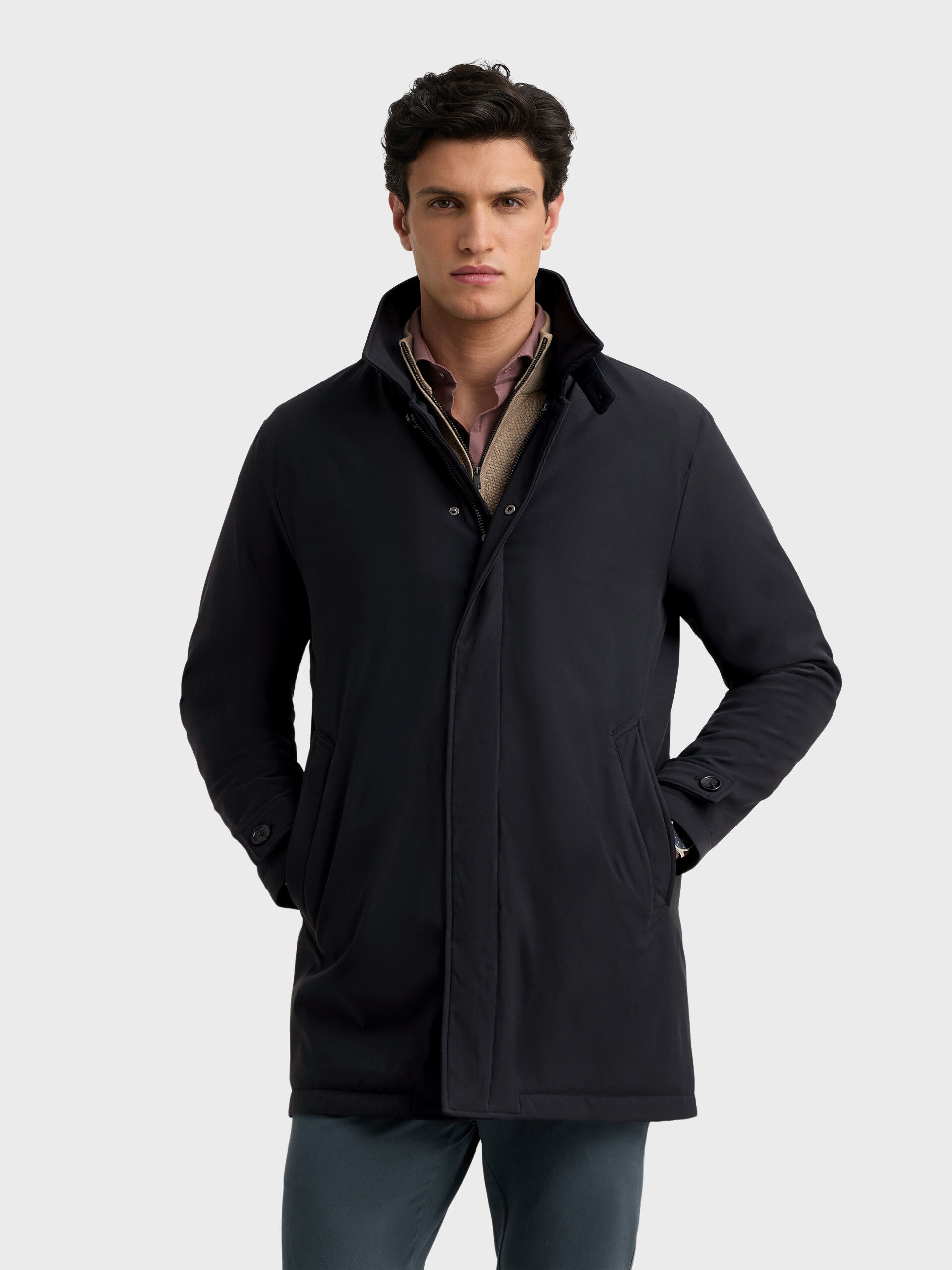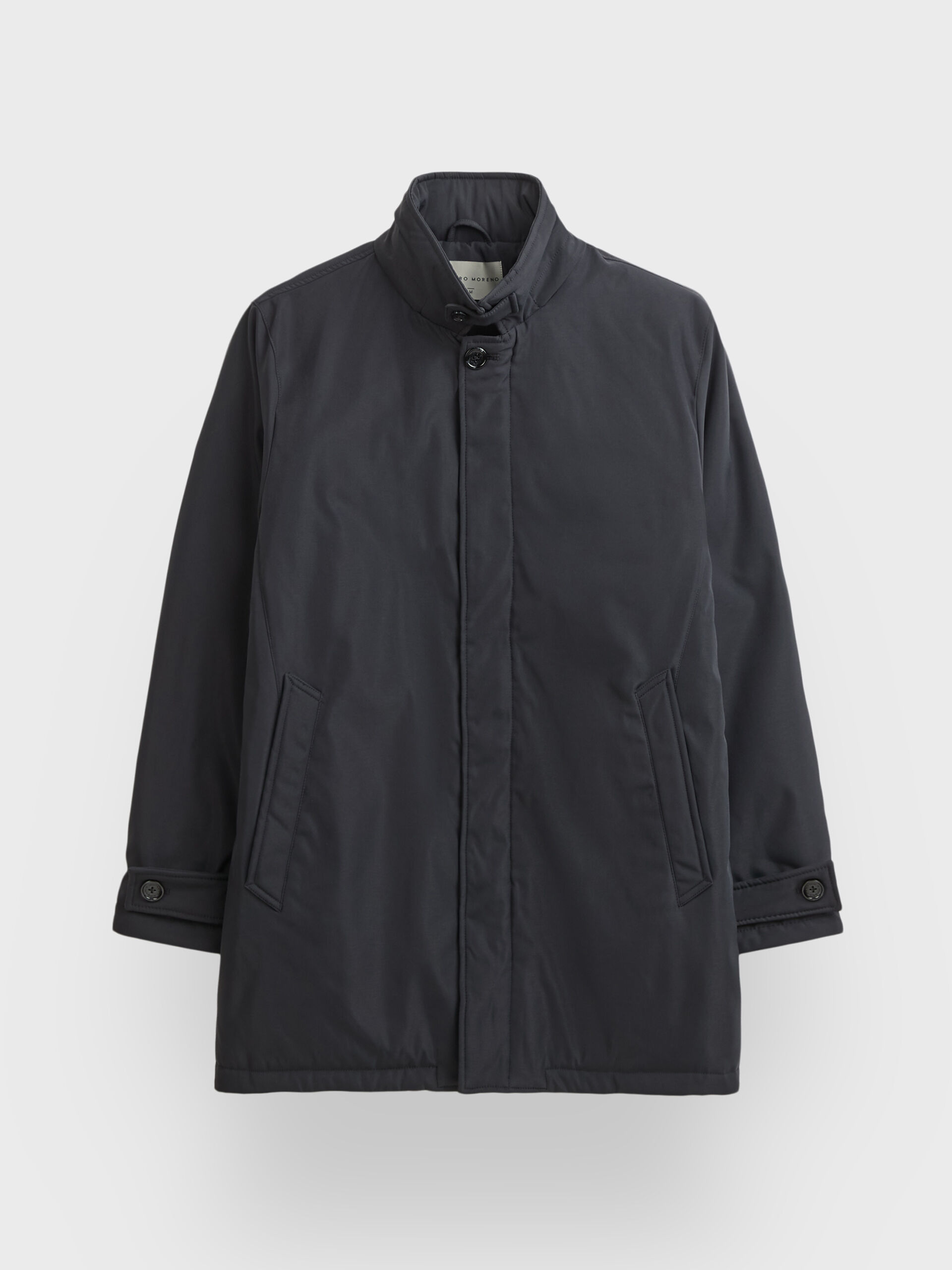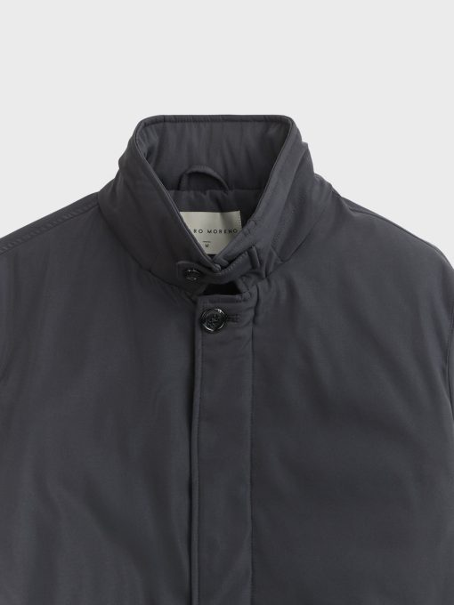 Gabardina acolchada con cuello subido. Cierre central mediante cremallera oculta mediante tapeta de botones a presión, manga larga con detalle personalizado en los puños y dos bolsillos en la cintura. Interior con bolsillo. Corte regular fit.