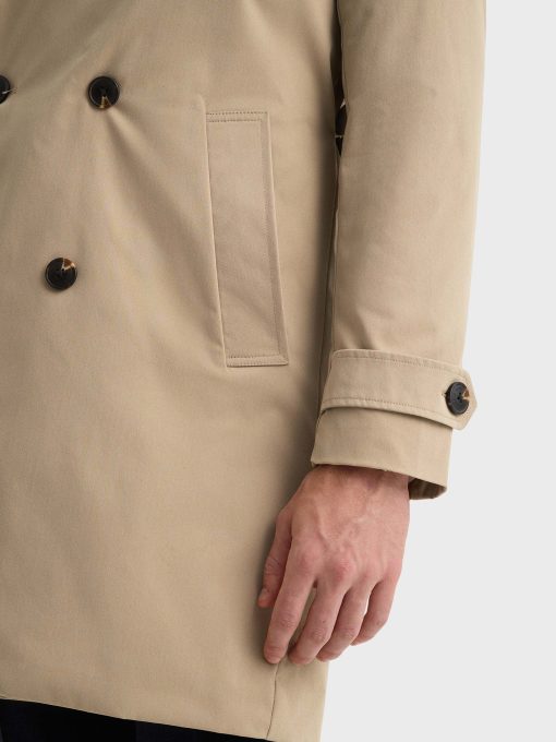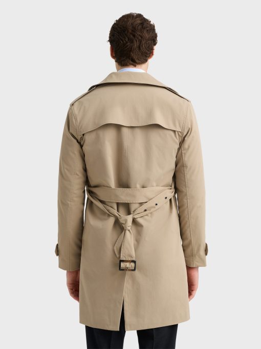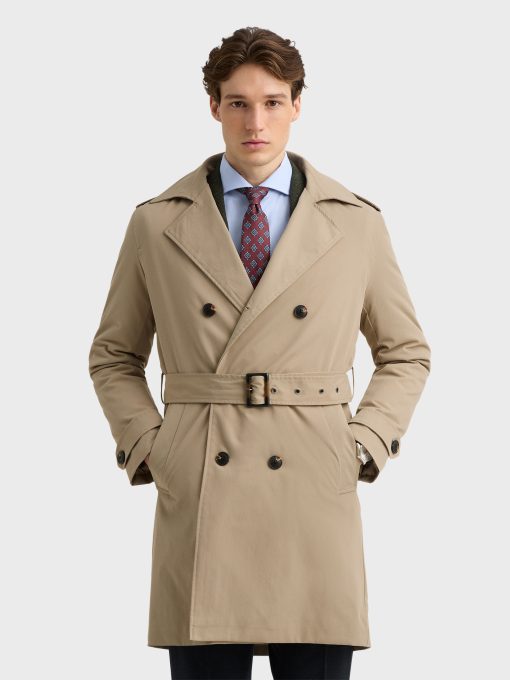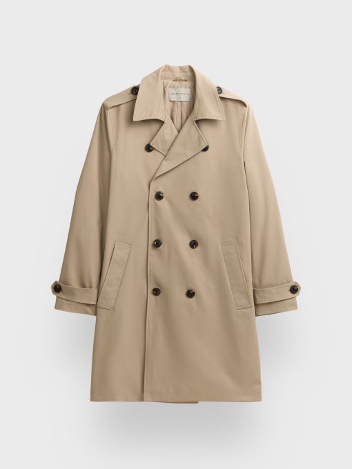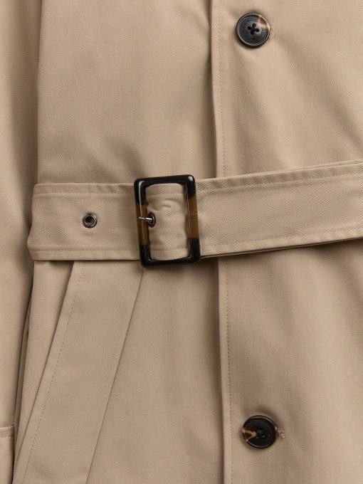 Gabardina trench con cierre cruzado de doble botonadura mediante ocho botones. Cuello con solapas de pico, dos bolsillos inclinados en la cintura y trabillas en los puños y hombros. Espalda con canesú y abertura central. Interior forrado a rombos con un bolsillo.
