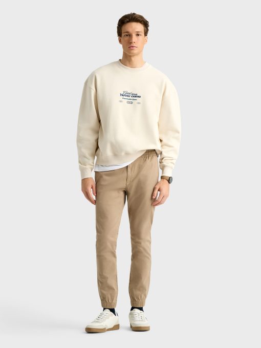 Pantalón con cinturilla elástica ajustable por cordones al tono y bajo con terminación de puño elástico. Cierre central mediante botón y cremallera, dos bolsillos en la parte delantera y dos en la parte trasera con detalle personalizado sobre uno de ellos.