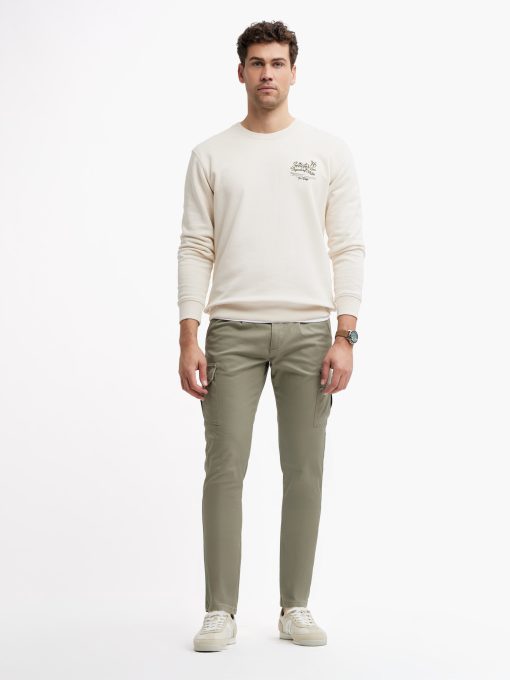 Pantalón estilo cargo de corte regular fit. Cuenta con pinzas en el frontal y cierre central mediante botón cruzado y cremallera. Dos bolsillos en el frontal, dos en el bajo lateral y dos en la parte trasera. Detalle personalizado uno de los bolsillos traseros.