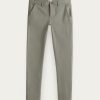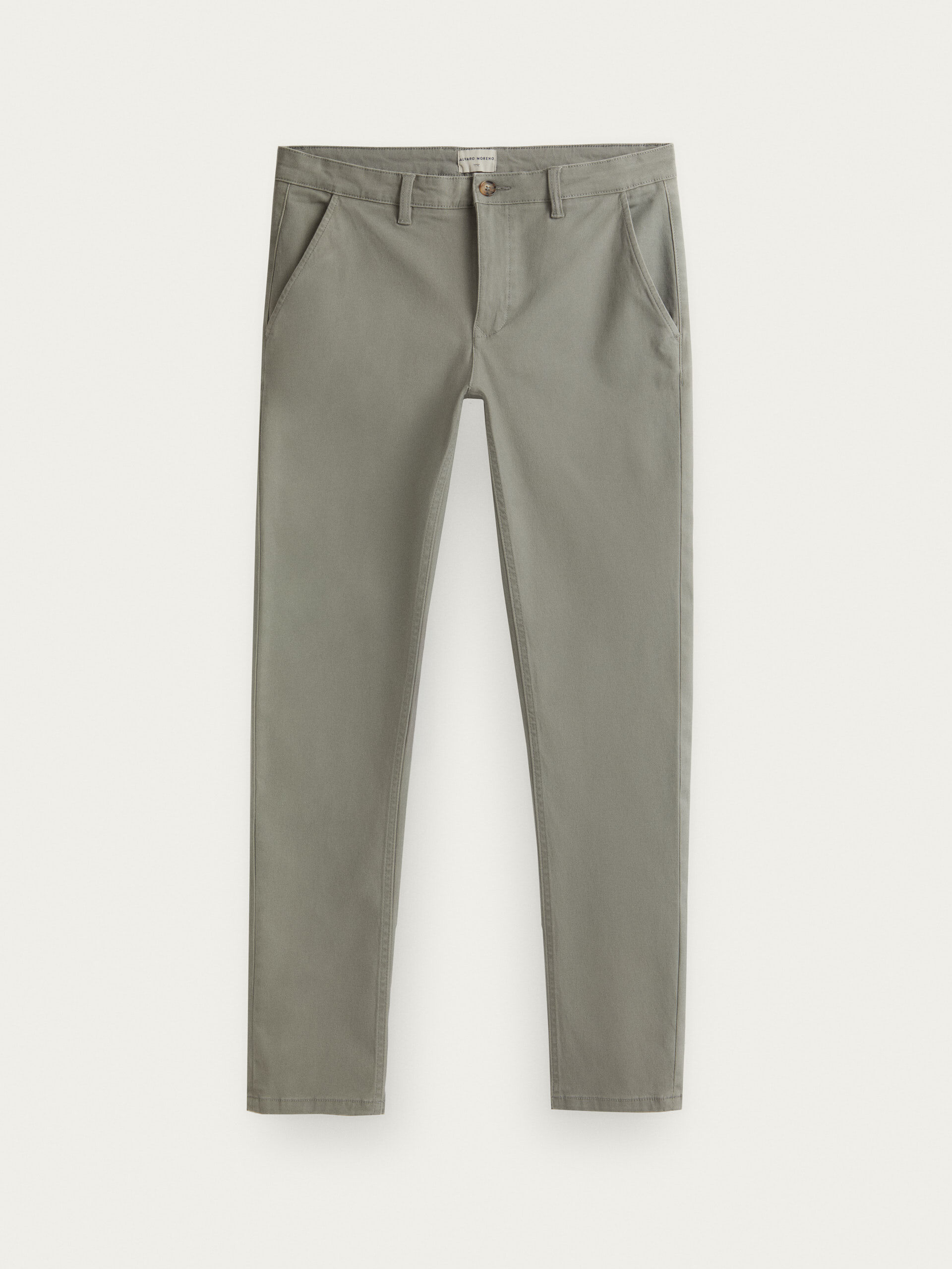 Pantalón estilo chino con cierre central mediante botón y cremallera, dos bolsillos en el frontal y dos en la parte trasera con detalle personalizado a contraste sobre uno de ellos. Corte slim fit.