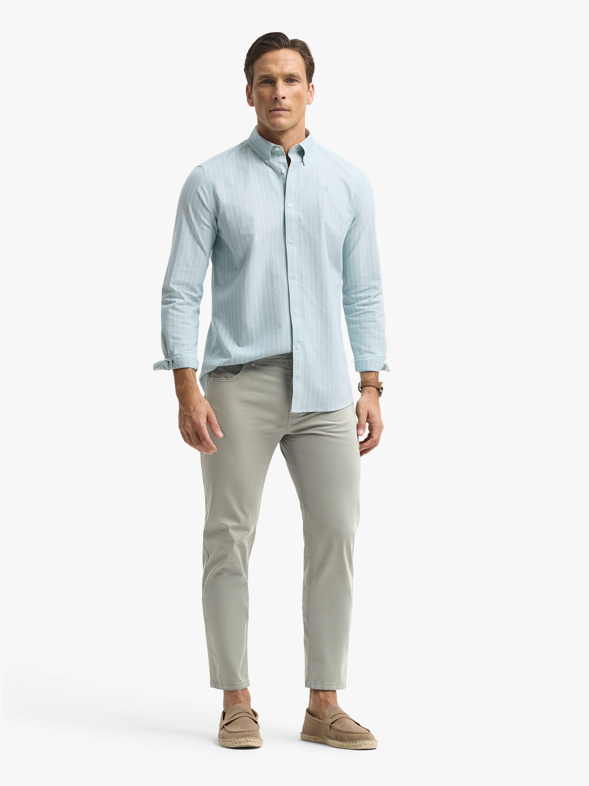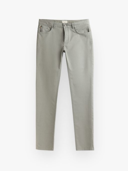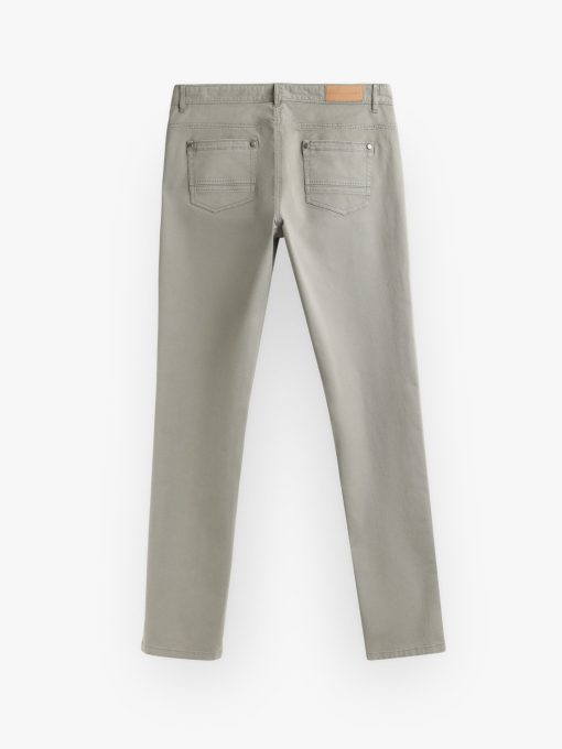 Pantalón con cierre central mediante cremallera y botón, tres bolsillos en el frontal, bolsillo cerillero con detalle personalizado al tono y bolsillos en la parte trasera con pespunte al tono y etiqueta personalizada en la cinturilla en aspecto piel.