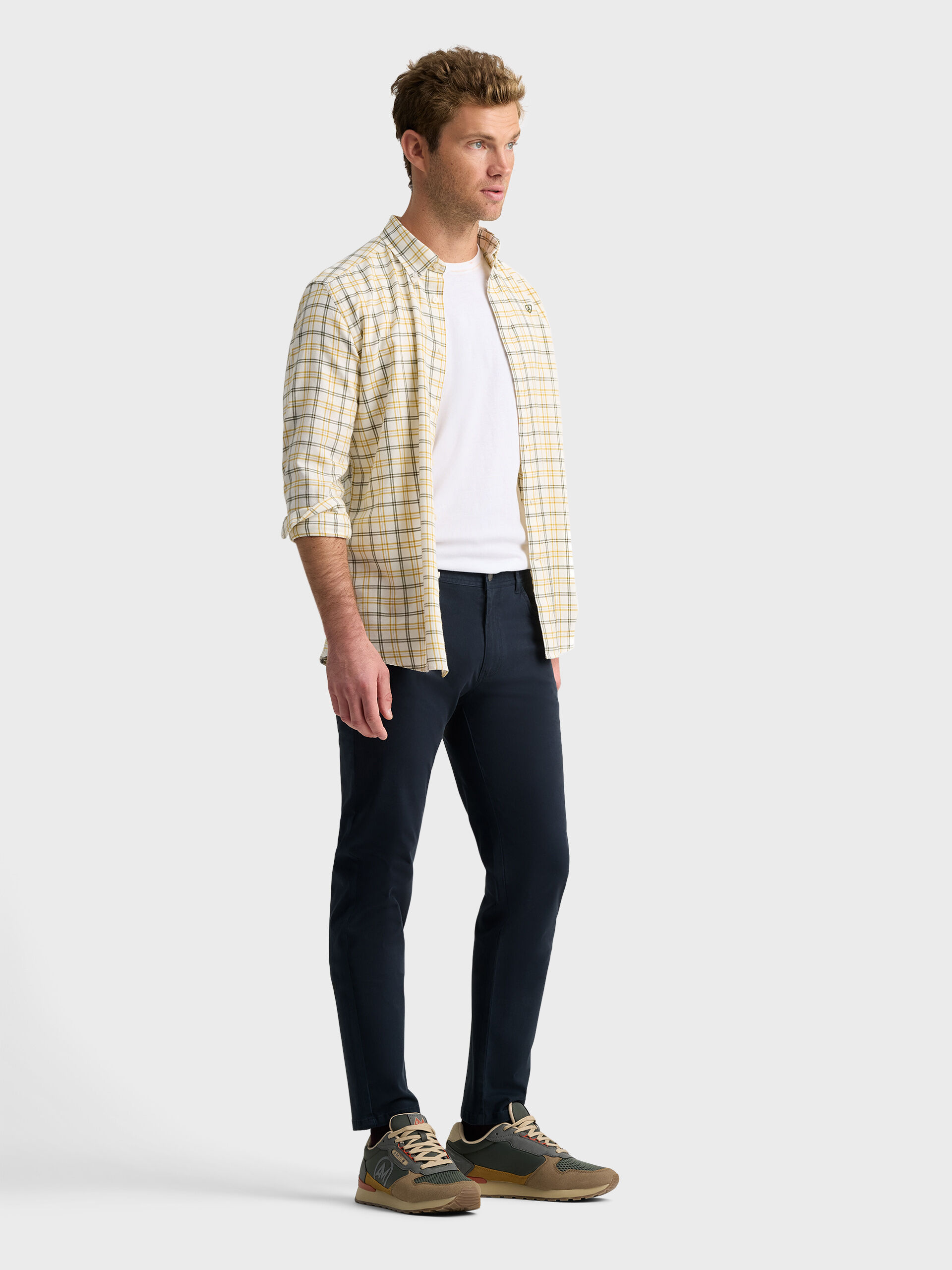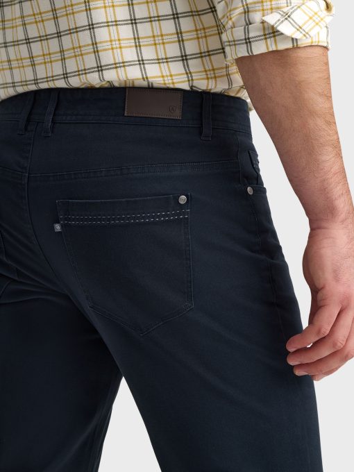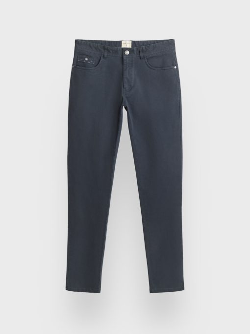 Pantalón de estilo casual con 5 bolsillos. Cierre central mediante botón y cremallera, tres bolsillos en el frontal y dos bolsillos traseros con pespunte al tono. Etiqueta personalizada en la cinturilla en aspecto piel. Corte slim fit.