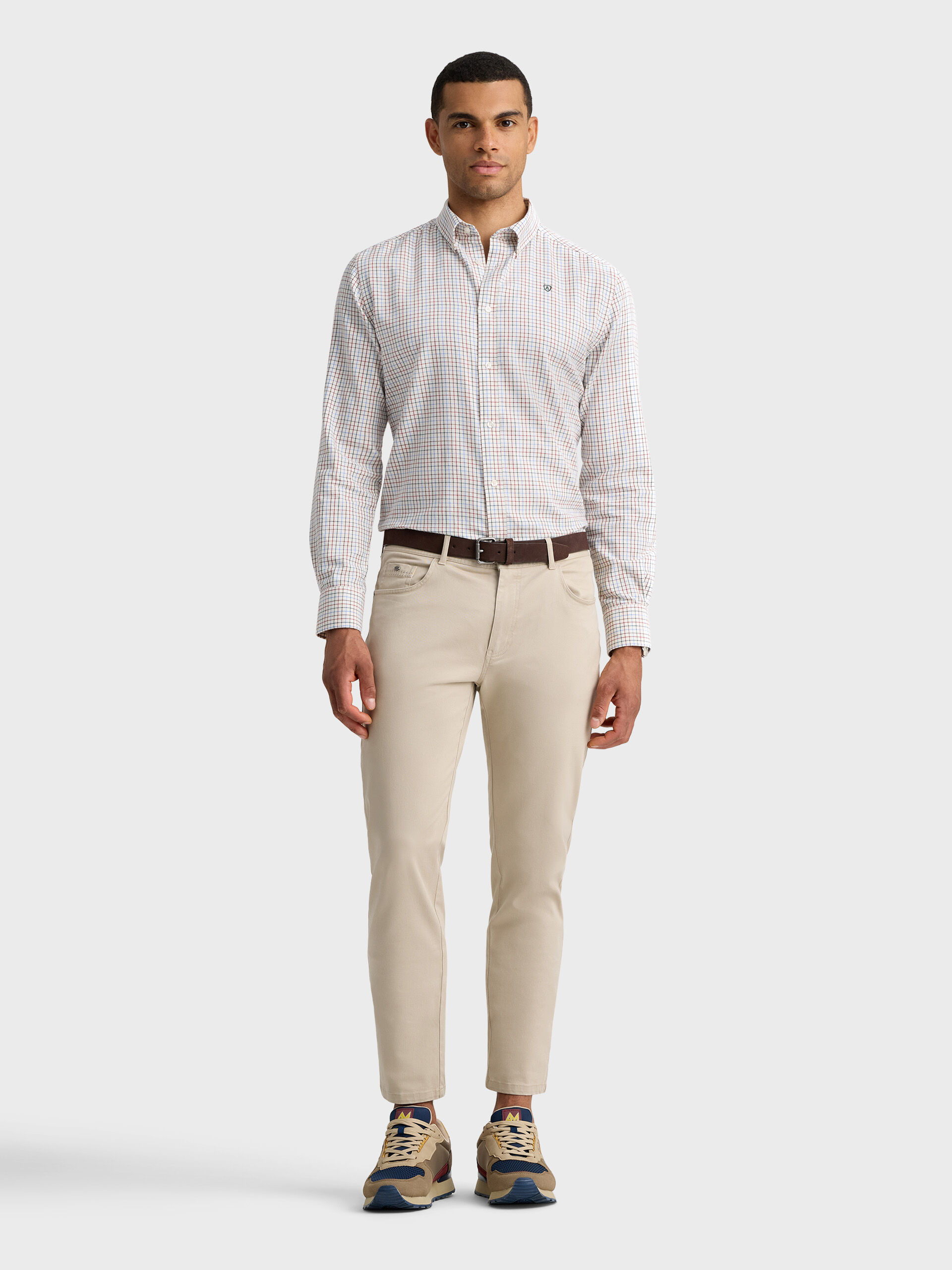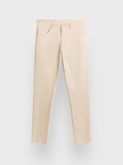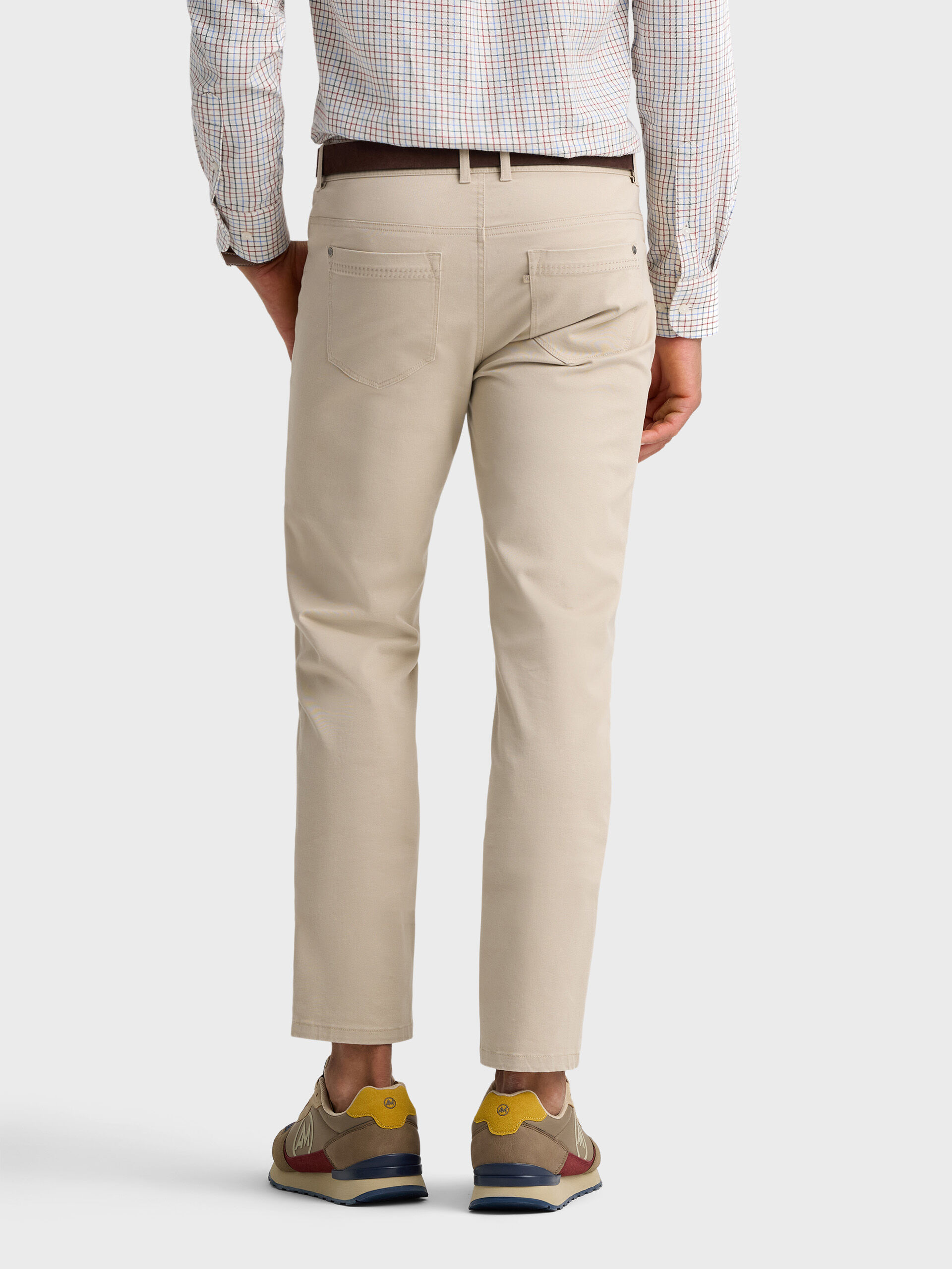 Pantalón de estilo casual con 5 bolsillos. Cierre central mediante botón y cremallera, tres bolsillos en el frontal y dos bolsillos traseros con pespunte al tono. Etiqueta personalizada en la cinturilla en aspecto piel. Corte slim fit.