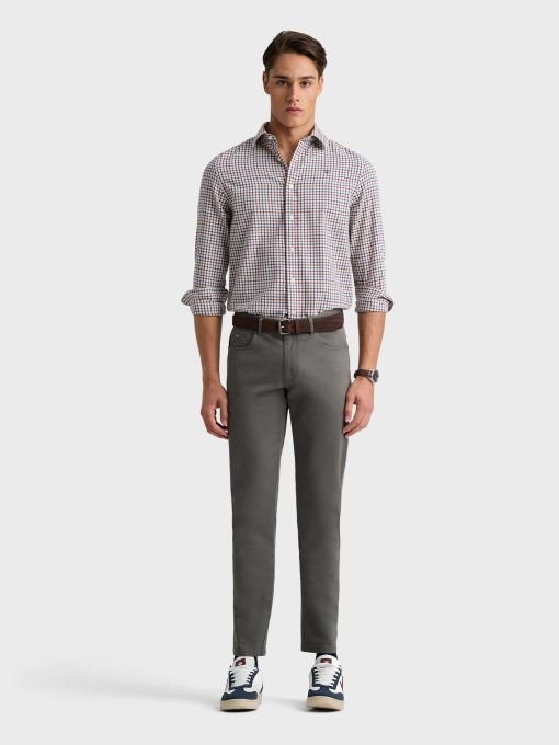 Pantalón de estilo casual con 5 bolsillos. Cierre central mediante botón y cremallera, tres bolsillos en el frontal y dos bolsillos traseros con pespunte al tono. Etiqueta personalizada en la cinturilla en aspecto piel. Corte slim fit.
