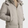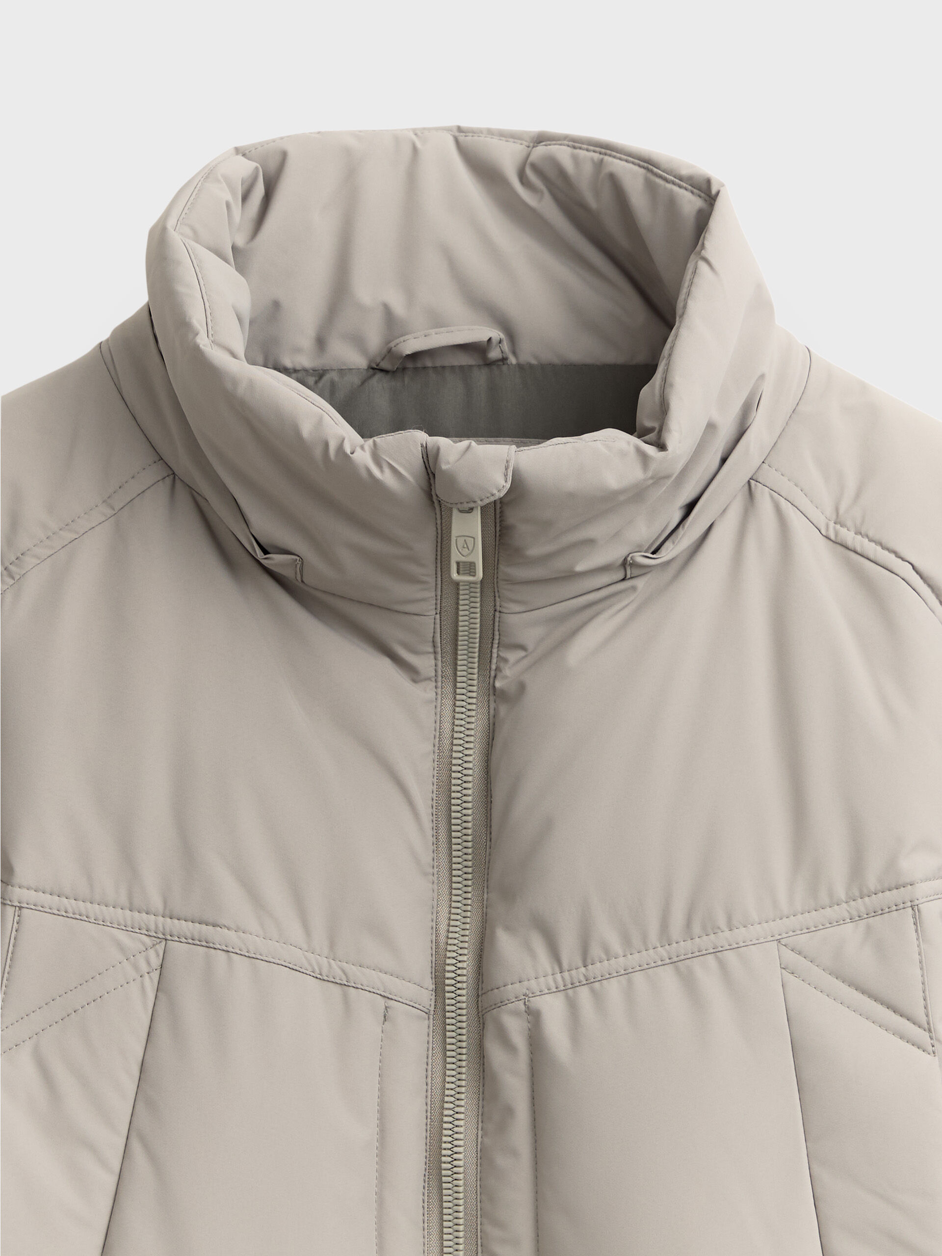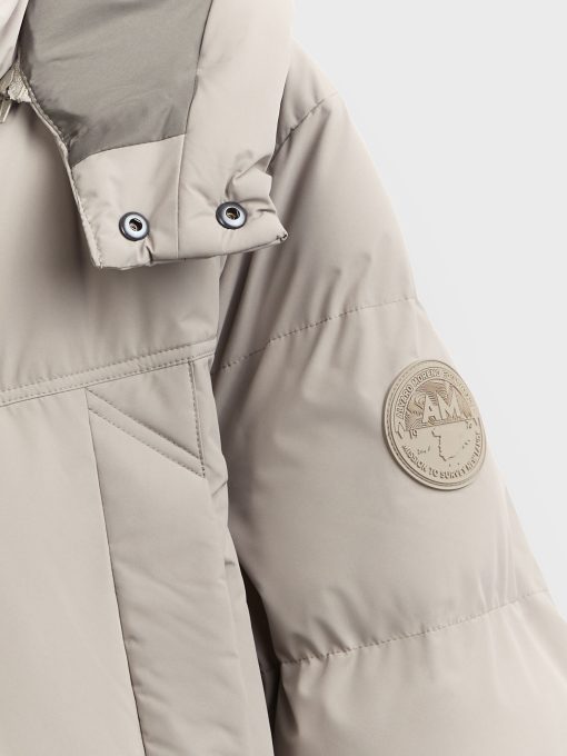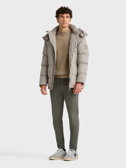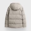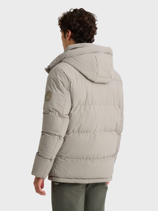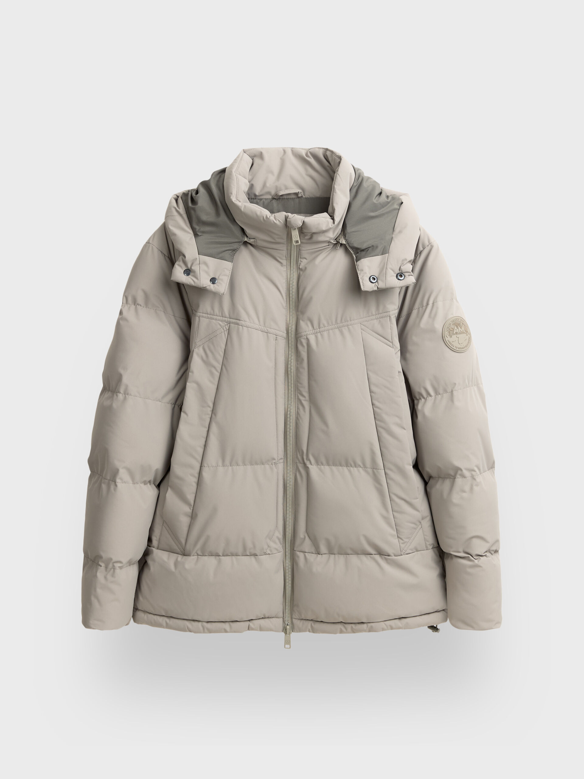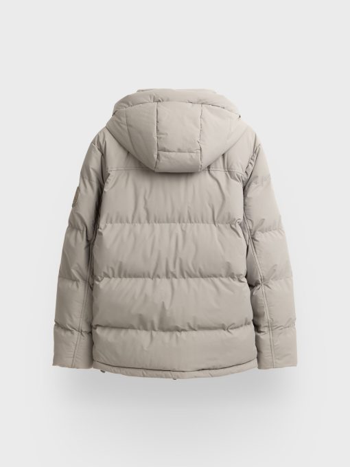 Parka acolchada de corte regular fit con gorro desmontable. Cierre central mediante cremallera, manga larga con detalle personalizado en una de ellas y dos amplios bolsillos frontales. Bajo con ajuste mediante elástico.
