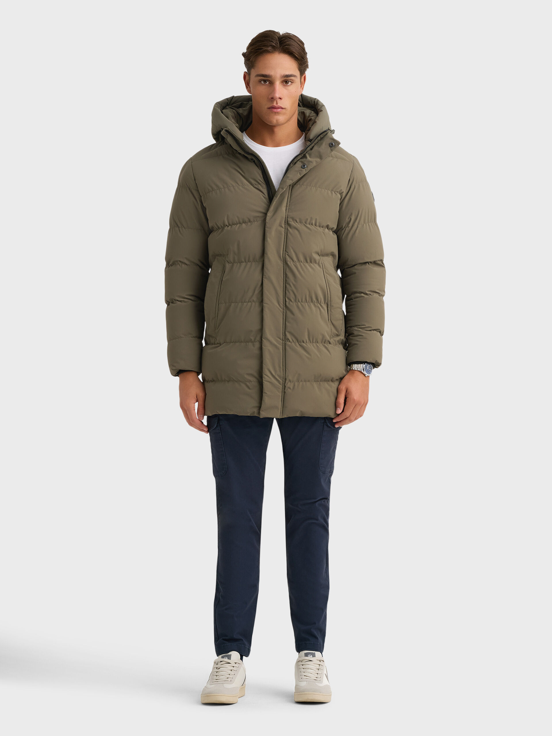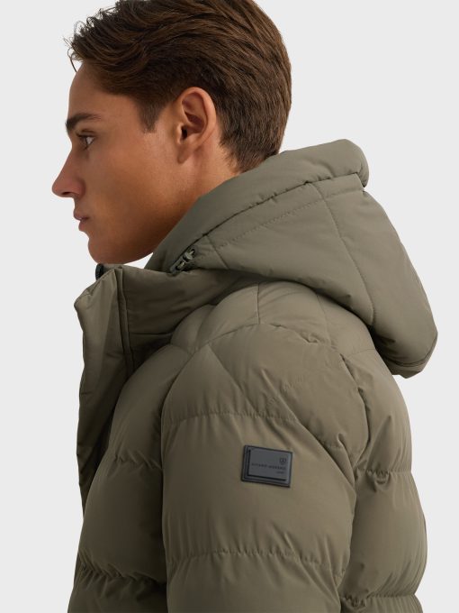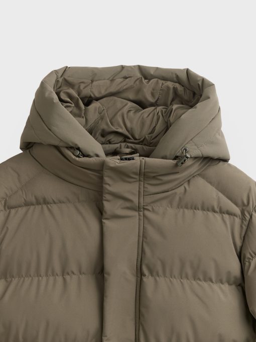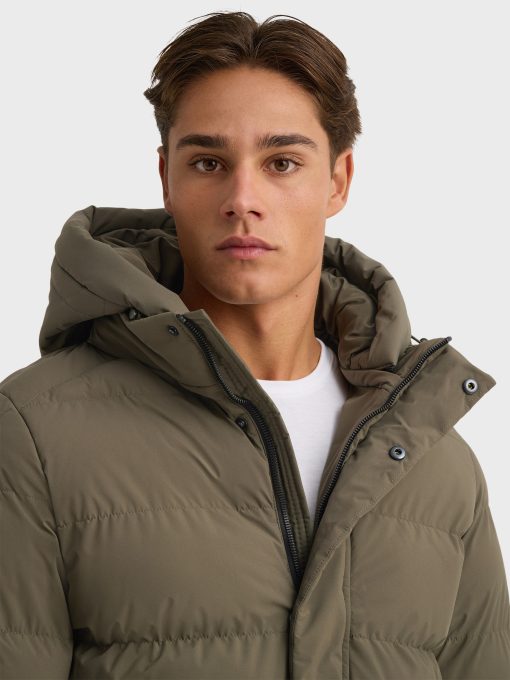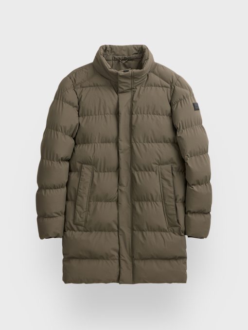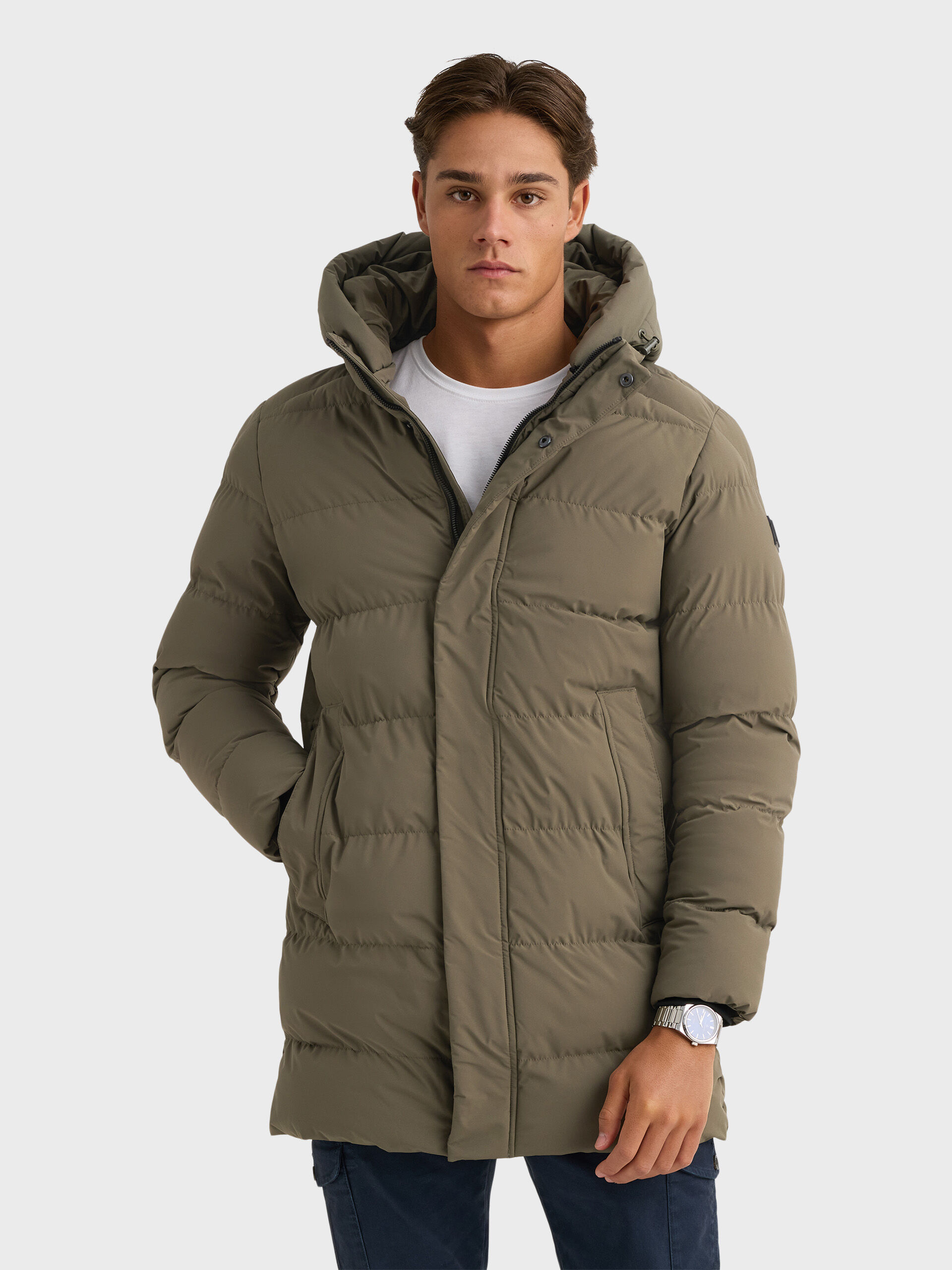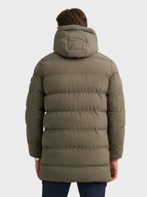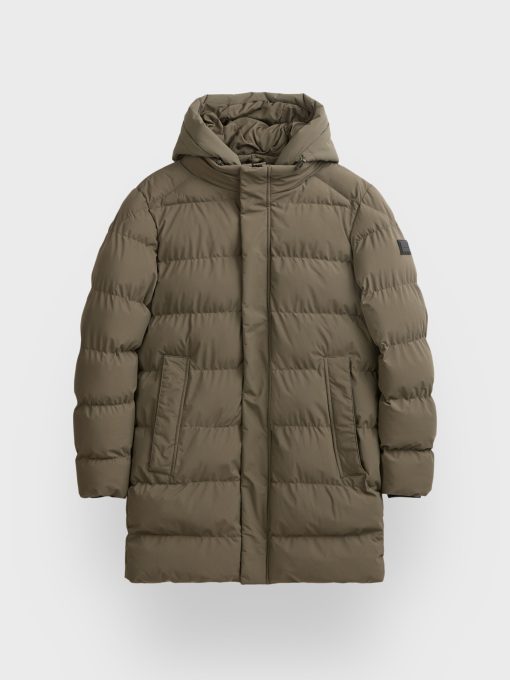 Parka acolchada de corte regular fit con gorro desmontable. Cierre central mediante cremallera oculta por tapeta de botones a presión, manga larga con detalle personalizado en una de ellas y dos amplios bolsillos frontales. Puños con ajuste mediante elástico.