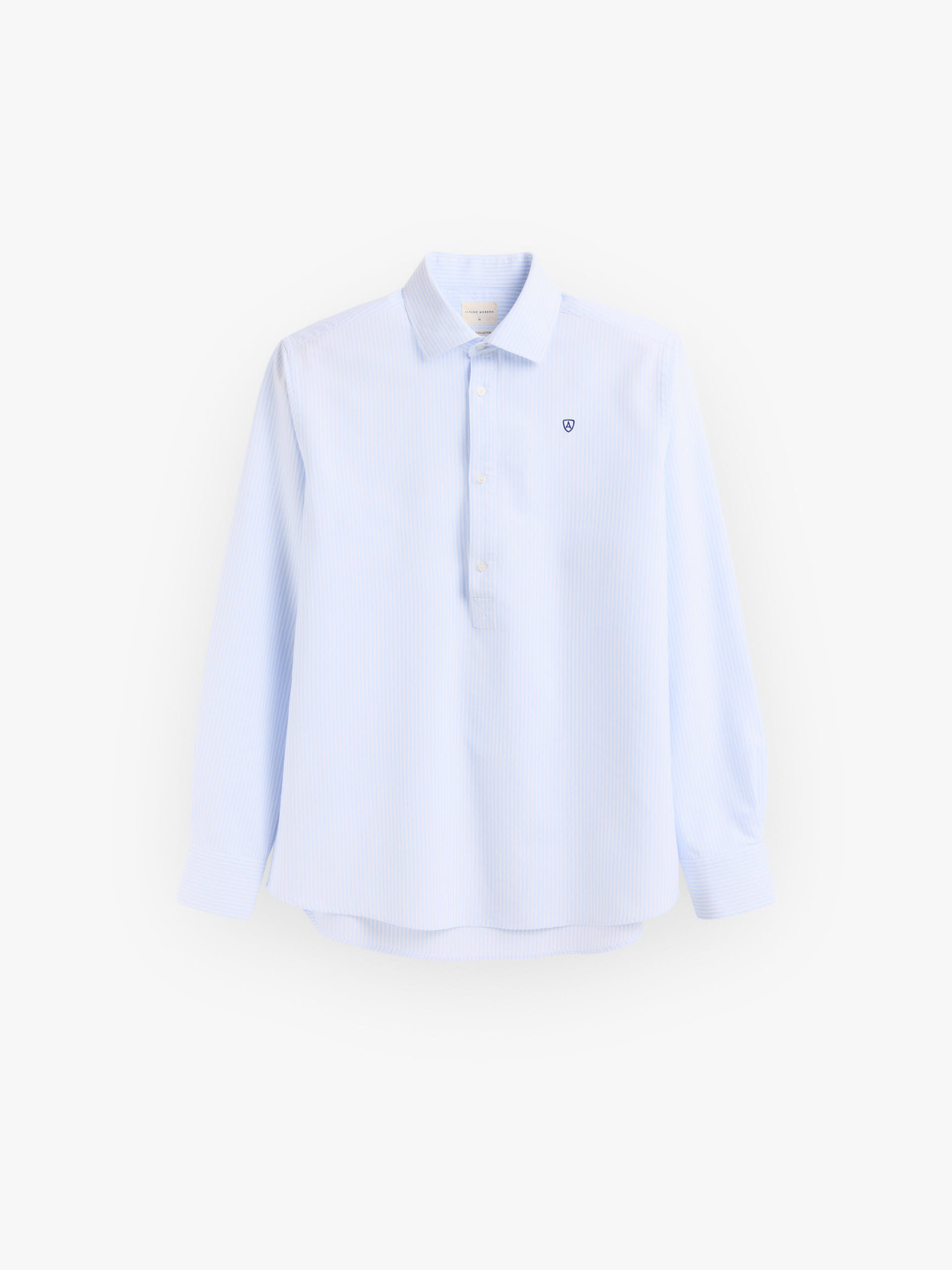 Camisa a rayas estilo polera con medio cierre central de hasta cuatro botones, cuello de solapa, manga larga con puños simples y logo de la marca grabado en el frontal. Corte regular fit.