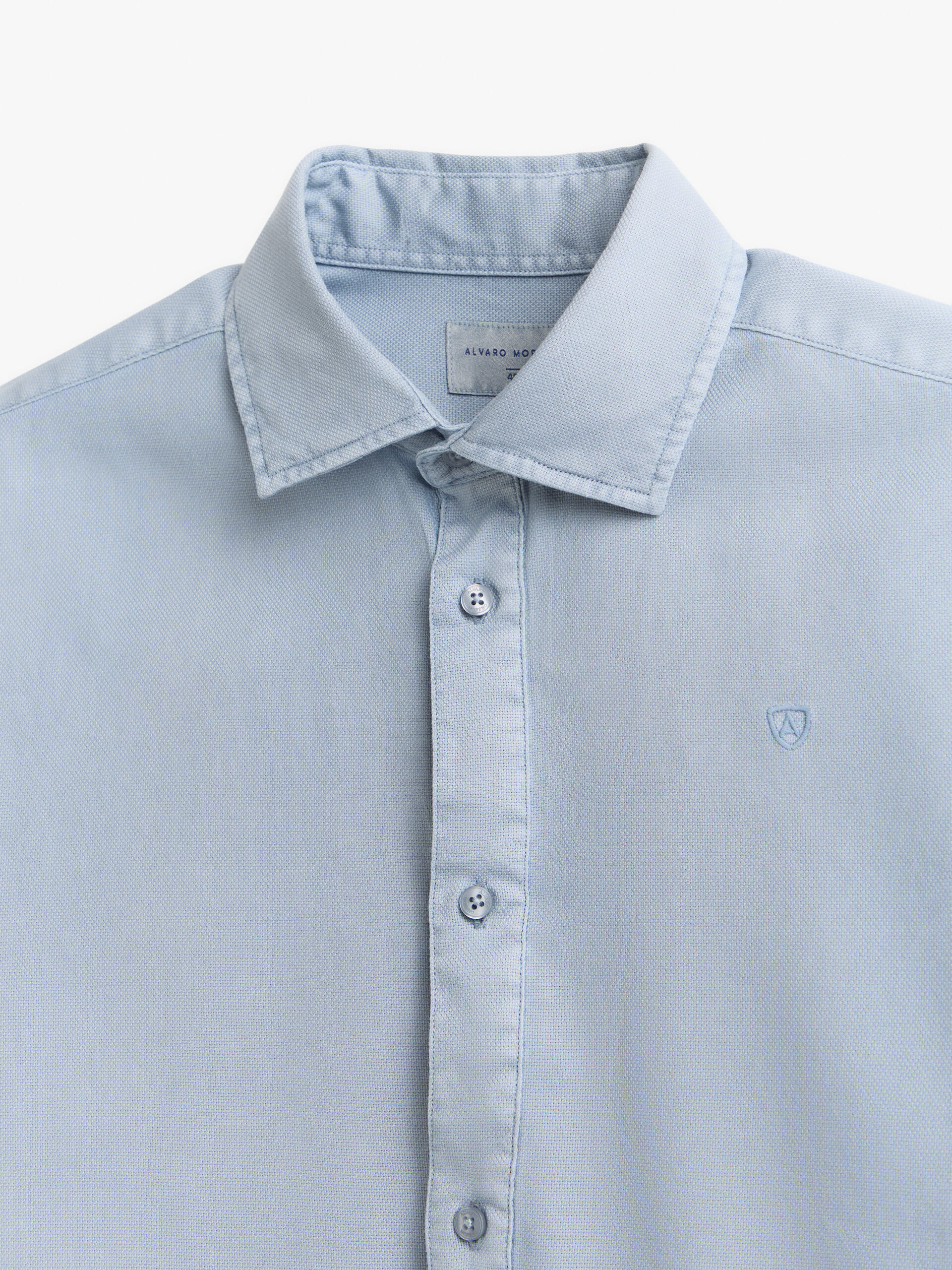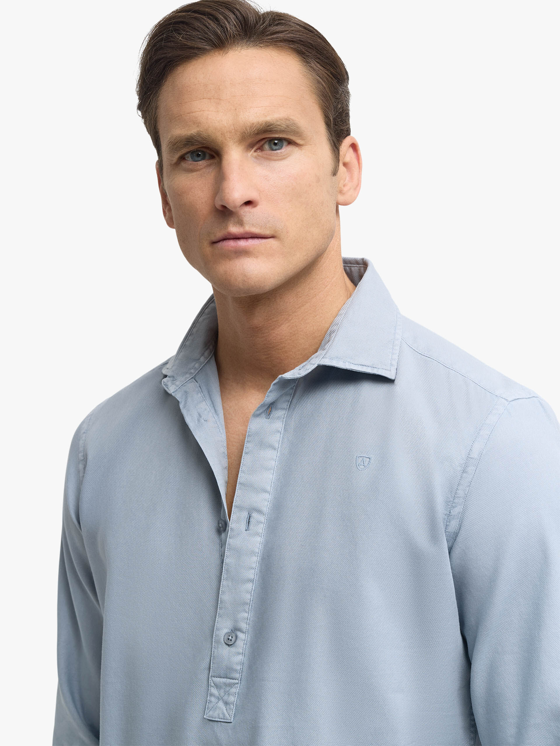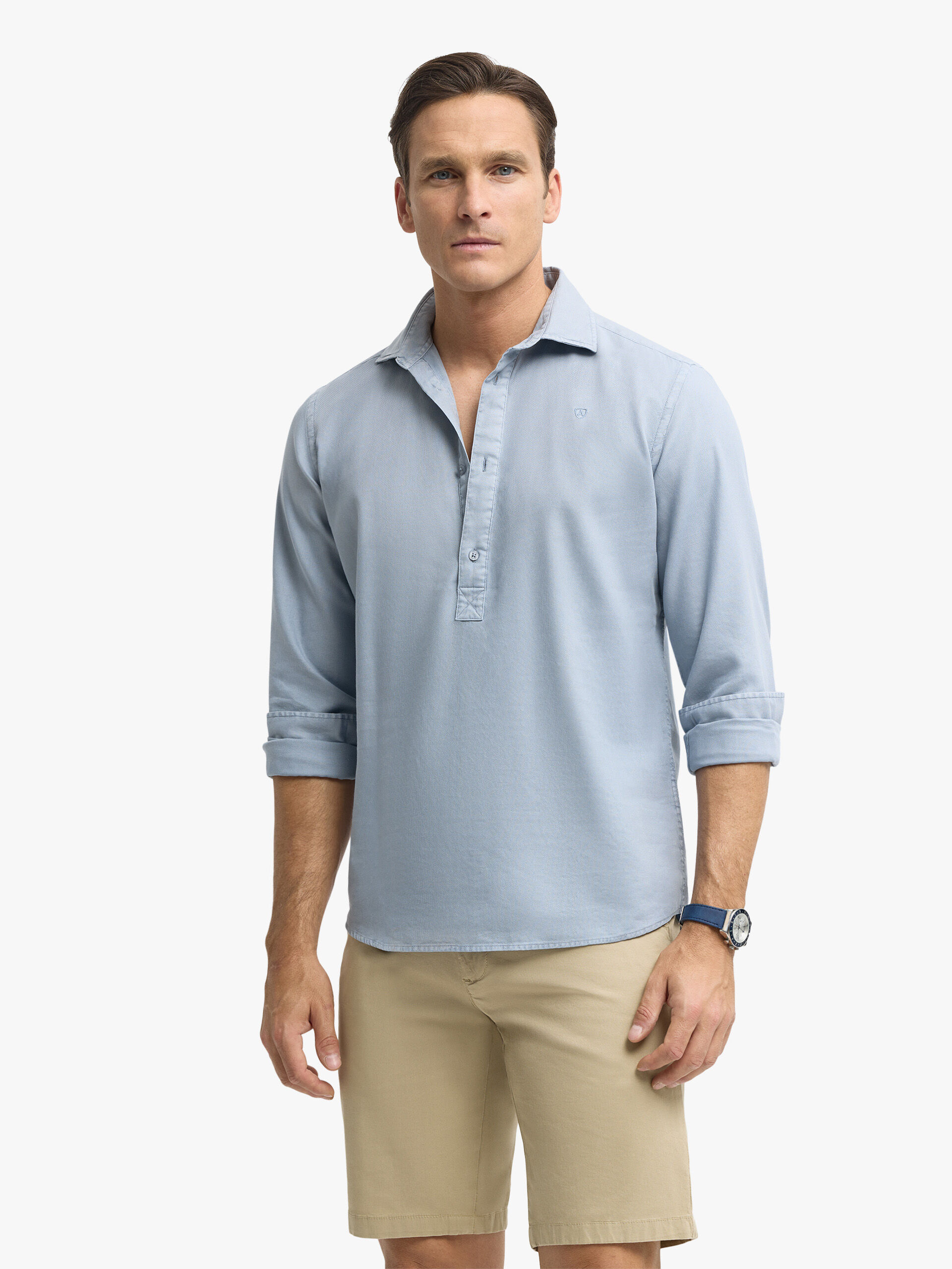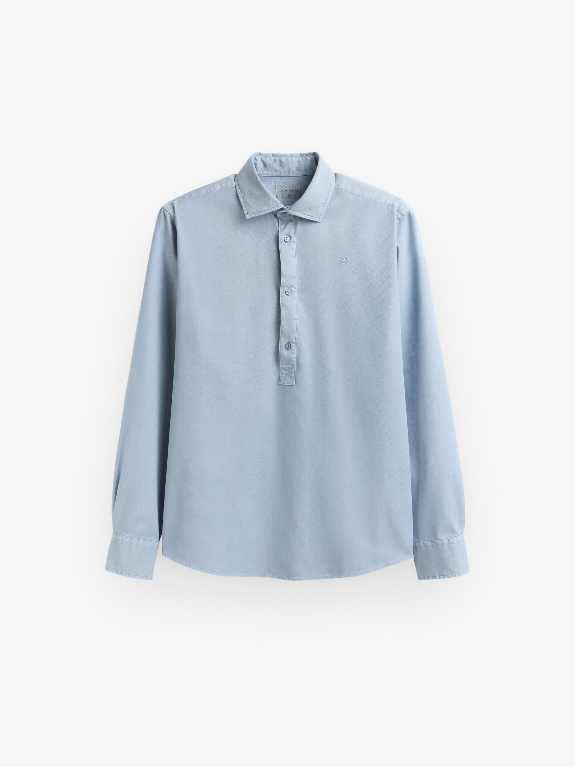 Camisa estilo polera lisa confeccionada en algodón. Cuenta con cuello de solapa, medio cierre central de hasta cuatro botones, manga larga con puños simples y logo de la marca grabado en el frontal. Corte regular fit.