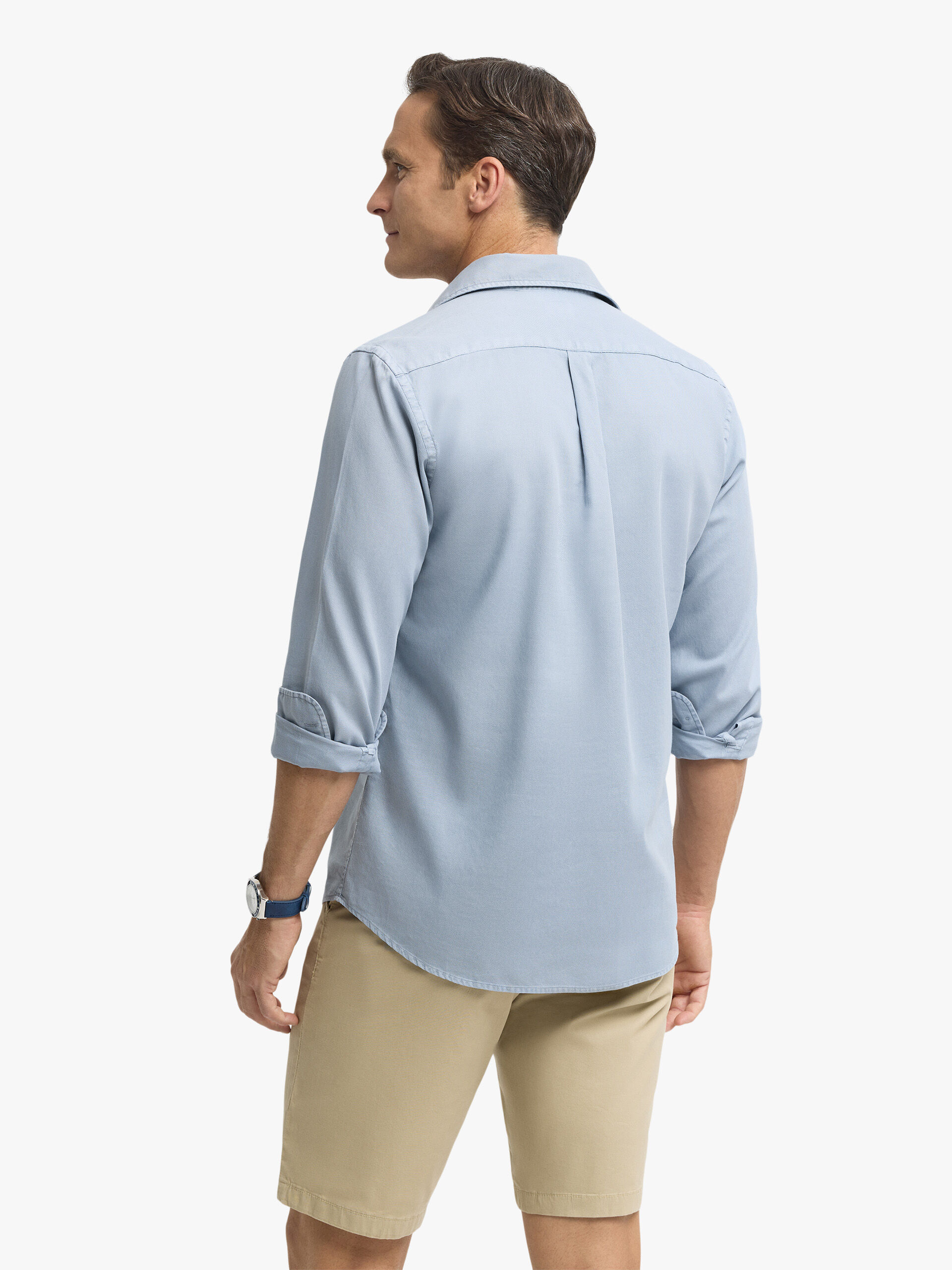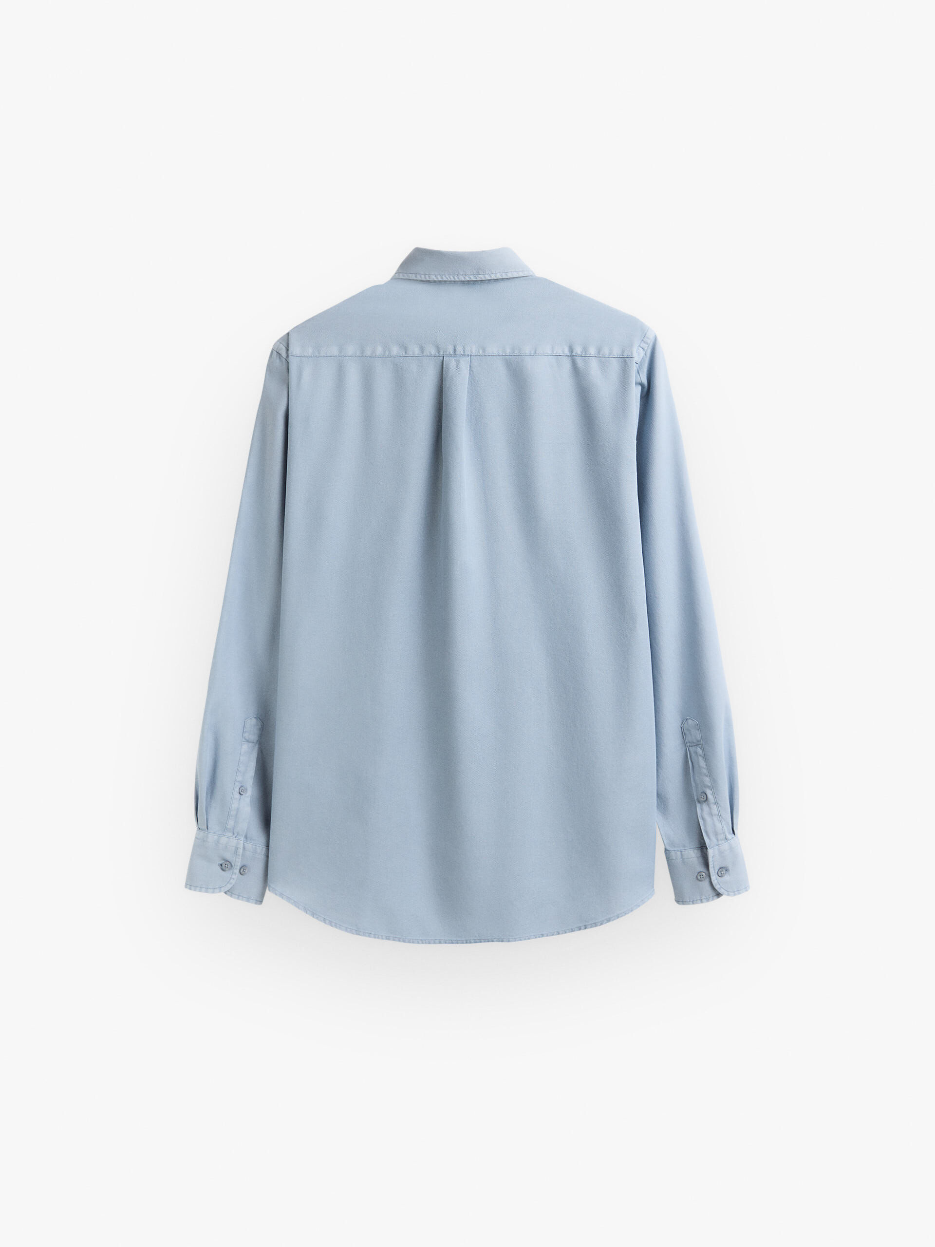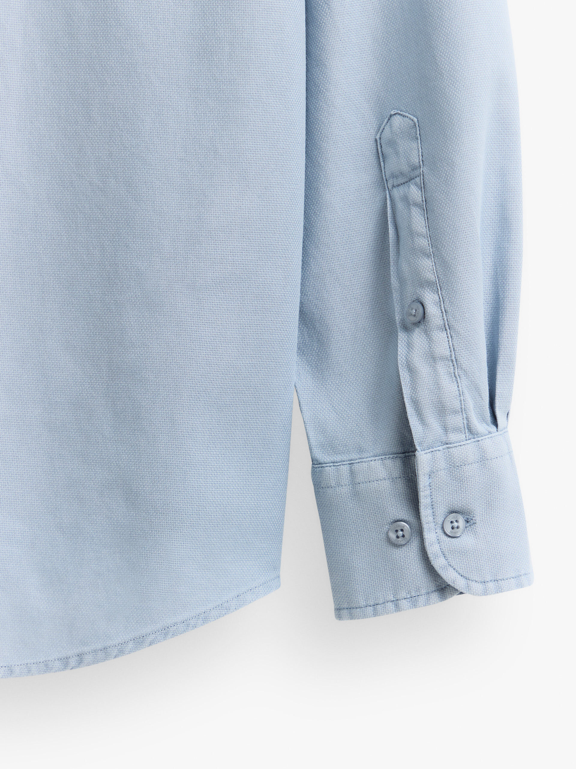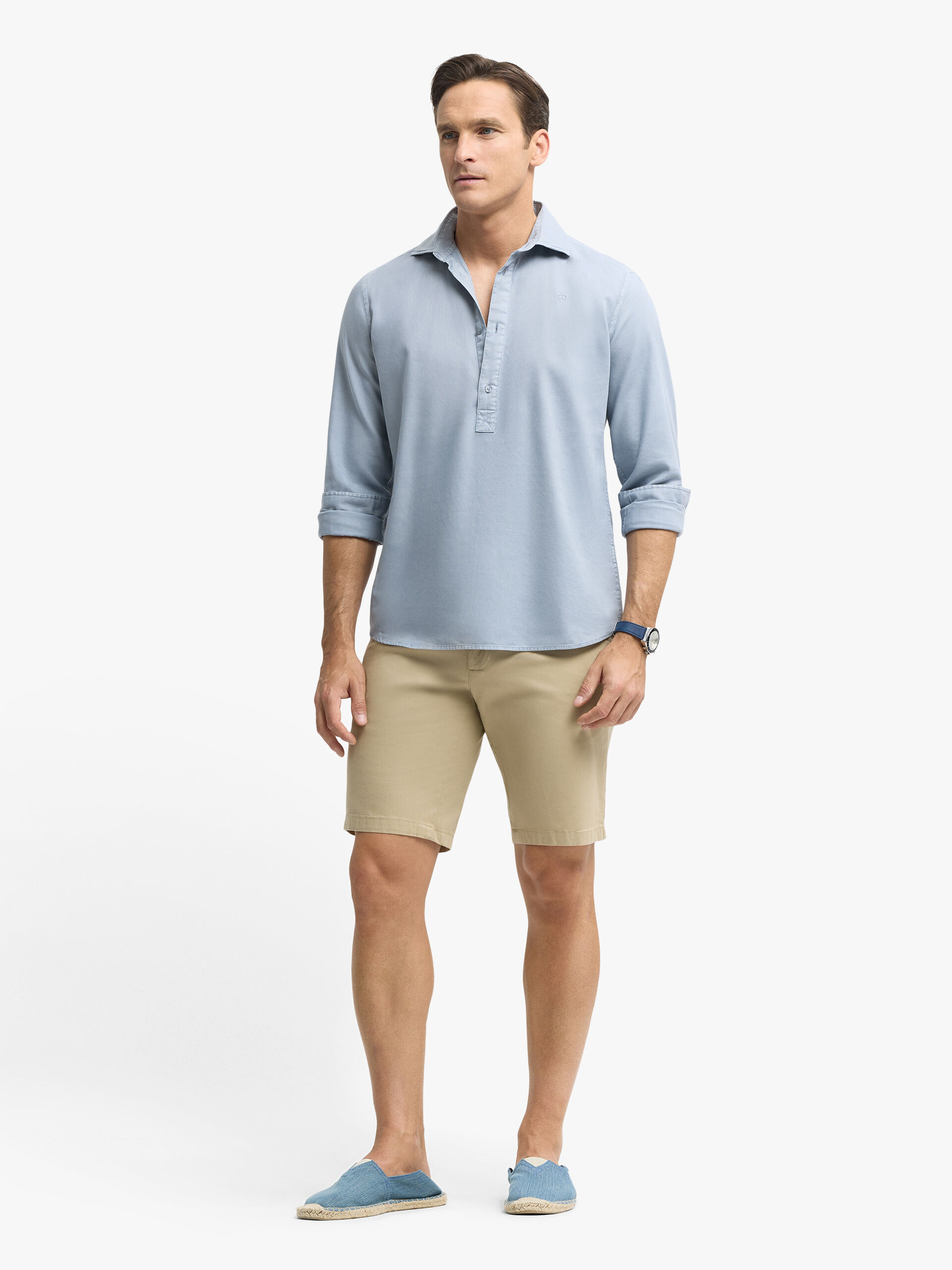 Camisa estilo polera lisa confeccionada en algodón. Cuenta con cuello de solapa, medio cierre central de hasta cuatro botones, manga larga con puños simples y logo de la marca grabado en el frontal. Corte regular fit.