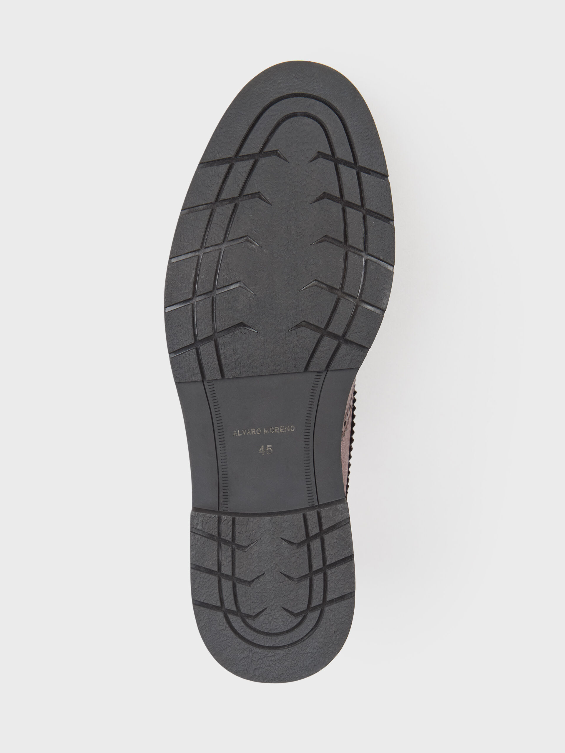 Zapatos confeccionados en serraje con detalles picados. Cuenta con cordones de hasta cuatro pasados, suela de goma antideslizante y punta redondeada.