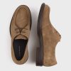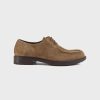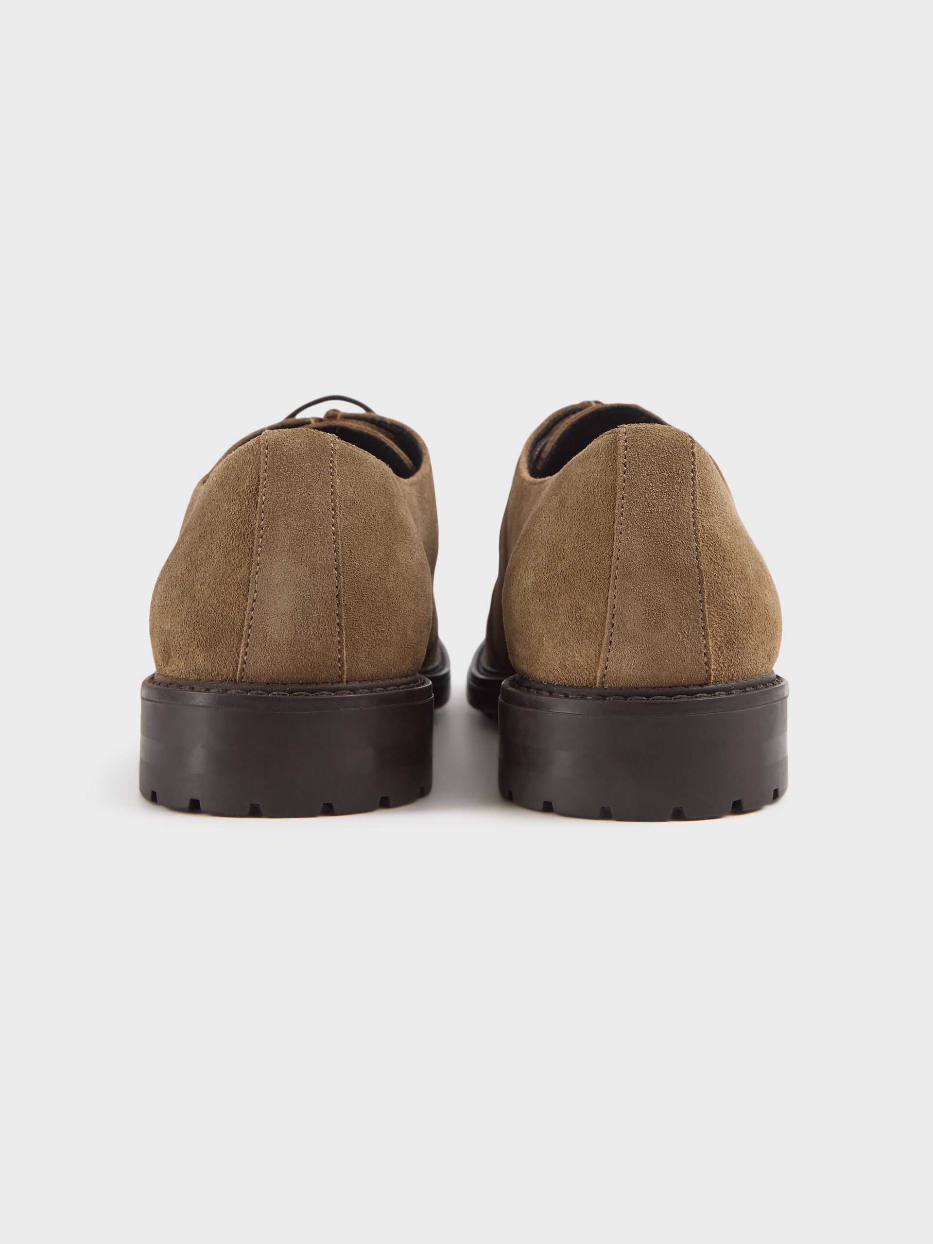 Zapatos confeccionados en piel de serraje con costura central en el frontal, puntera redondeada y cierre mediante cordones finos de dos pasados. Suela cosida al corte con acabado en goma antideslizante para mayor comodidad y agarre.