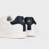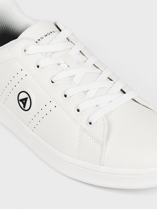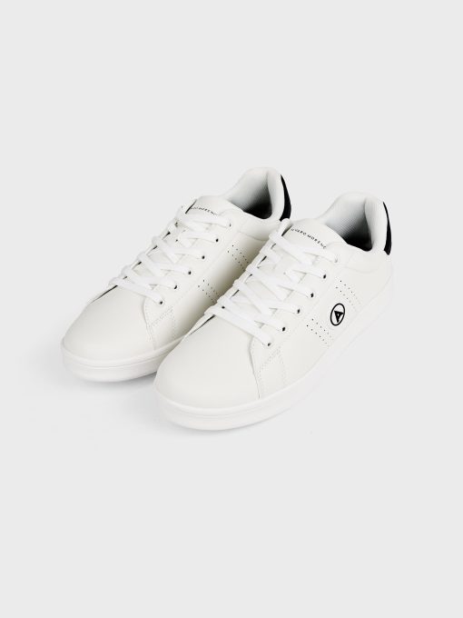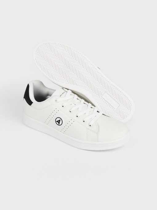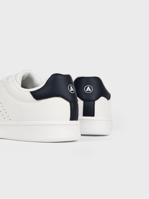 Sneakers deportivas con color blancas con detalle a contraste en el talón. Logo grabado en el lateral, lengüeta y talón. Cordones de hasta seis pasados, puntera redondeada y suela de goma.