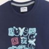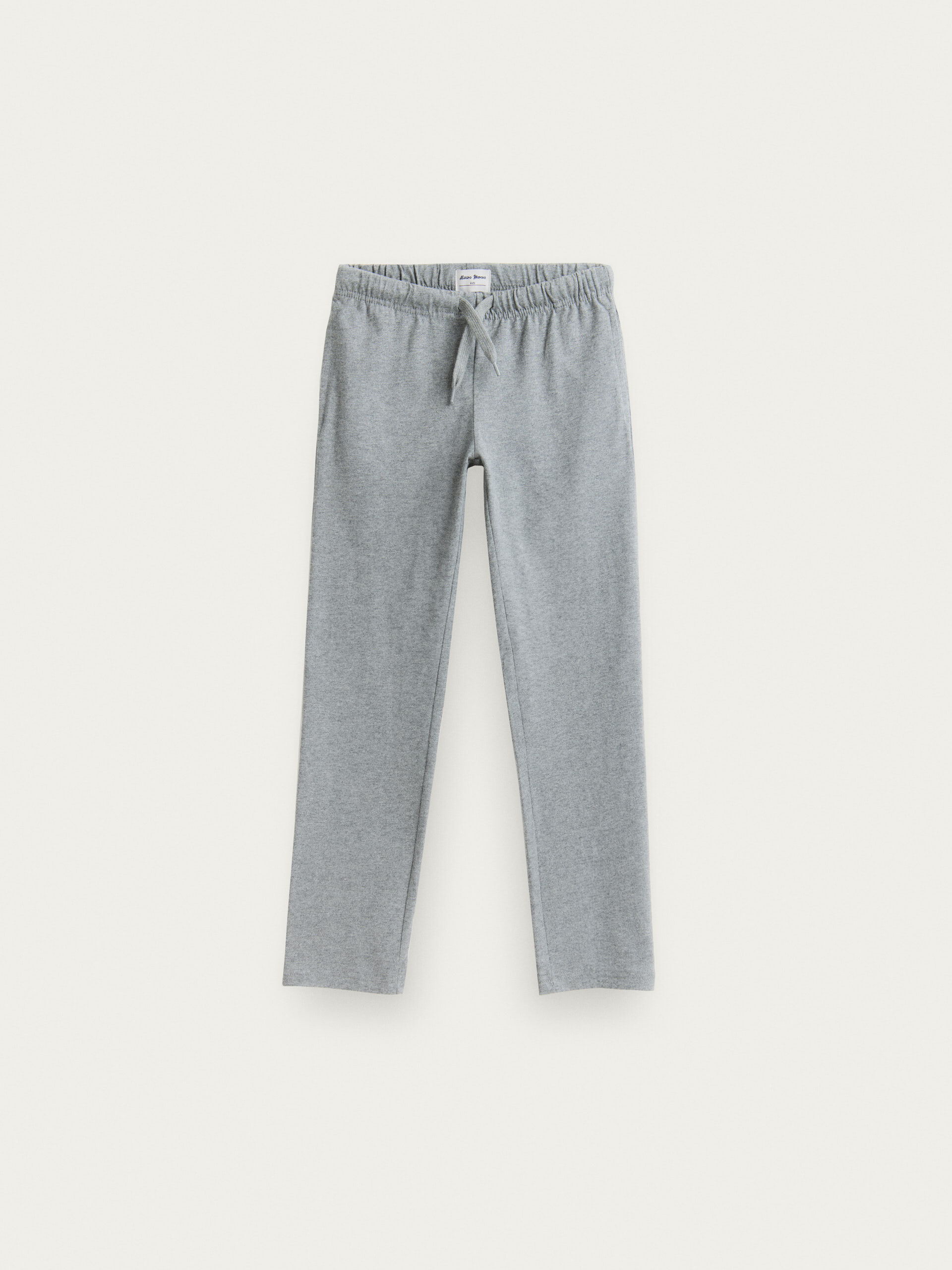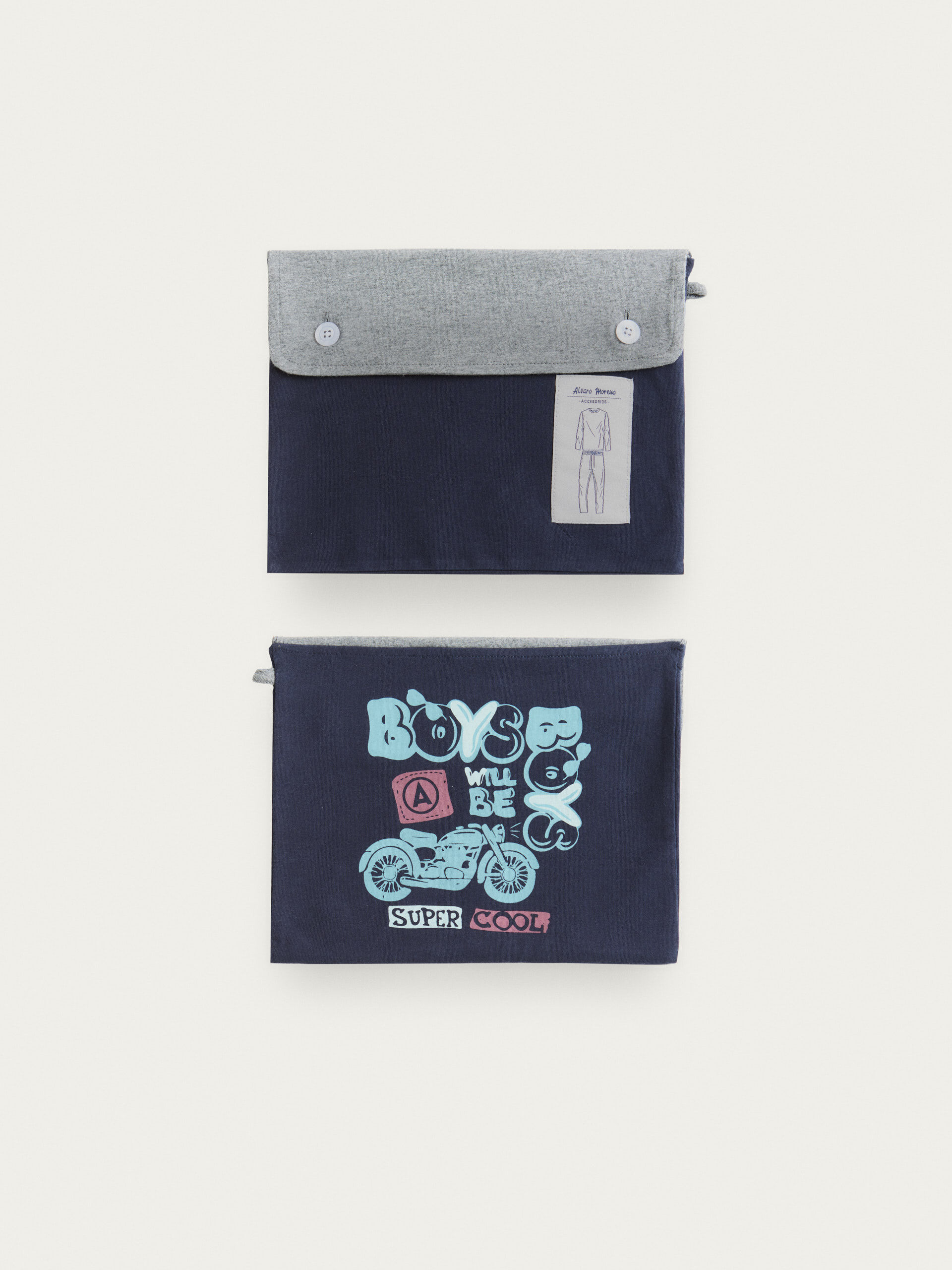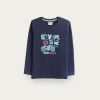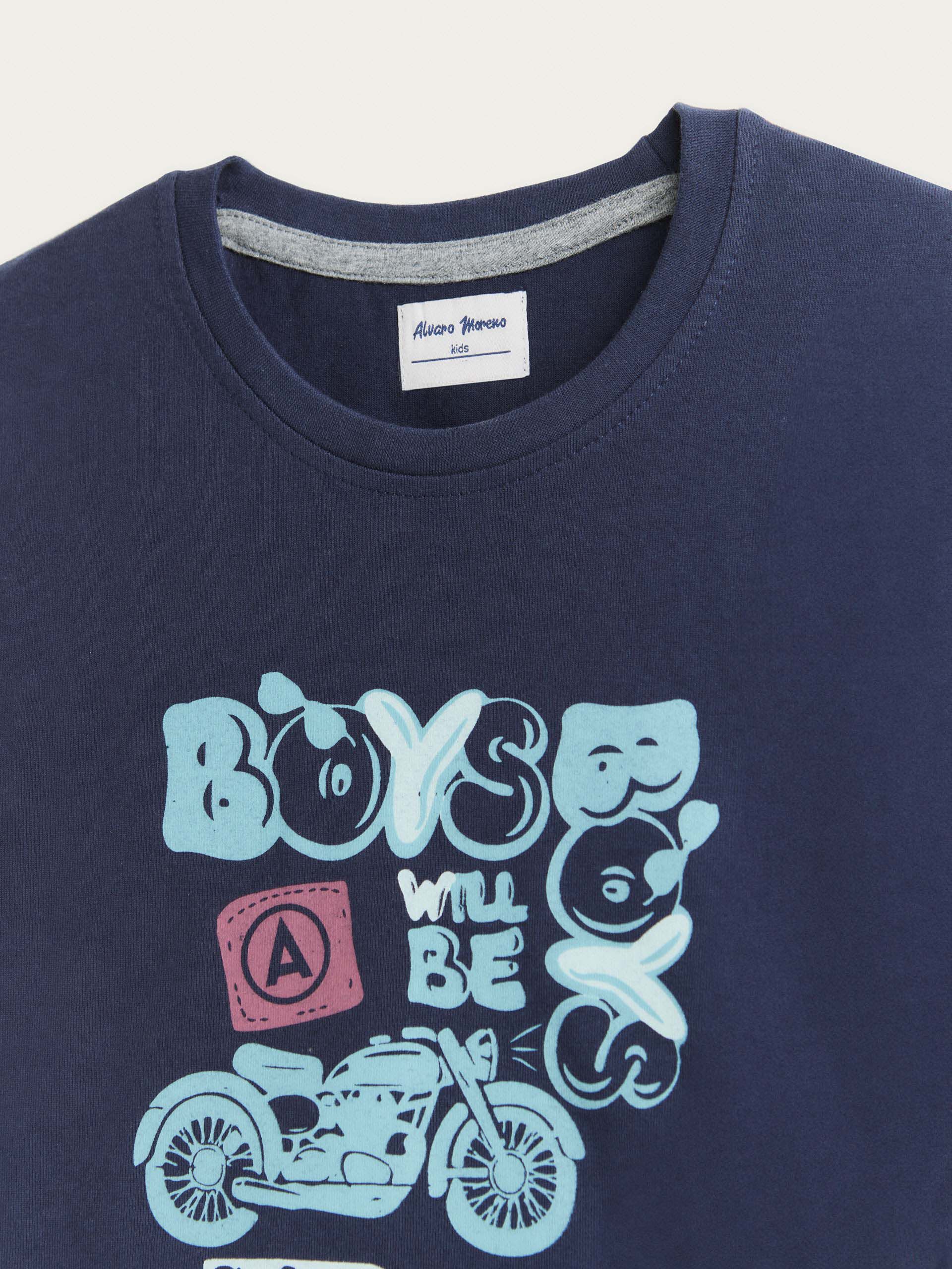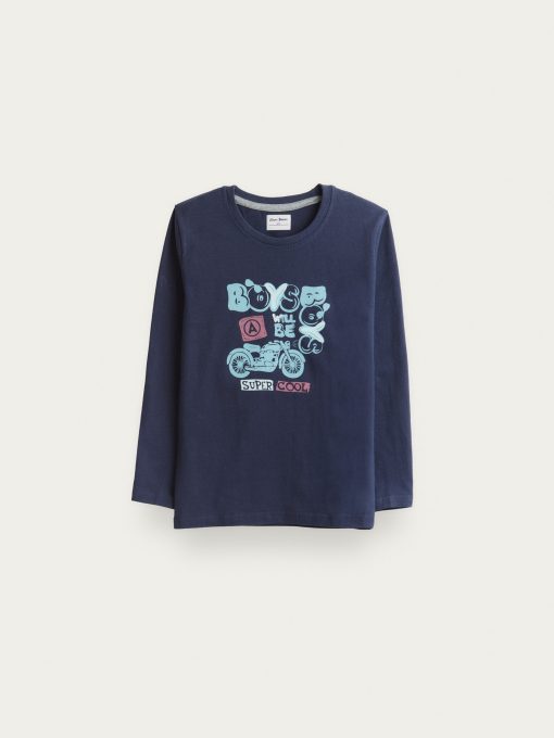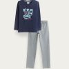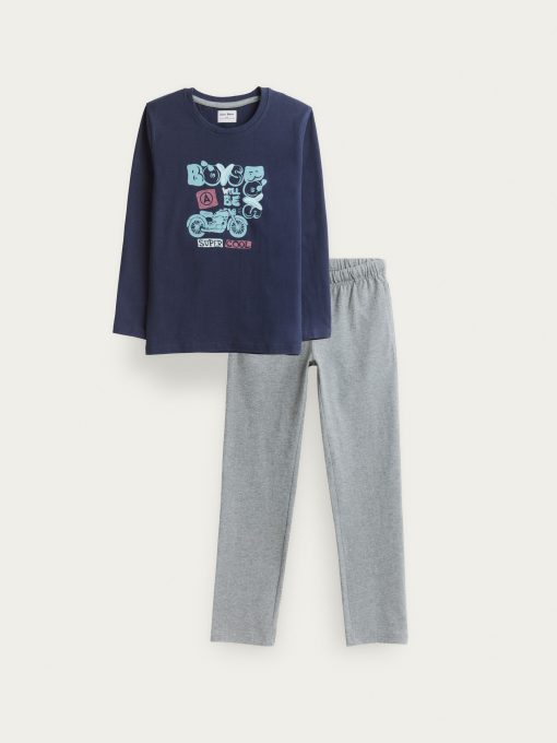 Pijama compuesto por dos piezas, superior e inferior. Parte superior camiseta de manga larga con cuello redondo y estampación personalizada en el frontal. Pantalón liso con cinturilla elástica y cordón ajustable.