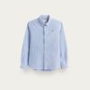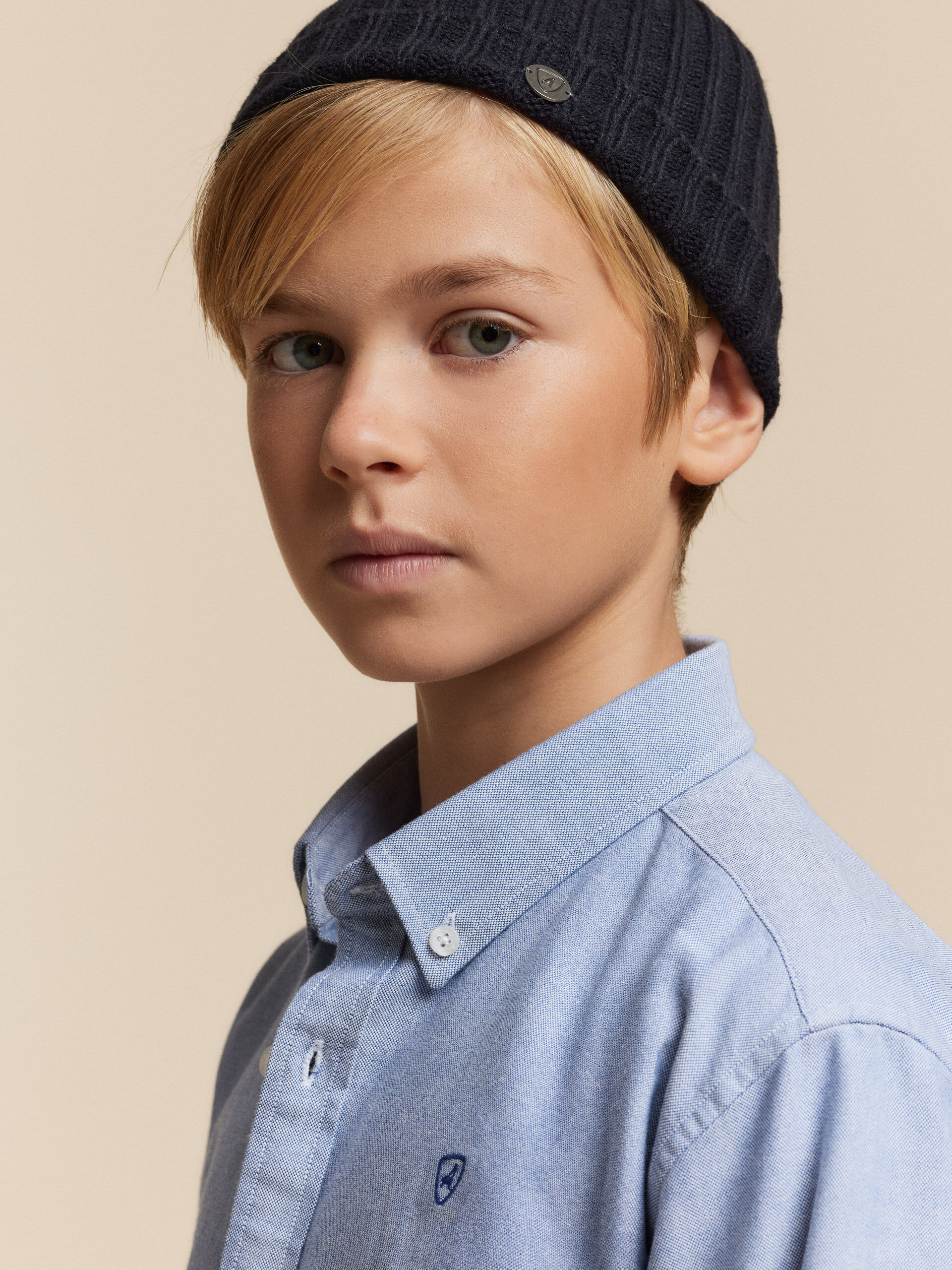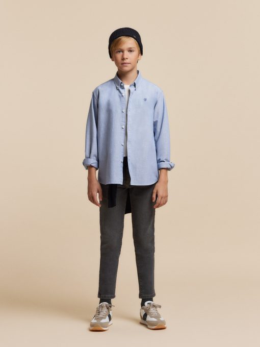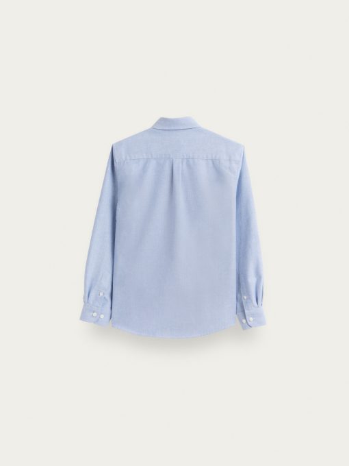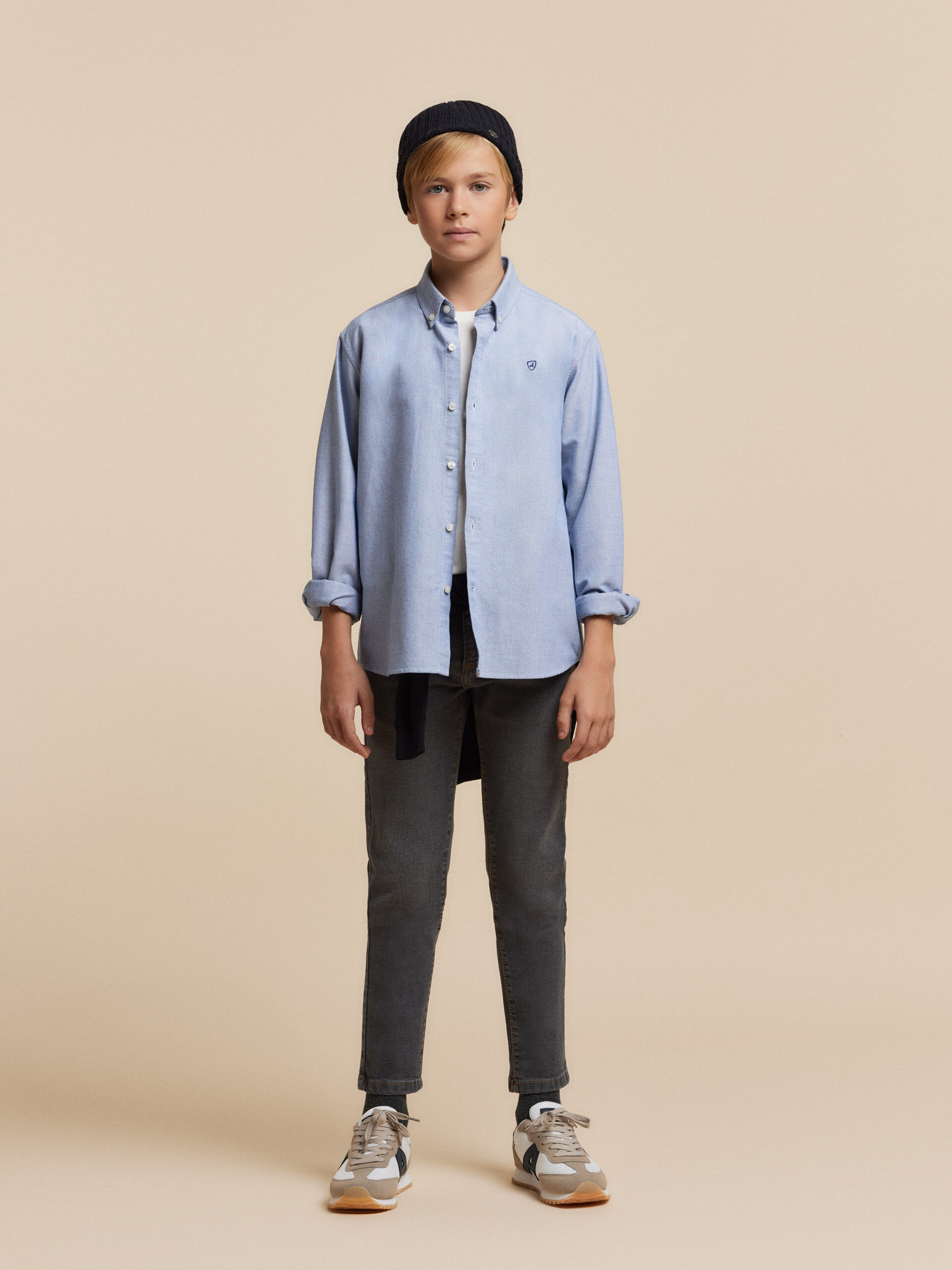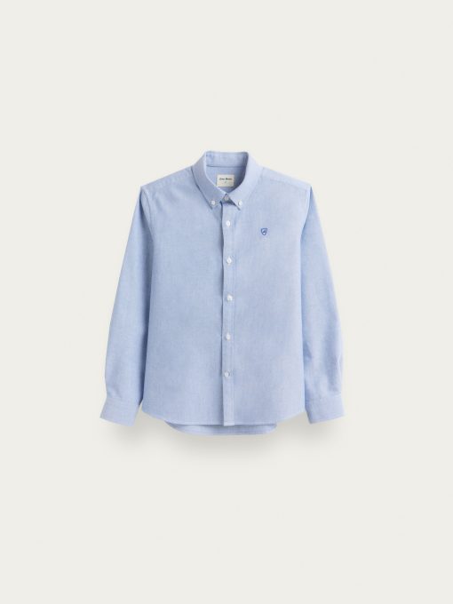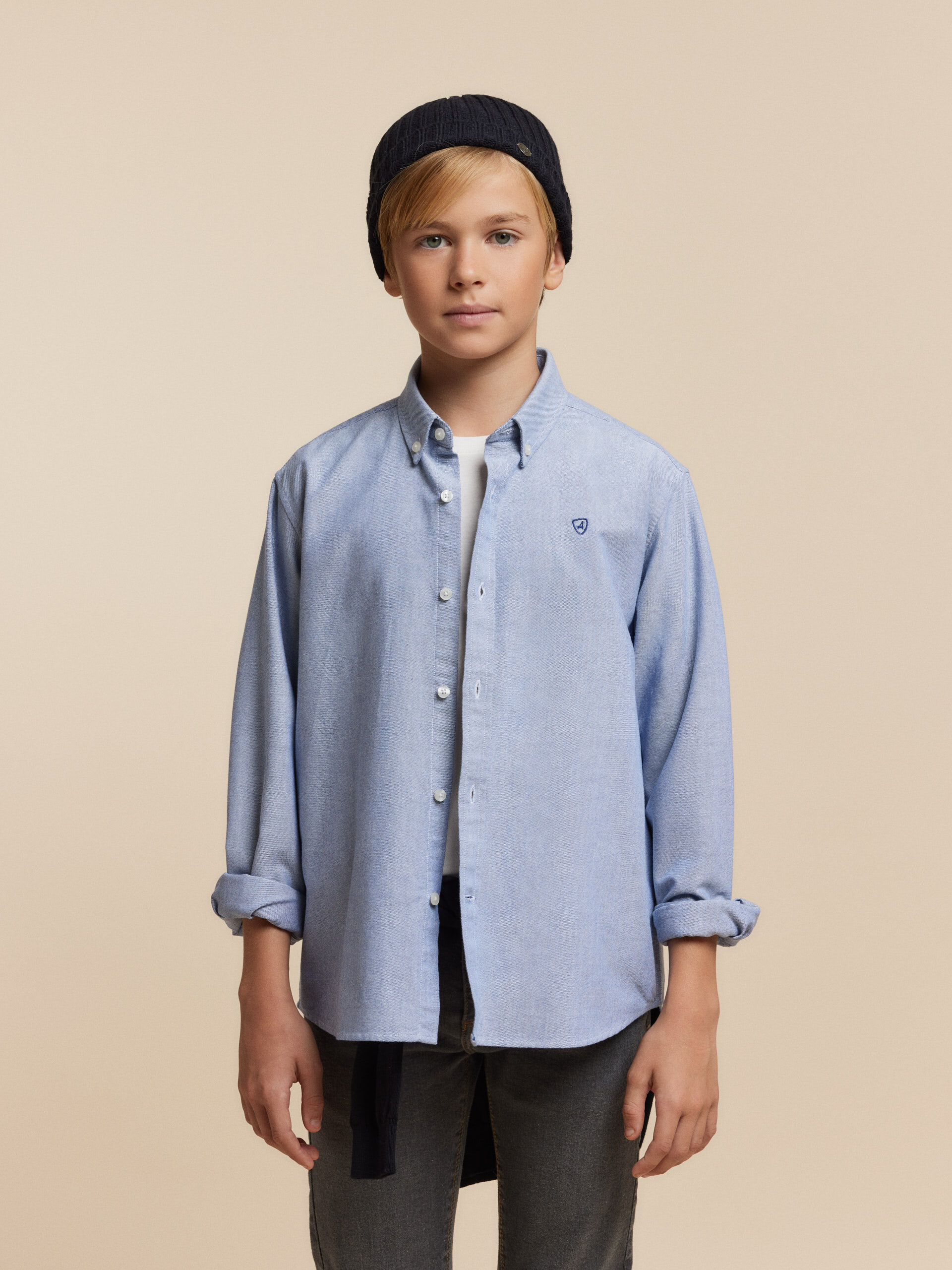 Camisa de corte regular fit con cuello clásico de botón, manga larga con puños simples y logo de la marca grabado en el frontal al tono.