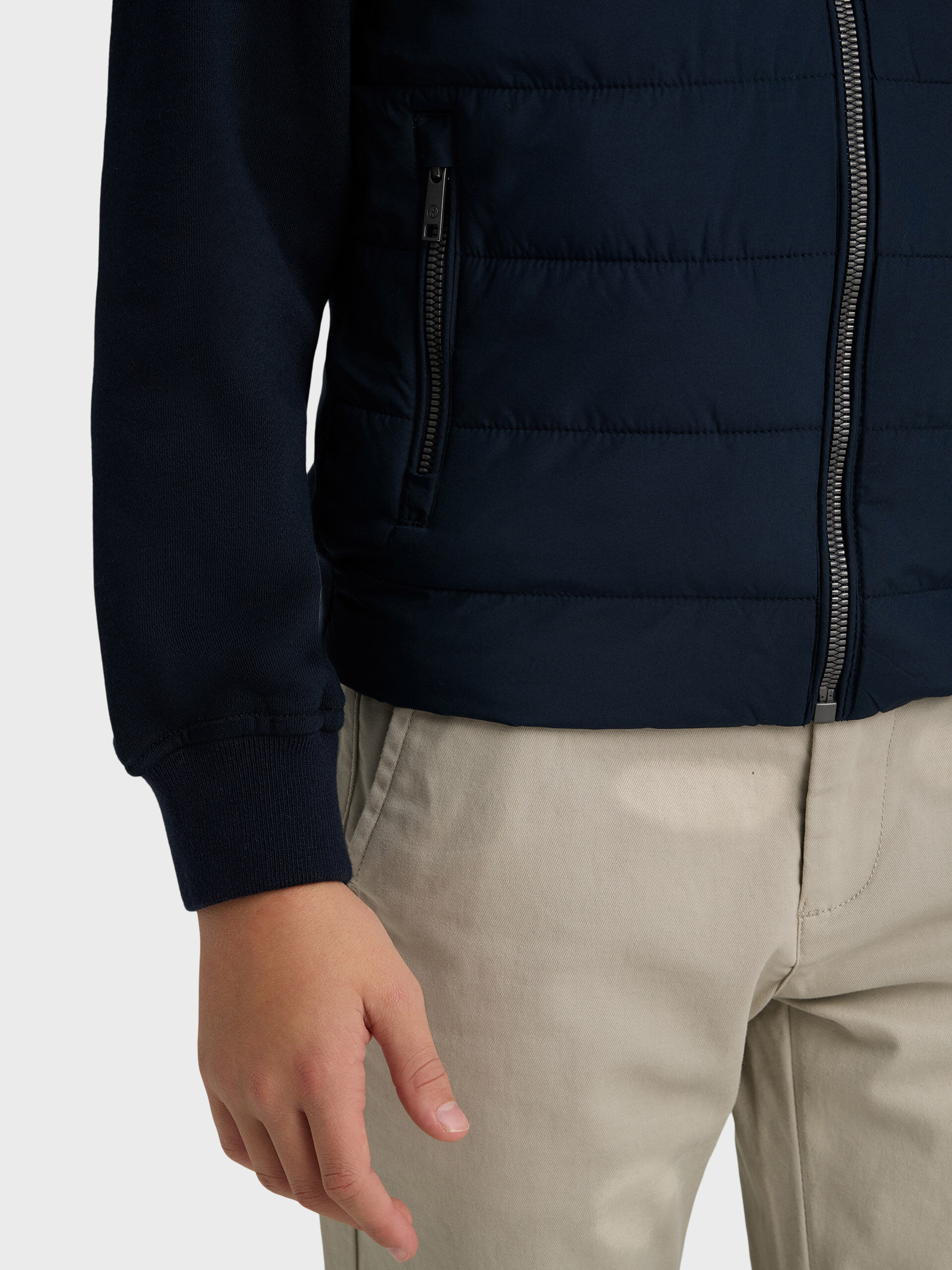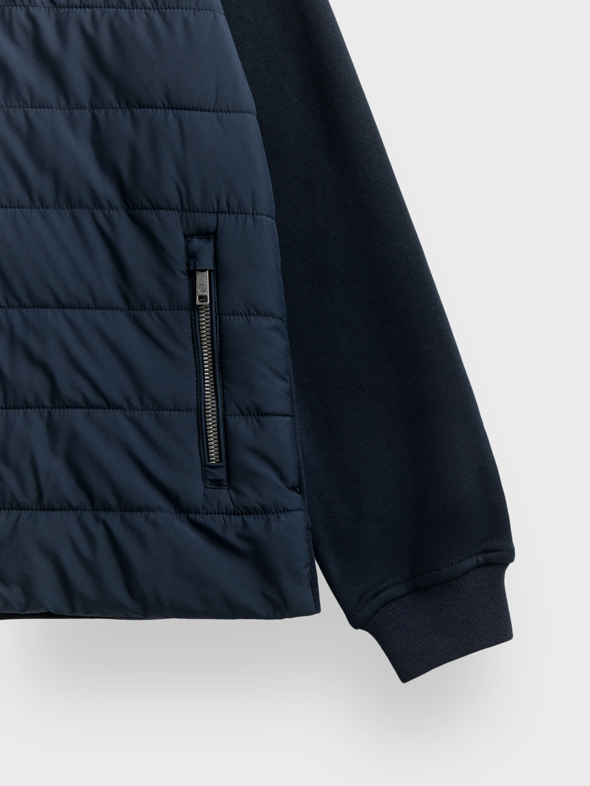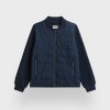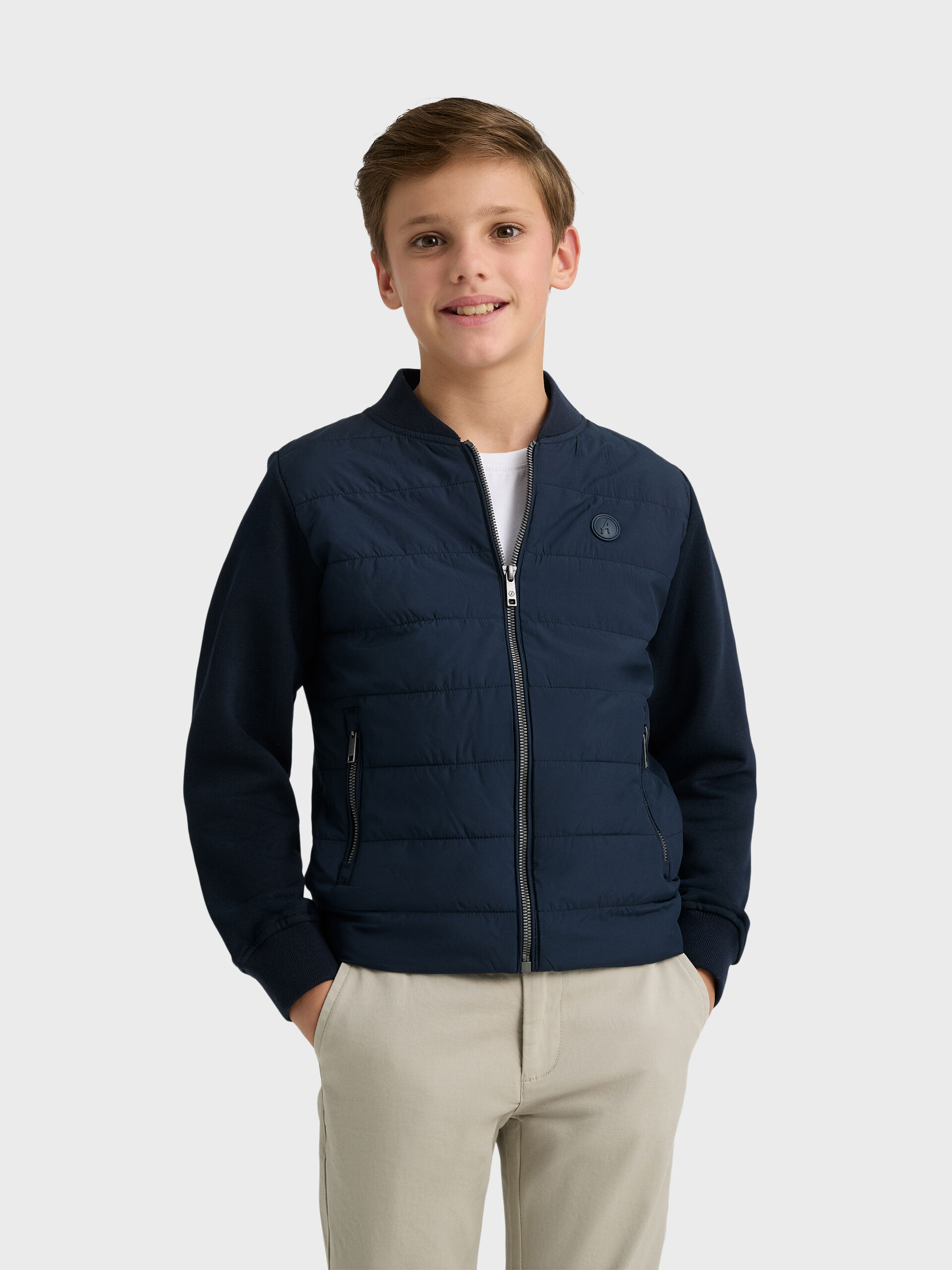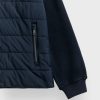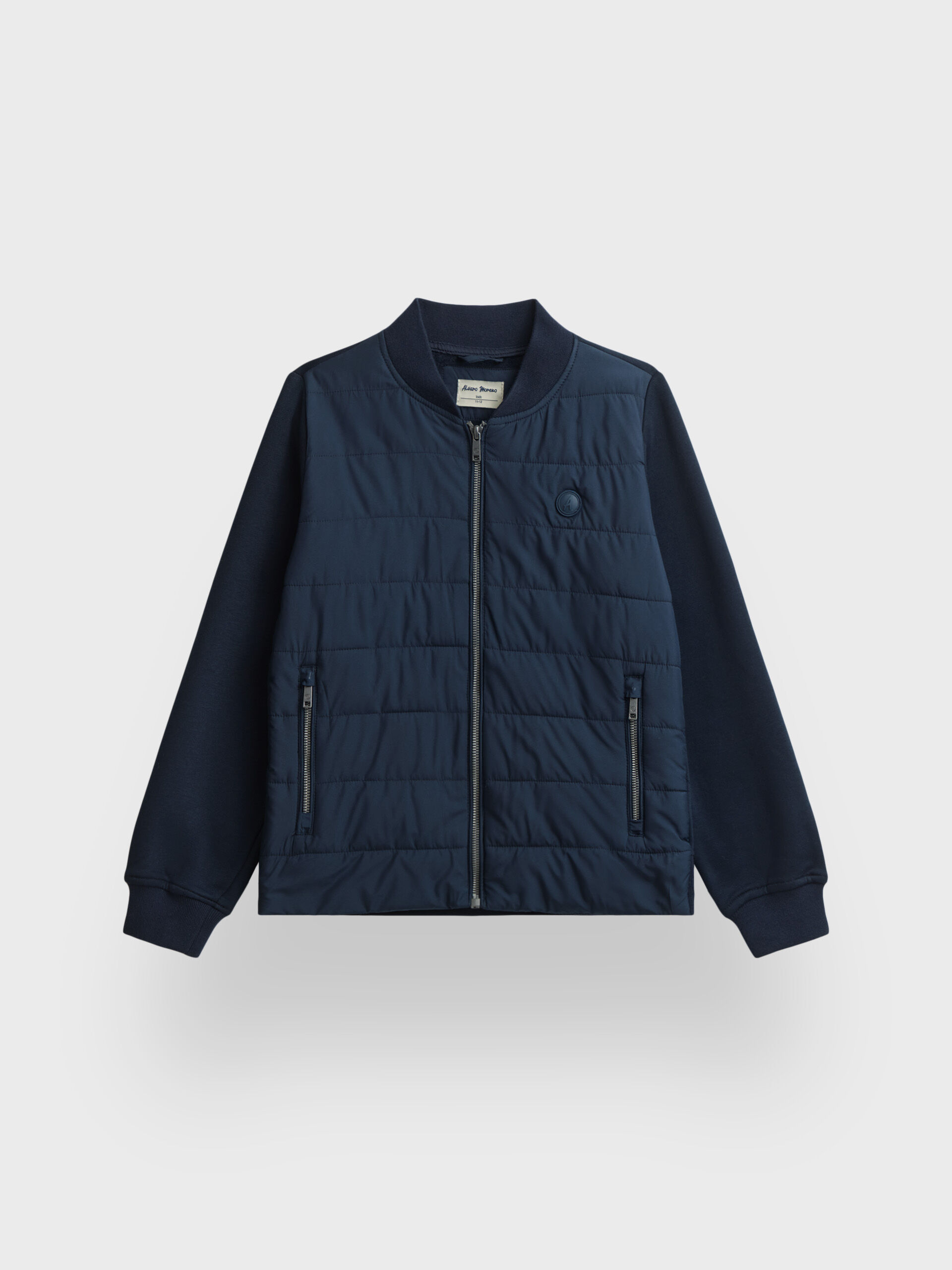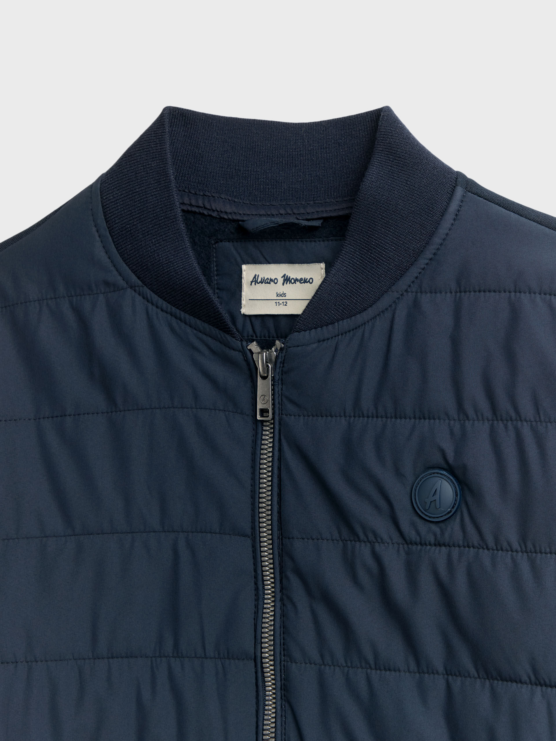 Cazadora estilo bomber de corte regular fit. Parte delantera acolchada. Cuello, mangas y espalda en tejido de punto. Cierre central mediante cremallera, dos bolsillos a la altura de la cintura y parche engomado con el logo de la marca.