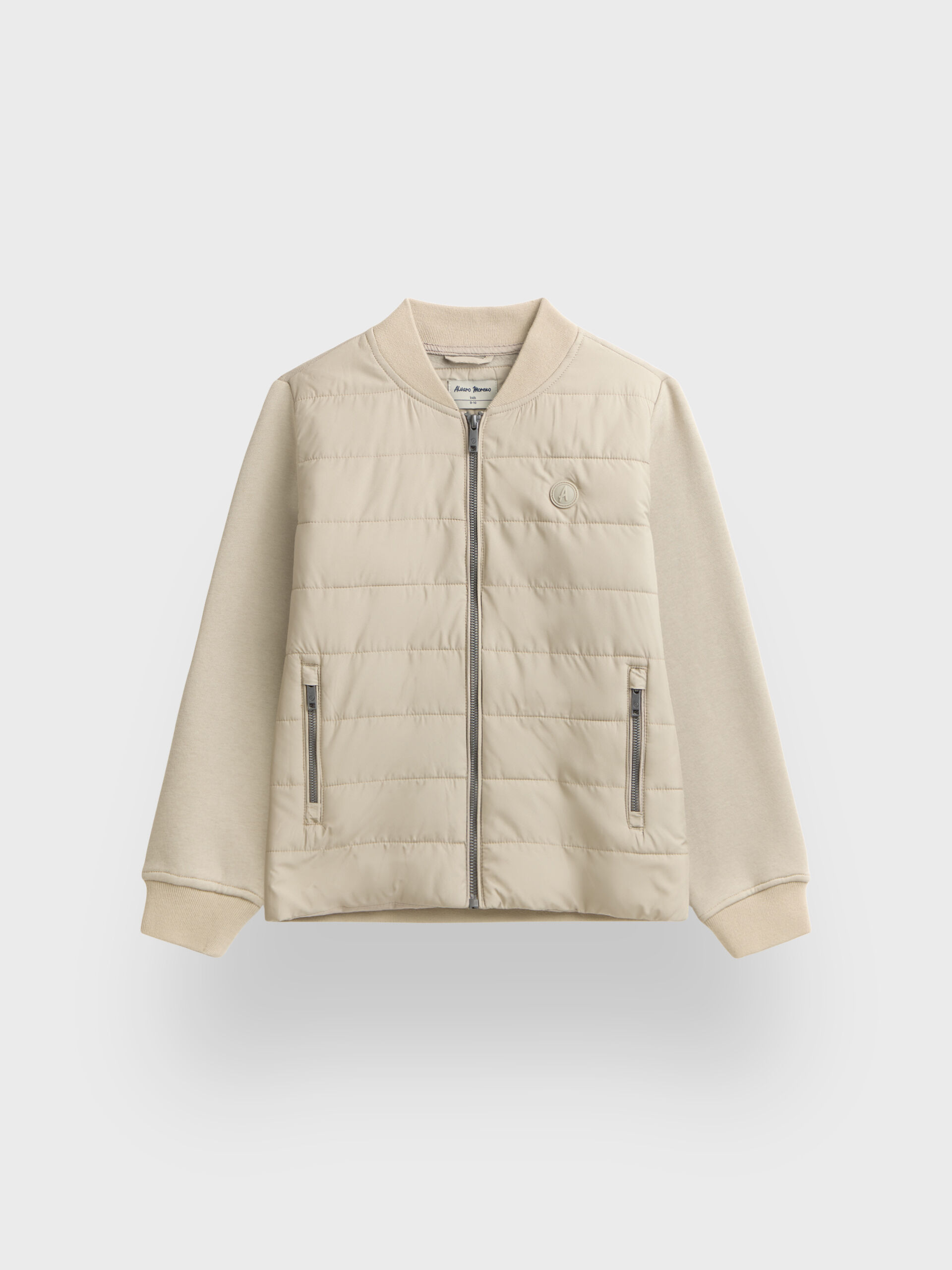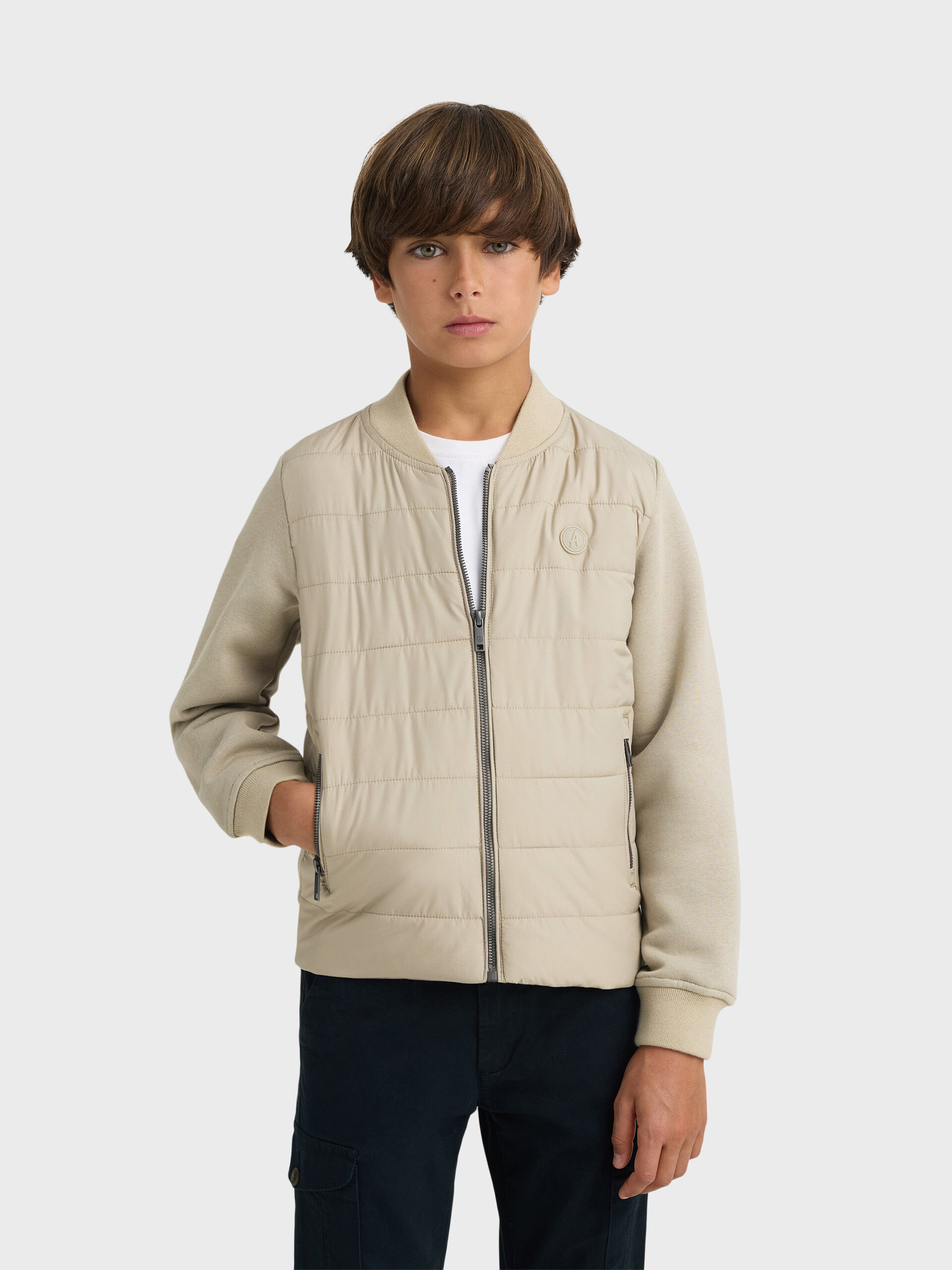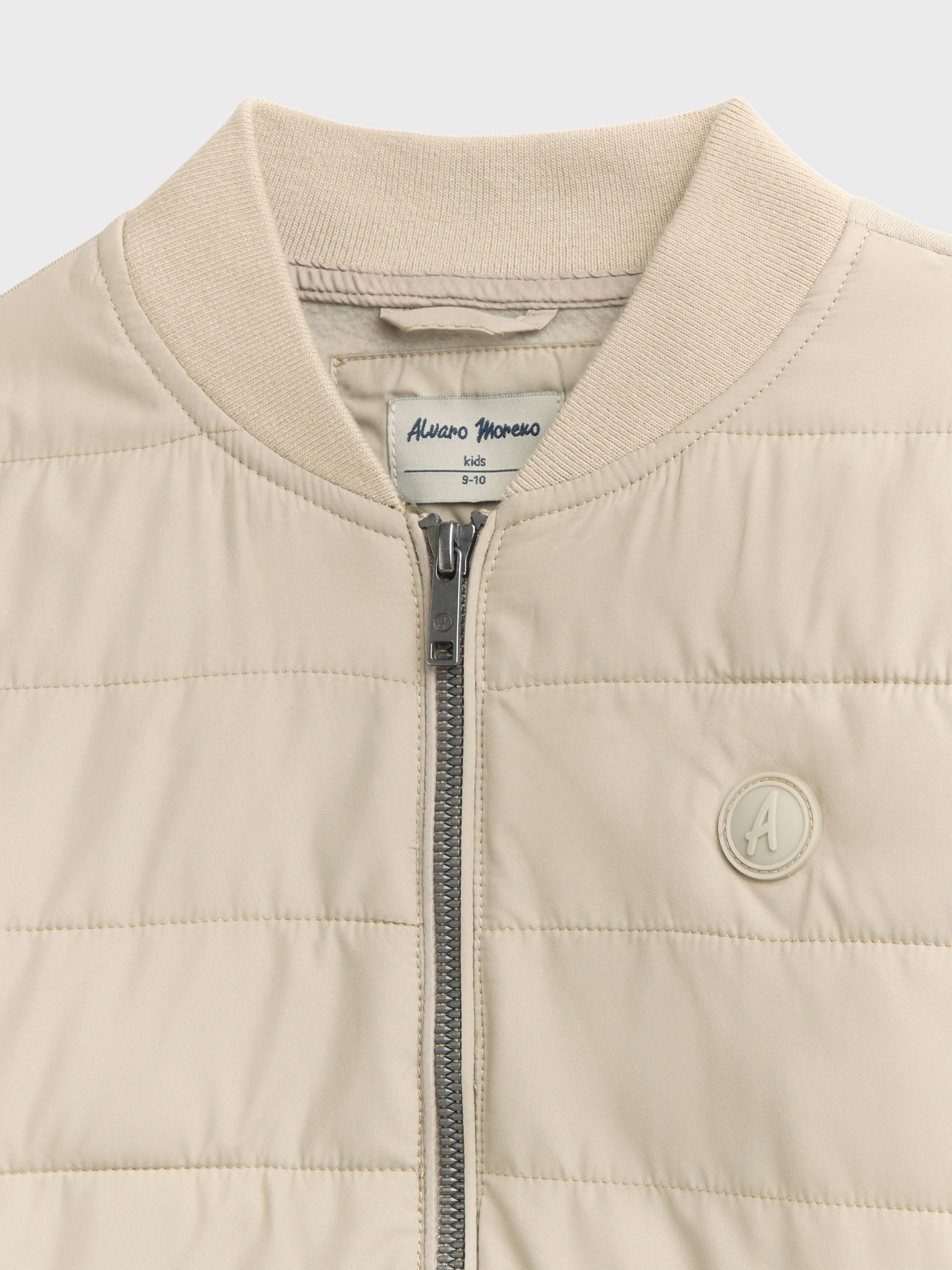 Cazadora estilo bomber de corte regular fit. Parte delantera acolchada. Cuello, mangas y espalda en tejido de punto. Cierre central mediante cremallera, dos bolsillos a la altura de la cintura y parche engomado con el logo de la marca.