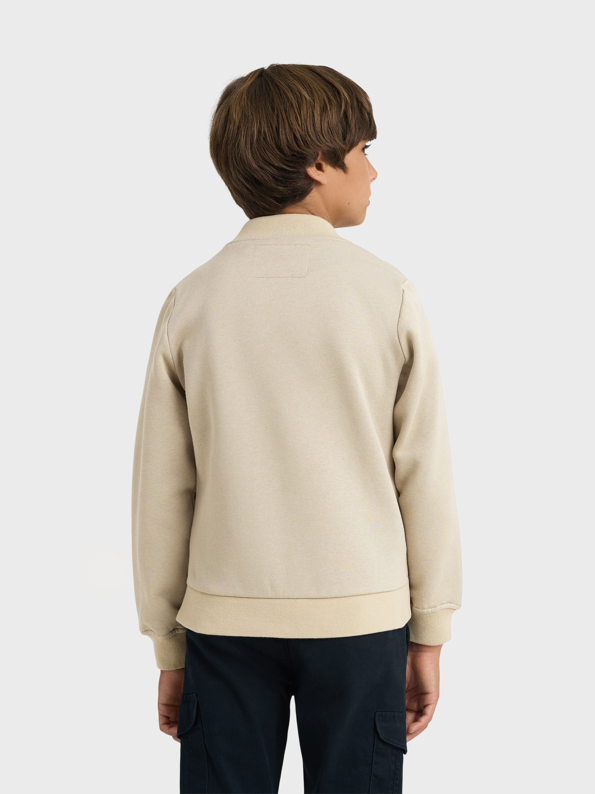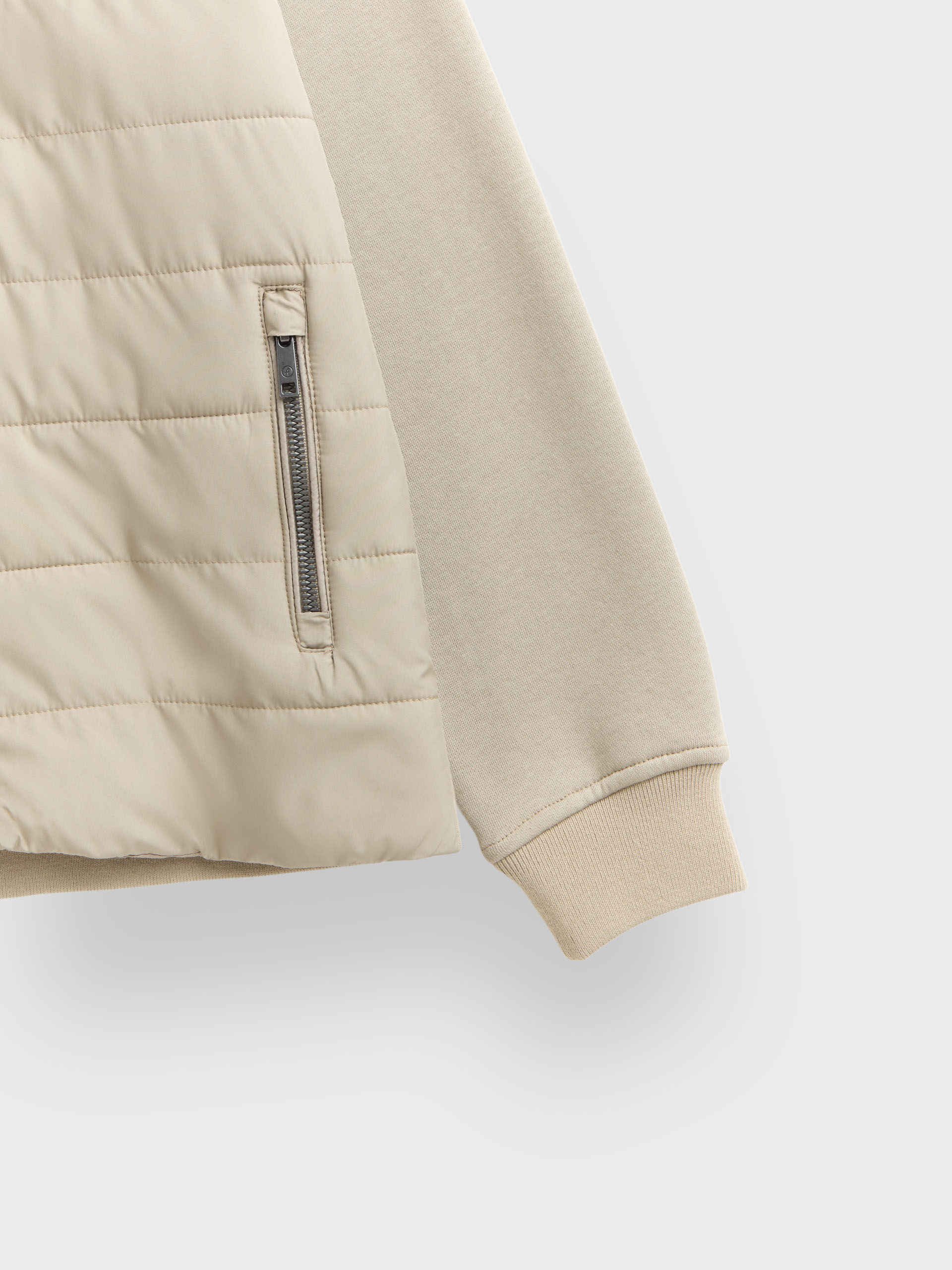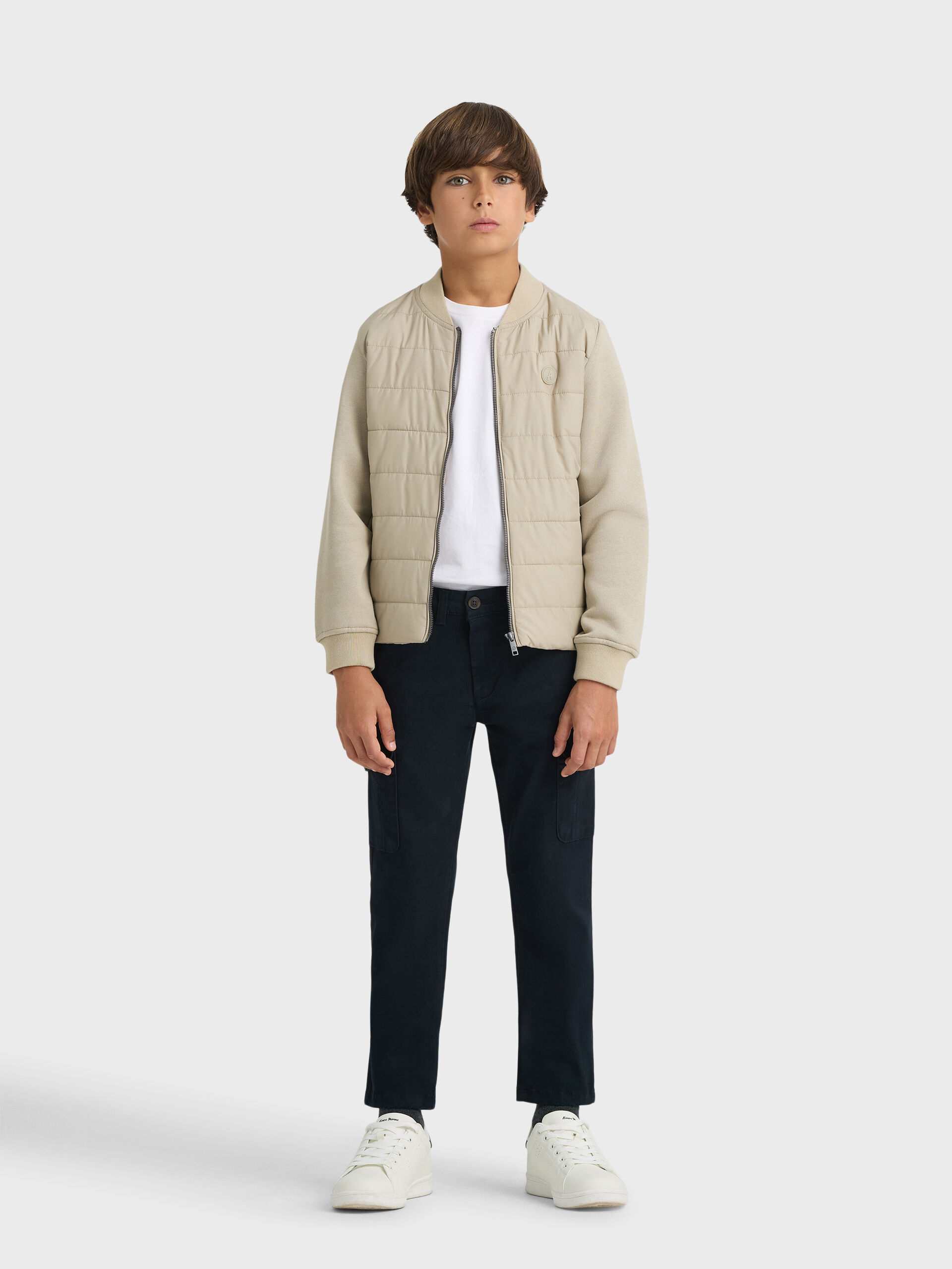 Cazadora estilo bomber de corte regular fit. Parte delantera acolchada. Cuello, mangas y espalda en tejido de punto. Cierre central mediante cremallera, dos bolsillos a la altura de la cintura y parche engomado con el logo de la marca.