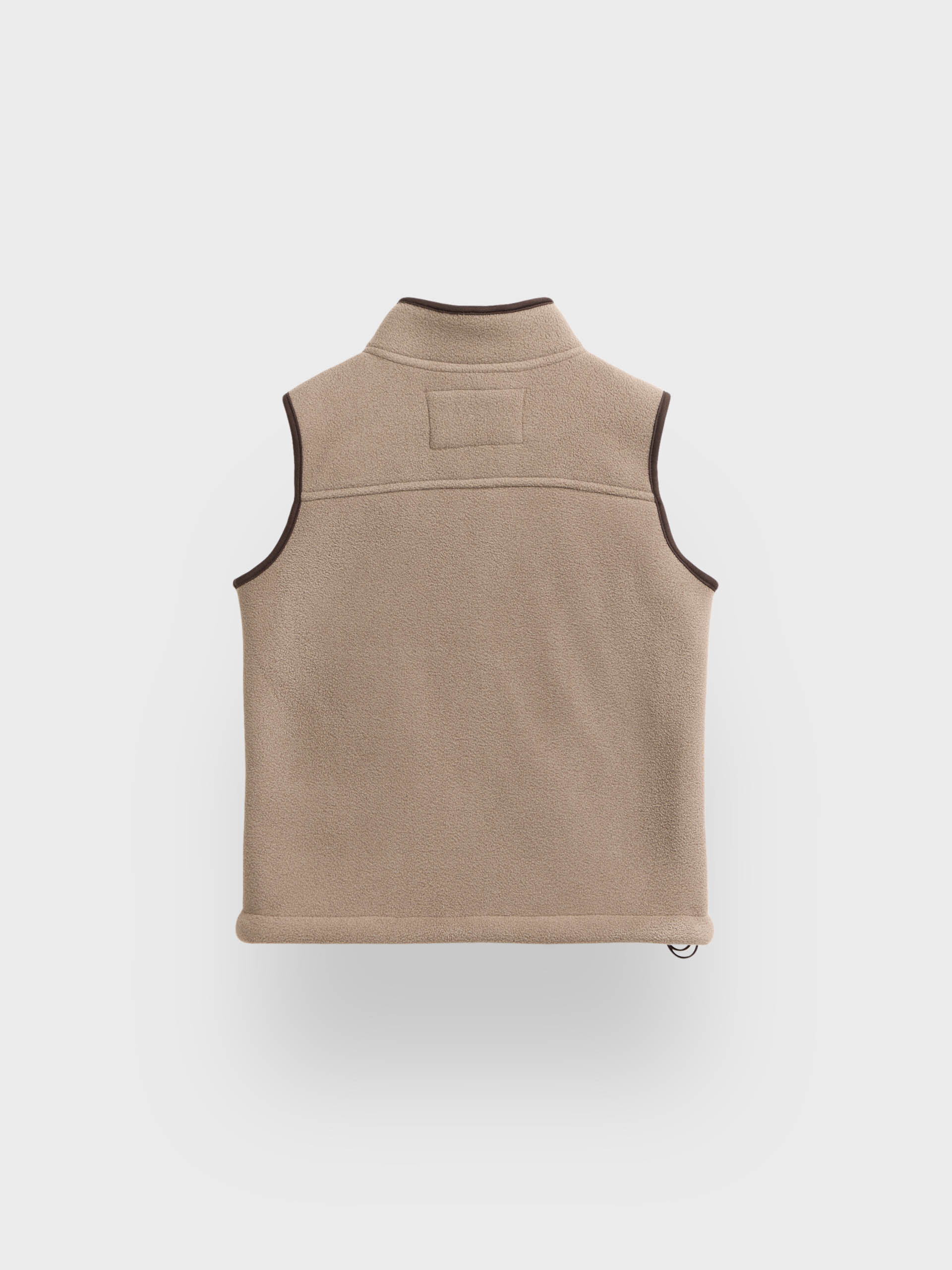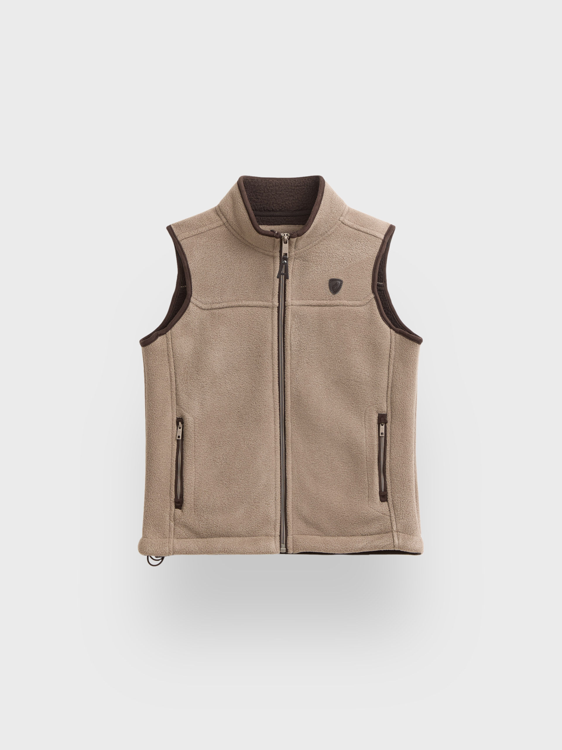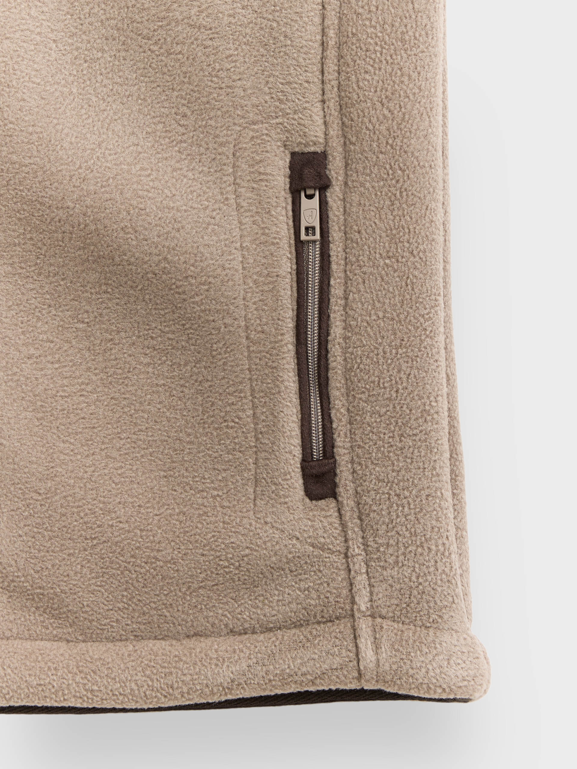Chaleco confeccionado en tejido avivado en antelina en su exterior y forrado en su interior en borreguillo. Cuenta con cierre central mediante cremallera personalizada, dos bolsillos en su exterior y logo grabado en su frontal. Corte regular fit.
