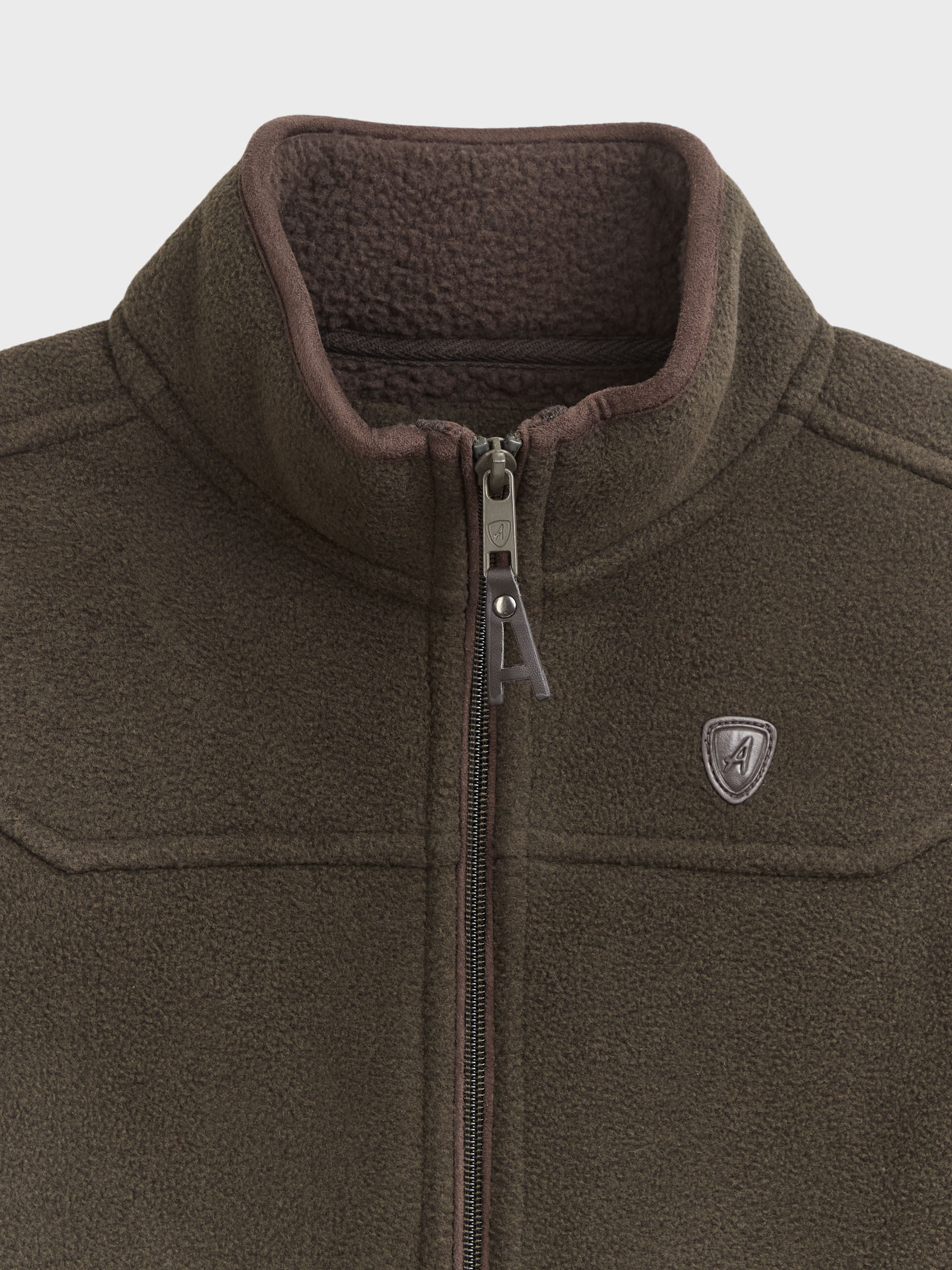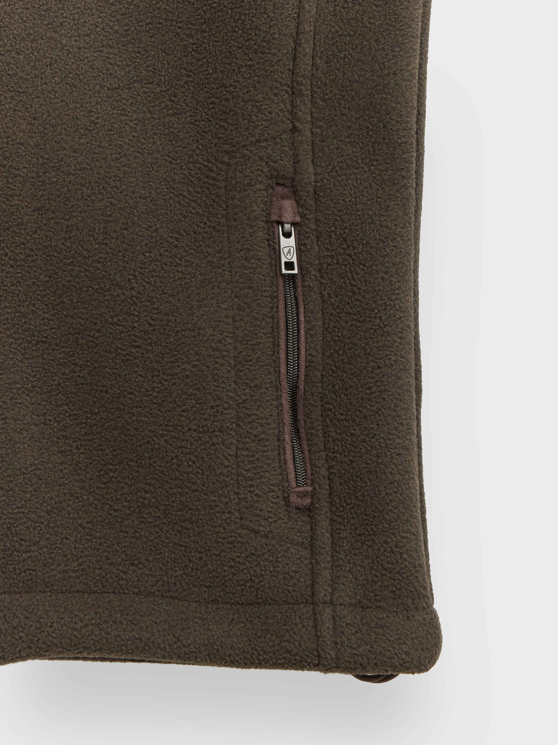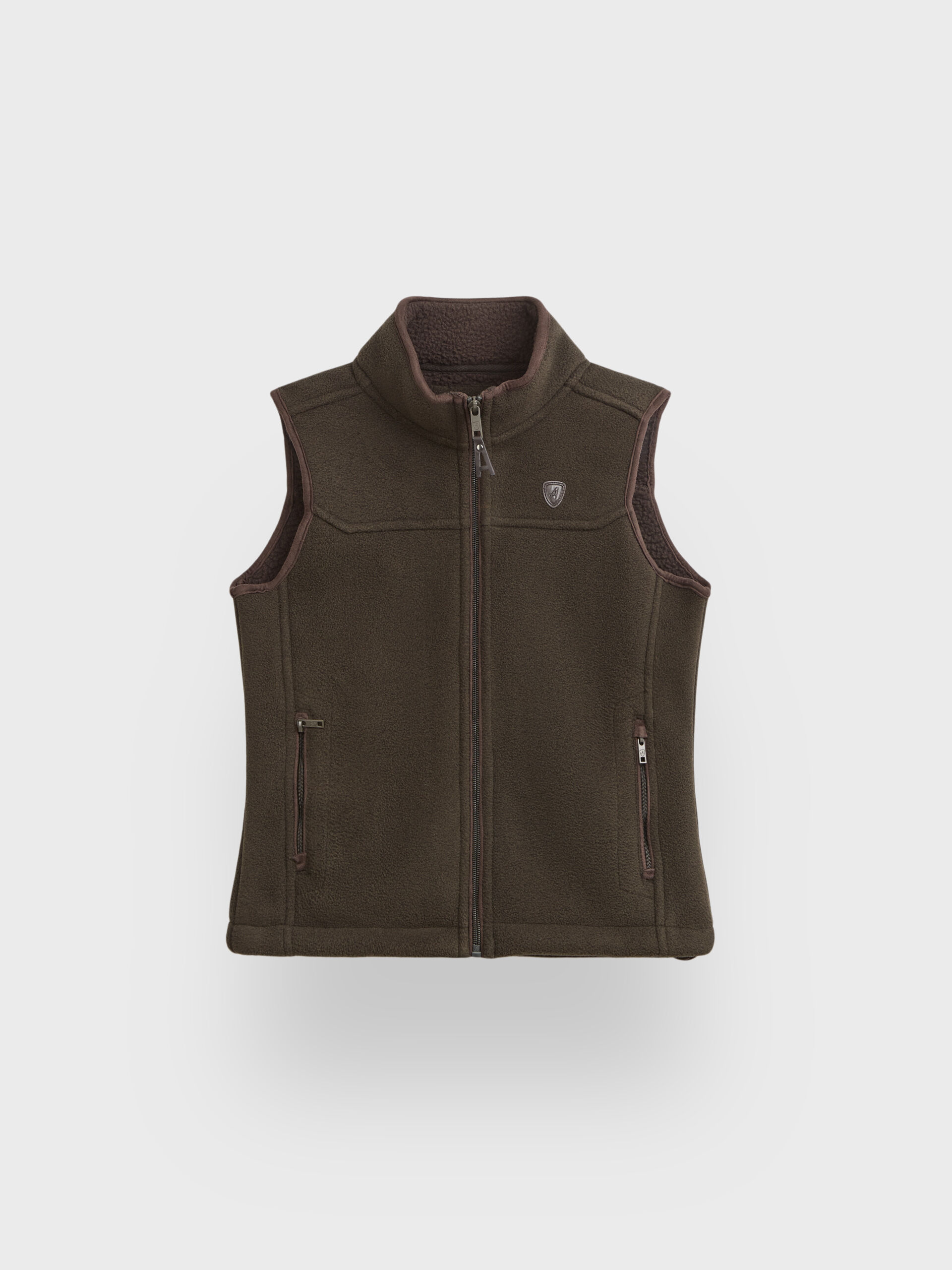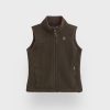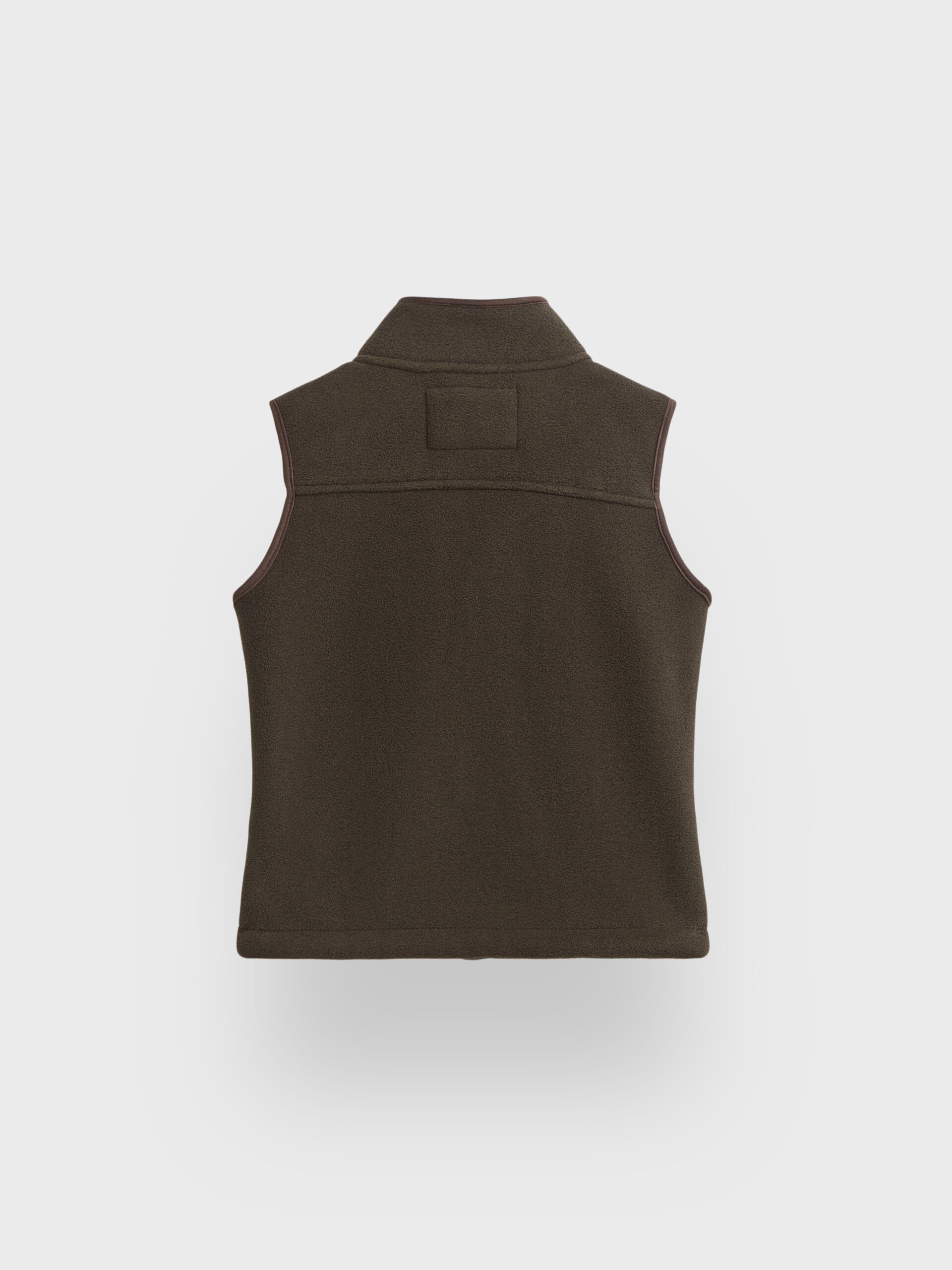 Chaleco confeccionado en tejido avivado en antelina en su exterior y forrado en su interior en borreguillo. Cuenta con cierre central mediante cremallera personalizada, dos bolsillos en su exterior y logo grabado en su frontal. Corte regular fit.